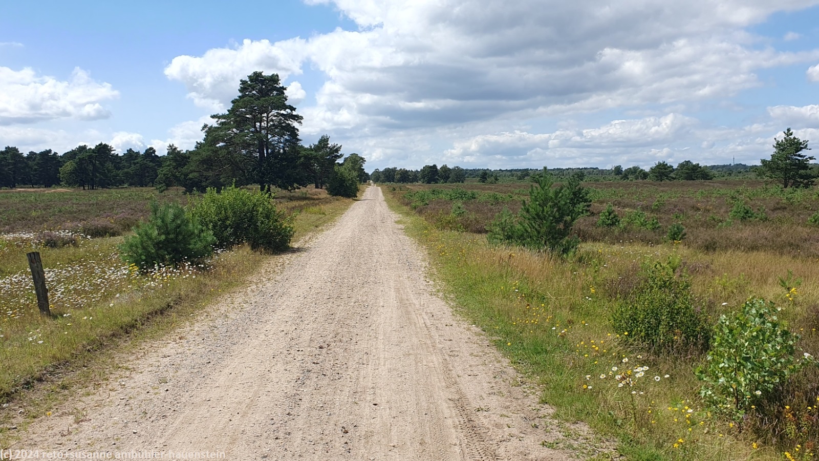 wir folgen den verschiedenen wanderwegen und kommen dabei erst an der freilichtbühne höpen und dann am sehr schönen haus mit dem atelier de bruycker vorbei. in der nähe sehen wir einen schäfer mit seiner herde. als einige schafe die richtung ändern, sorgt der fleissige hund dafür, dass sich die herde wieder vereint. wir überqueren erst die landstrasse L171 und folgen dann ein kurzes stück dem wanderweg richtung winterhof. nach einigen hundert metern erreichen wir die unterführung, durch welche wir auf die andere seite der bahnlinie gelangen. wenig später sind wir im naturschutzgebiet lüneburger heide. das wetter wird zusehends freundlicher mit längeren sonnigen abschnitten. wir wandern durch eine flache, aber sehr schöne landschaft. neben dem wanderweg hat es eine spur für pferdewagen. uns scheint, dass sich der wald immer mehr ausdehnt. in manchen heideflächen wachsen kleine nadelbäume. es gibt aber auch bereiche ohne solche bäumchen. wir vermuten, es hängt von der beschaffenheit des bodens ab, ob bäume wachsen können oder nicht. wir folgen einem wanderwegs südwärts bis zur alten landstrasse. dort führt ein pfad neben der strasse westwärts. nach etwas mehr als einem kilometer schwenken wir wieder richtung süden und erreichen gegen 13:30 uhr den kleinen sylvestersee. bis hier waren wir ziemlich alleine unterwegs, aber als wir uns auf eine der bänke am ufer setzen, erhalten wir bald gesellschaft. trotzdem sind wir erstaunt, wie wenig leute hier unterwegs sind. wir geniessen unsere brote.