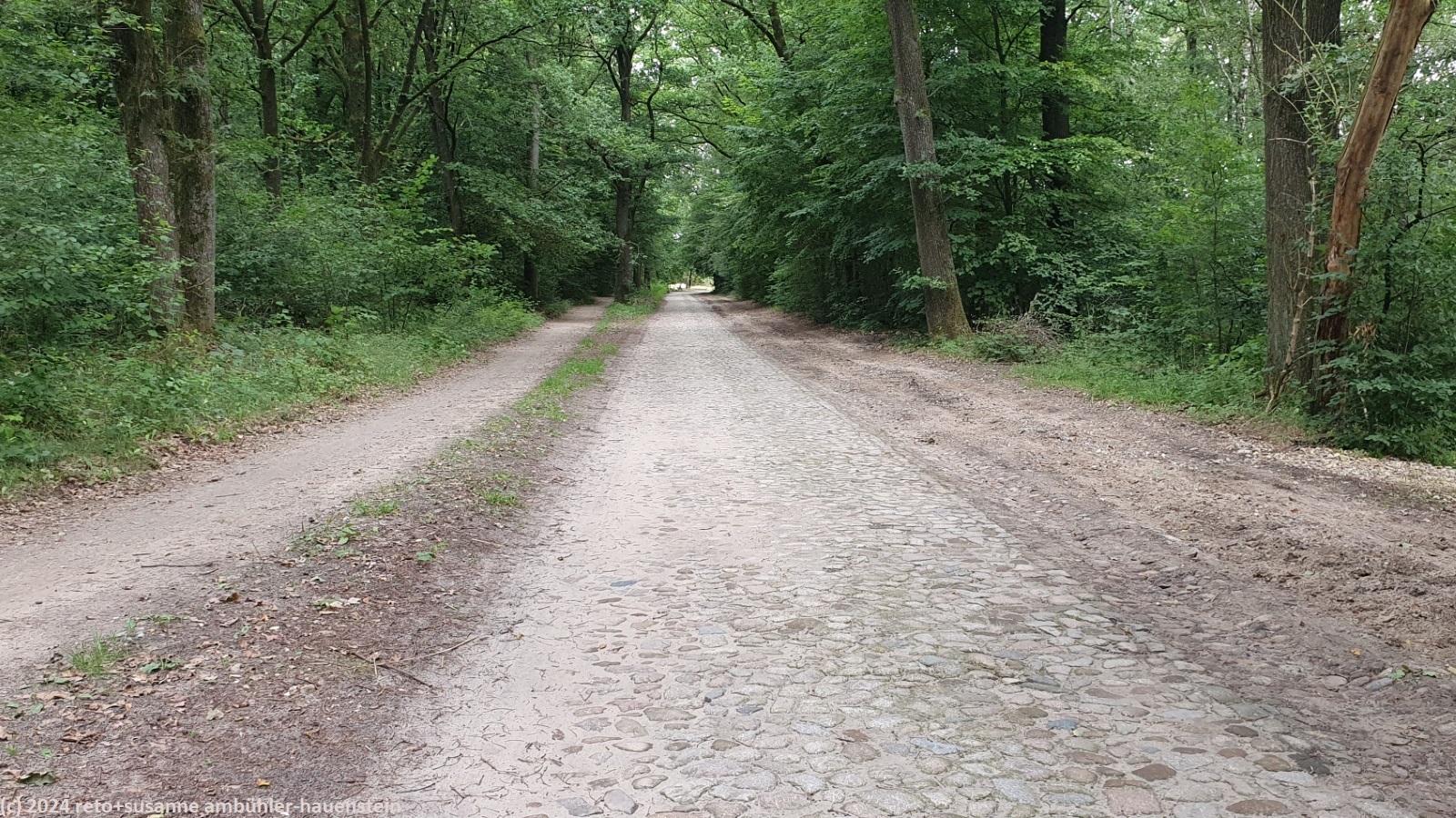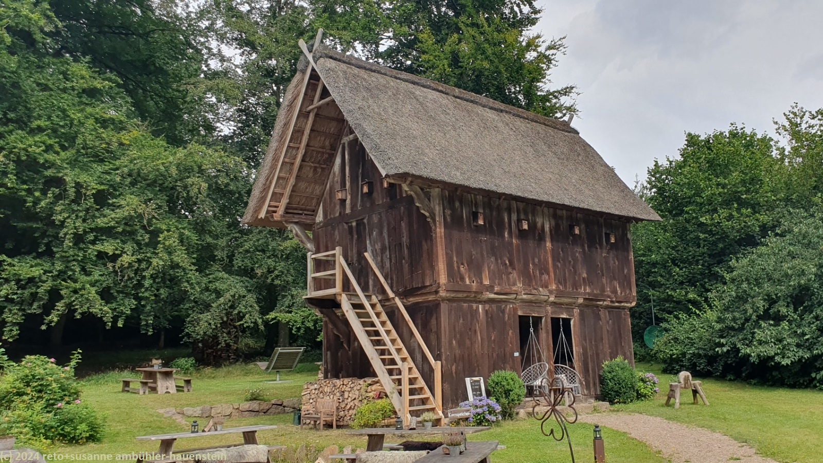 als wir um 08:30 uhr aufstehen ist es bewölkt, nur im westen ist der himmel blau. während wir im freien frühstücken, ziehen die wolken ostwärts und schon bald wird es sonnig. um 10:15 uhr machen wir uns auf den weg nach oberhaverbeck, dem ausgangspunkt unserer heutigen rundwanderung. wir finden einen schattigen parkplatz sowie eine karte mit verschiedenen wanderwegen. wir wandern erst durch den ort und bewundern die zahlreichen fachwerkhäuser. manche höfe wurden in hotels umgebaut. die nebengebäude bieten unterschiedliche unterkünfte und gruppenräume für verschiedene aktivitäten an. ausgangs dorf folgen wir einem weg durch eine graslandschaft. hier am rande des naturparkes wird noch landwirtschaft betrieben. bei niederhaverbeck wären wir beinahe der falschen strasse gefolgt, dank des navi bemerken wir den irrtum nach wenigen metern. nun folgen wir dem pfad richtung wilseder berg. die landschaft ist etwas hügliger als gestern und es hat auch mehr bäume. inzwischen sind wieder wolken aufgezogen, die temperatur ist daher sehr angenehm. kurz vor mittag stehen wir auf dem 169.2 meter hohen "berg". der "gipfel" ist kaum zu erkennen. wäre da nicht der markante stein, wir wüssten nicht genau, wo der höchste punkt ist. nun geht es ostwärts richtung wilsede. der pfad senkt sich ganz leicht. kurz vor dem ort picknicken wir auf einer bank mit blick auf ein schönes heidefeld. während wir unsere brote verzehren, beginnt es leicht zu regnen, aber nur für einige minuten.
