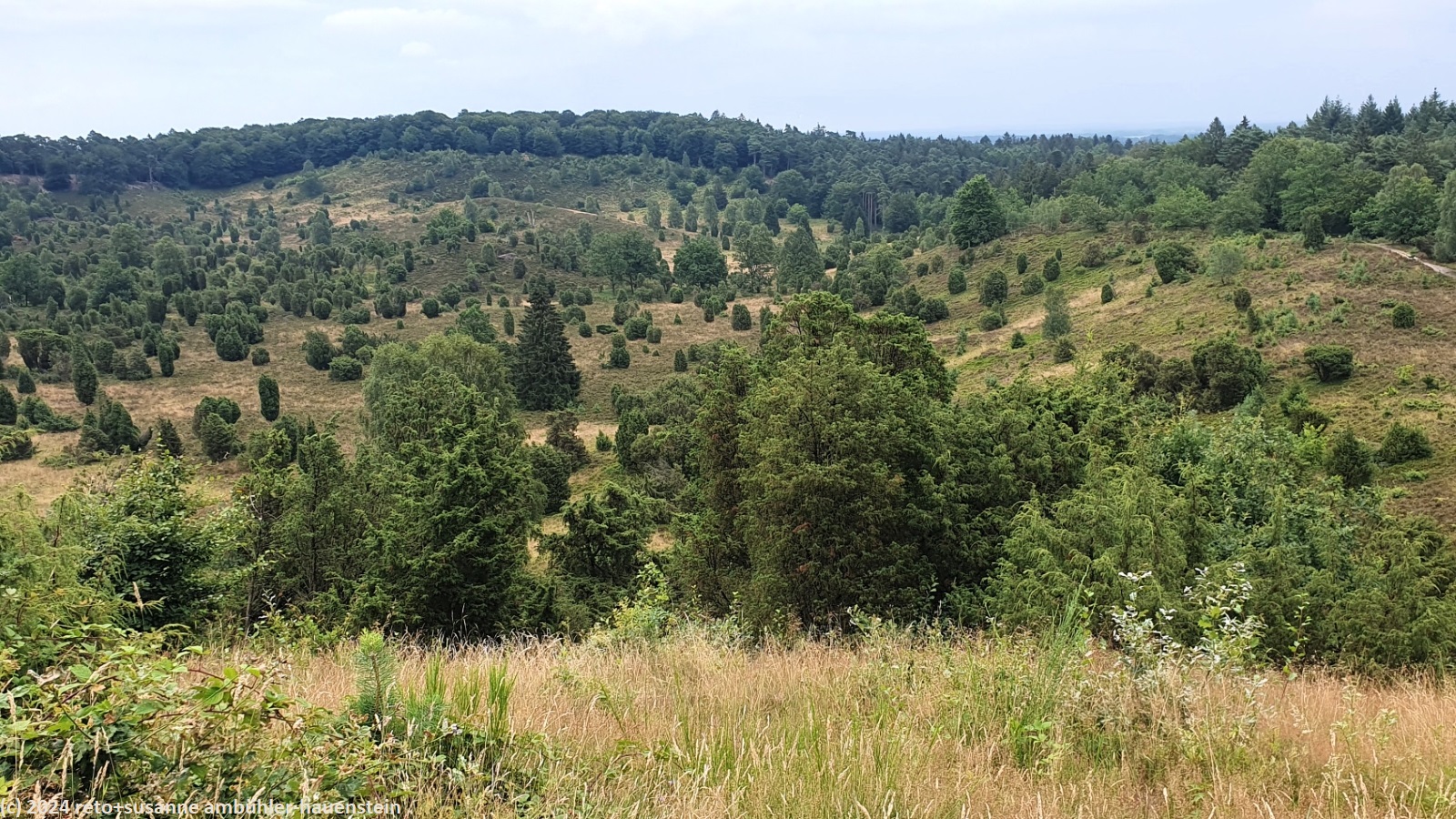 als wir um 08:30 uhr aufstehen, ist der himmel noch bewölkt, doch schon während wir frühstücken, wird es sonnig. wir fahren nach oberhaverbeck, wo wir erst durch den ort mit zahlreichen, historischen fachwerkbauten spazieren und dann den weg richtung wilseder berg unter die füsse nehmen. vom 169.2 meter hohen "berg" haben wir eine tolle aussicht auf die lüneburger heide. nach dem sanften abstieg richtung wilsede essen wir auf einer sitzbank am dorfrand zu mittag. dabei fallen einige regentropfen. im historischen ort bewundern wir weitere fachwerkhäuser und geniessen im restaurant "milchhalle" kaffee und kuchen. anschliessend folgen wir dem wanderweg richtung "totengrund" und umrunden die senke. erst durch einen schönen wald und dann über die offene heide wandern wir zurück zum ausgangspunkt. bevor wir zum einkaufen nach schneverdingen fahren, gönnen wir uns in einem hübschen gartenrestaurant ein erfrischendes getränk. zurück auf dem campingplatz müssen wir im jogi nachtessen, denn es zieht gerade ein gewitter vorüber. den abend verbringt susanne mit lesen und ich am computer.