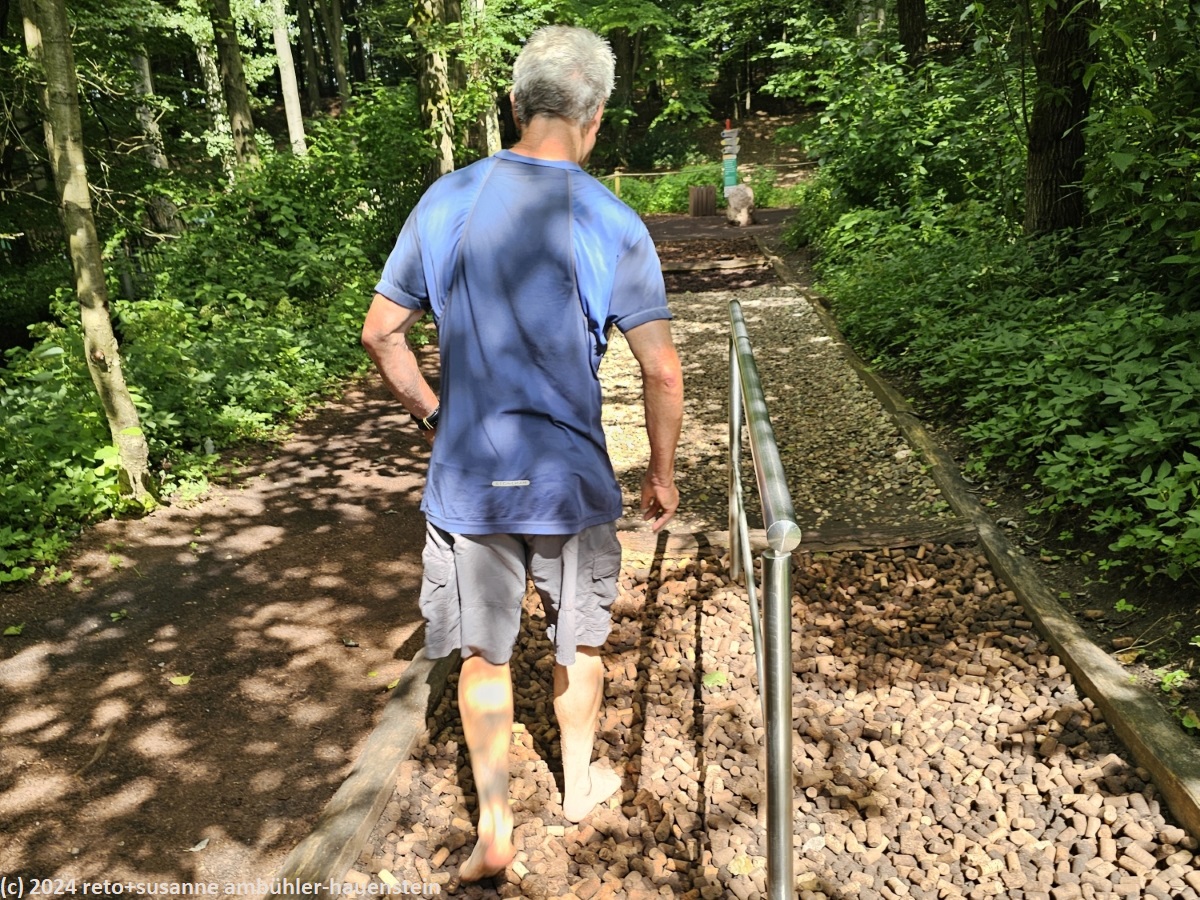 reto geht über korkzapfen im barfusspark bei egestorf susanne geht über glasscherben