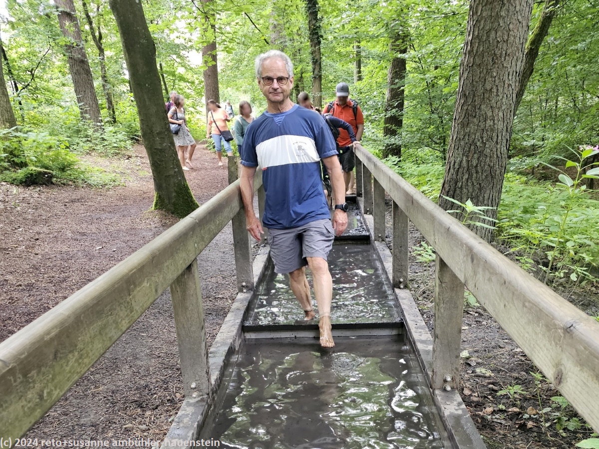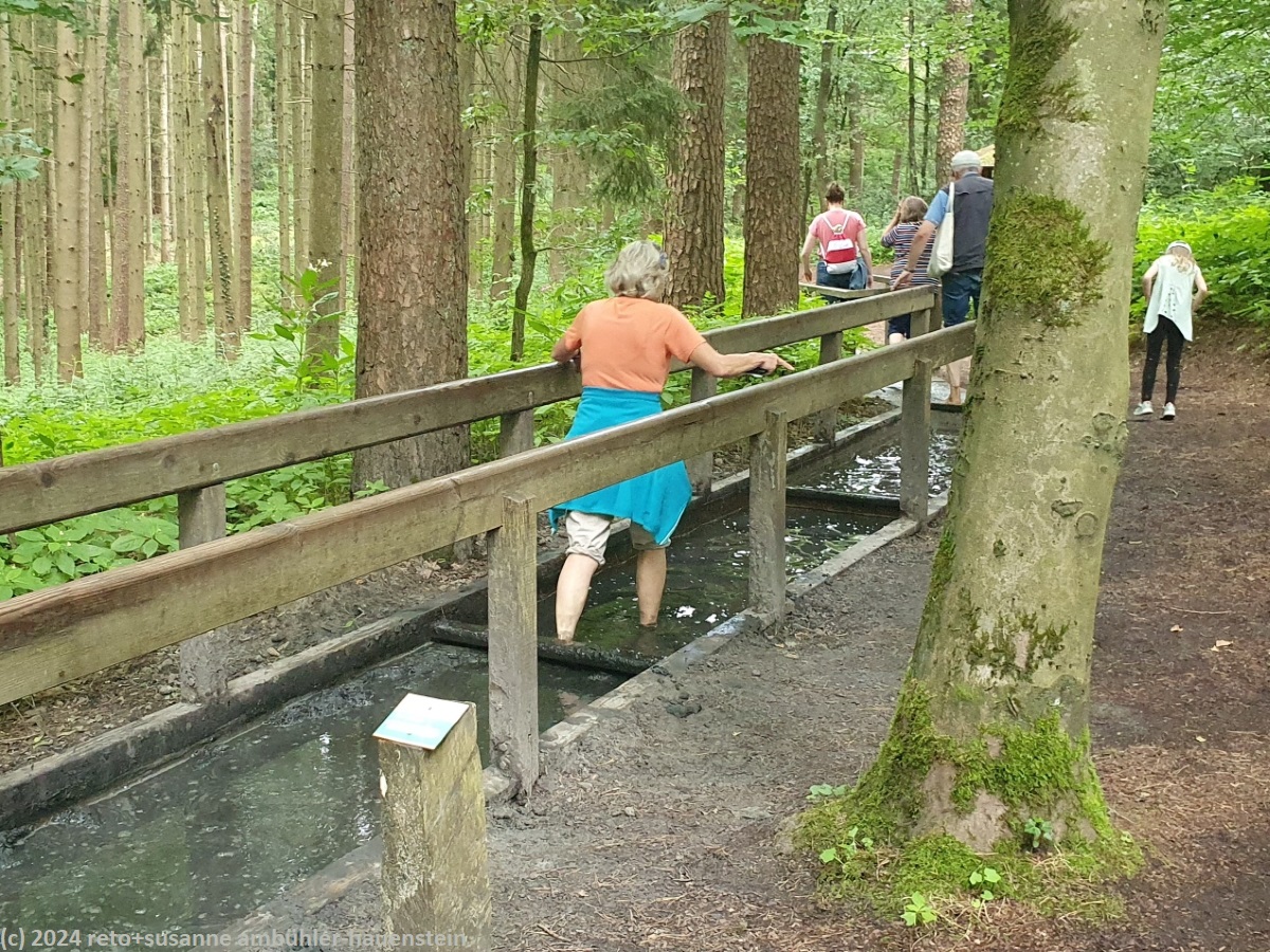 wir stehen auch heute um 08:30 uhr auf. es ist trocken, wenn auch etwas windig. die bedingungen sind gut genug, um im freien zu frühstücken. nach dem abwaschen packen wir zusammen und melden uns beim empfang ab. über die A7 gelangen wir nach egestorf, wo wir den barfusspark besuchen. der besucherandrang ist sehr erträglich. es sind viele familien mit kindern unterwegs, der park ist super geeignet für familien mit kinder jeden alters. der rundweg führt über unterschiedliche unterlagen inklusive holz, stein, glasscherben, pfirsichkerne, tannzapfen, tannenzweige, schlamm- und torfbäder. der waldboden ist angenehm zu begehen. der pfad ist sehr abwechslungsreich. die über 60 posten haben nicht nur mit barfussgehen zu tun, sondern es gibt noch diverse andere attraktionen wie klänge, pendel usw. etwas besonderes ist die "längste barfuss-begehbare hängebrücke". um 12:30 uhr sind wir wieder beim ausgangspunkt.