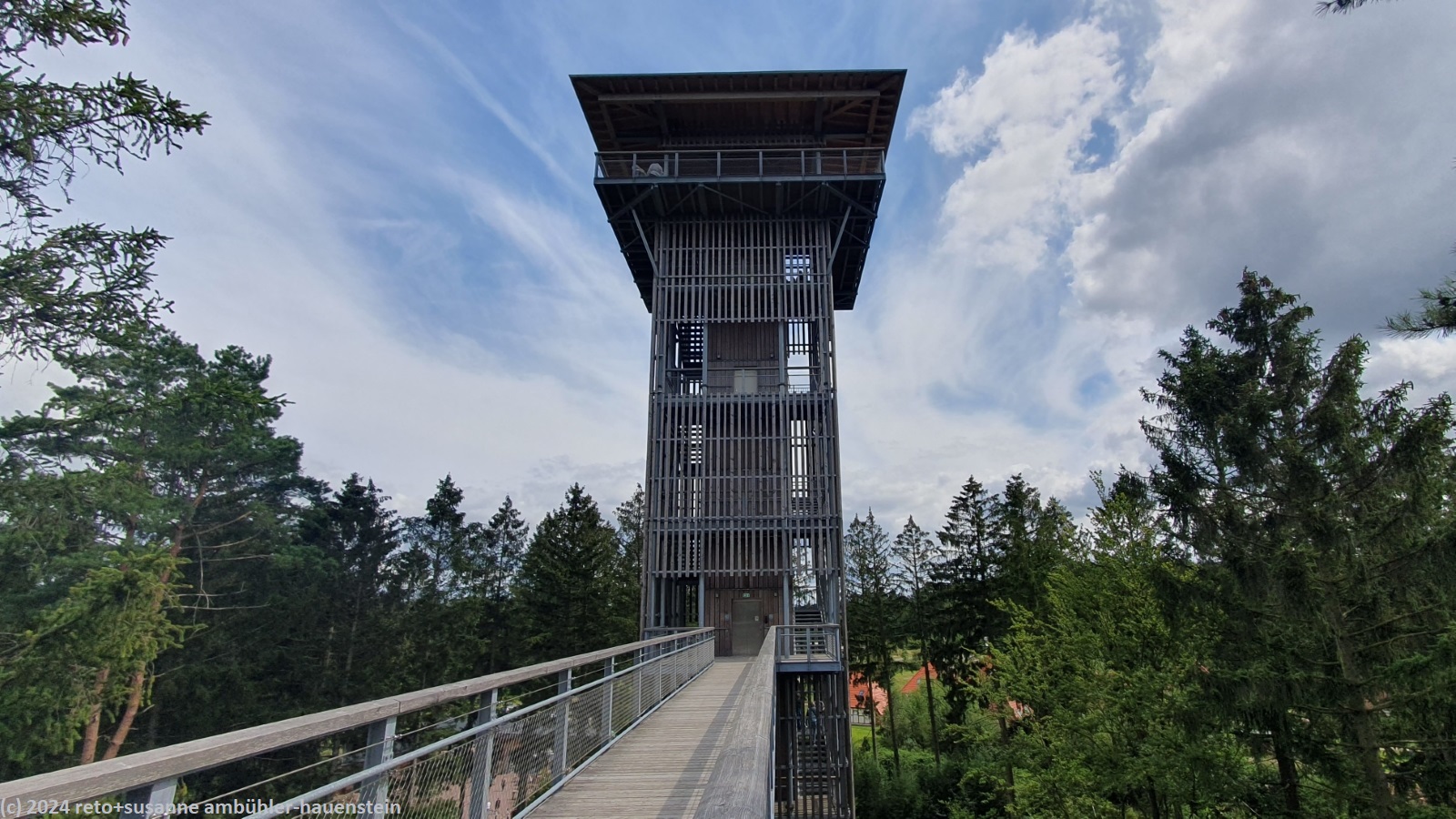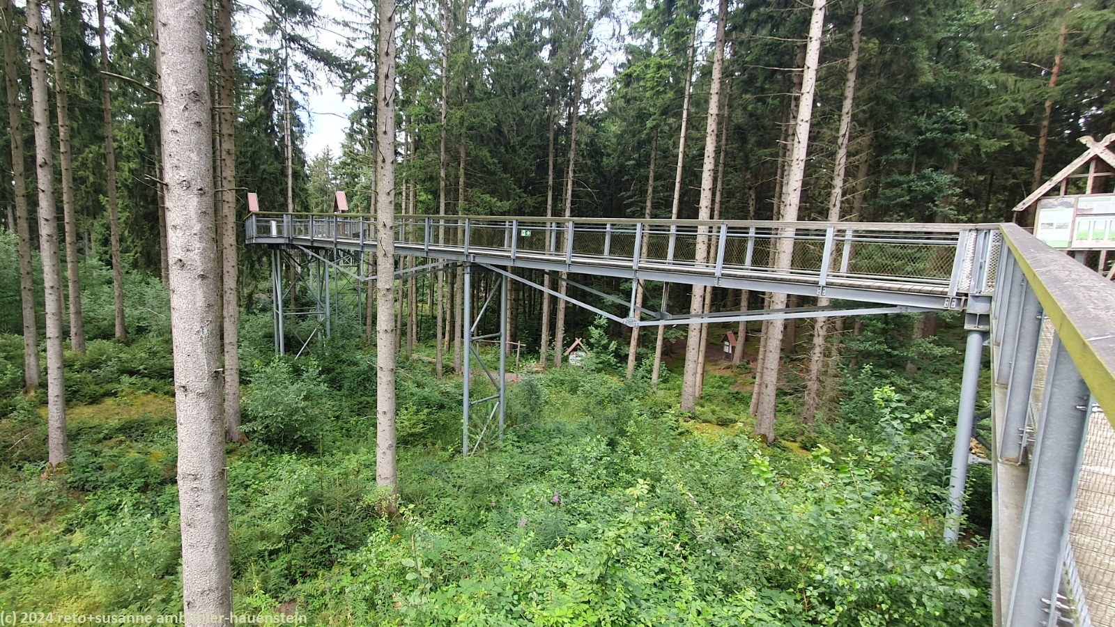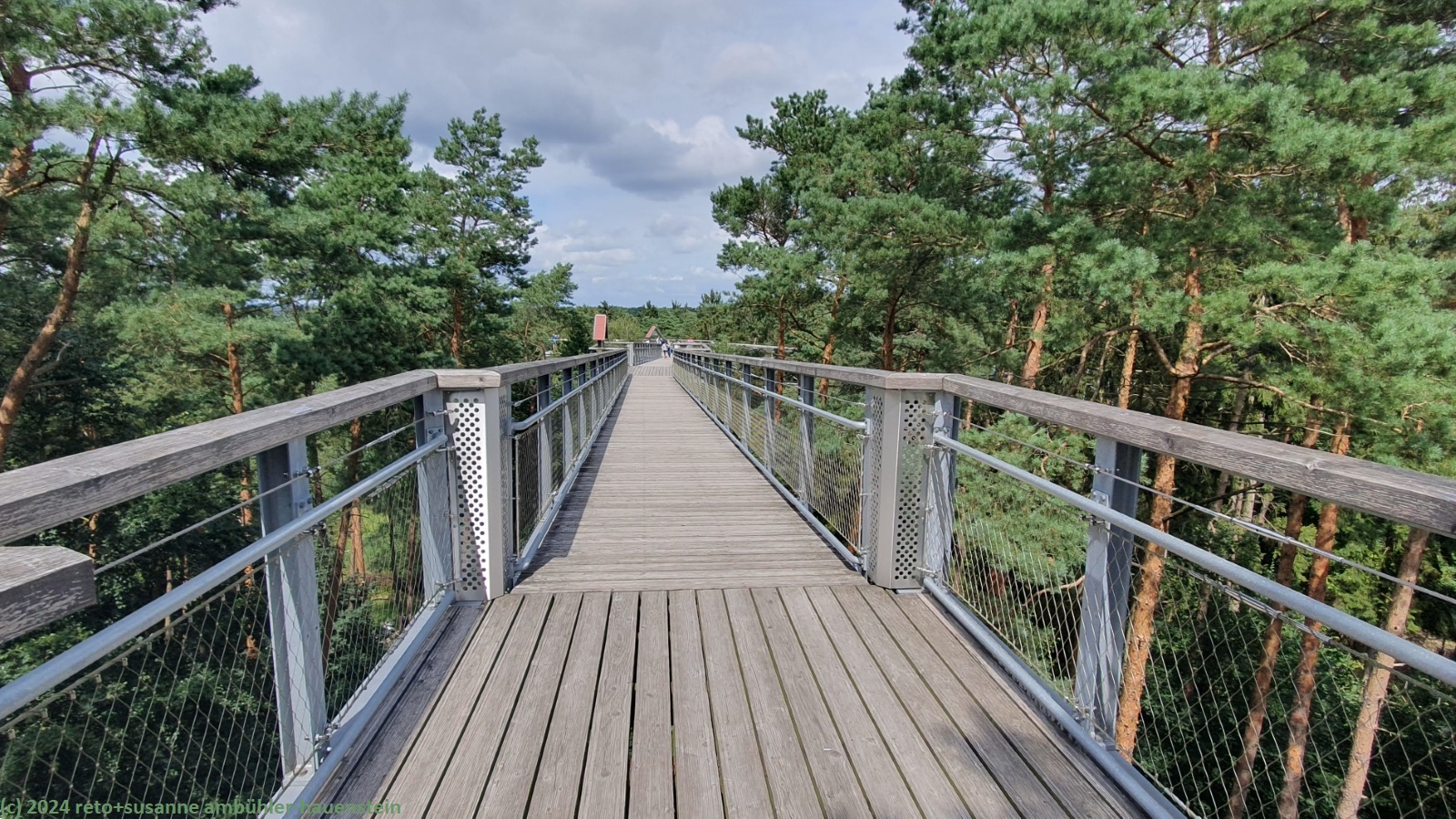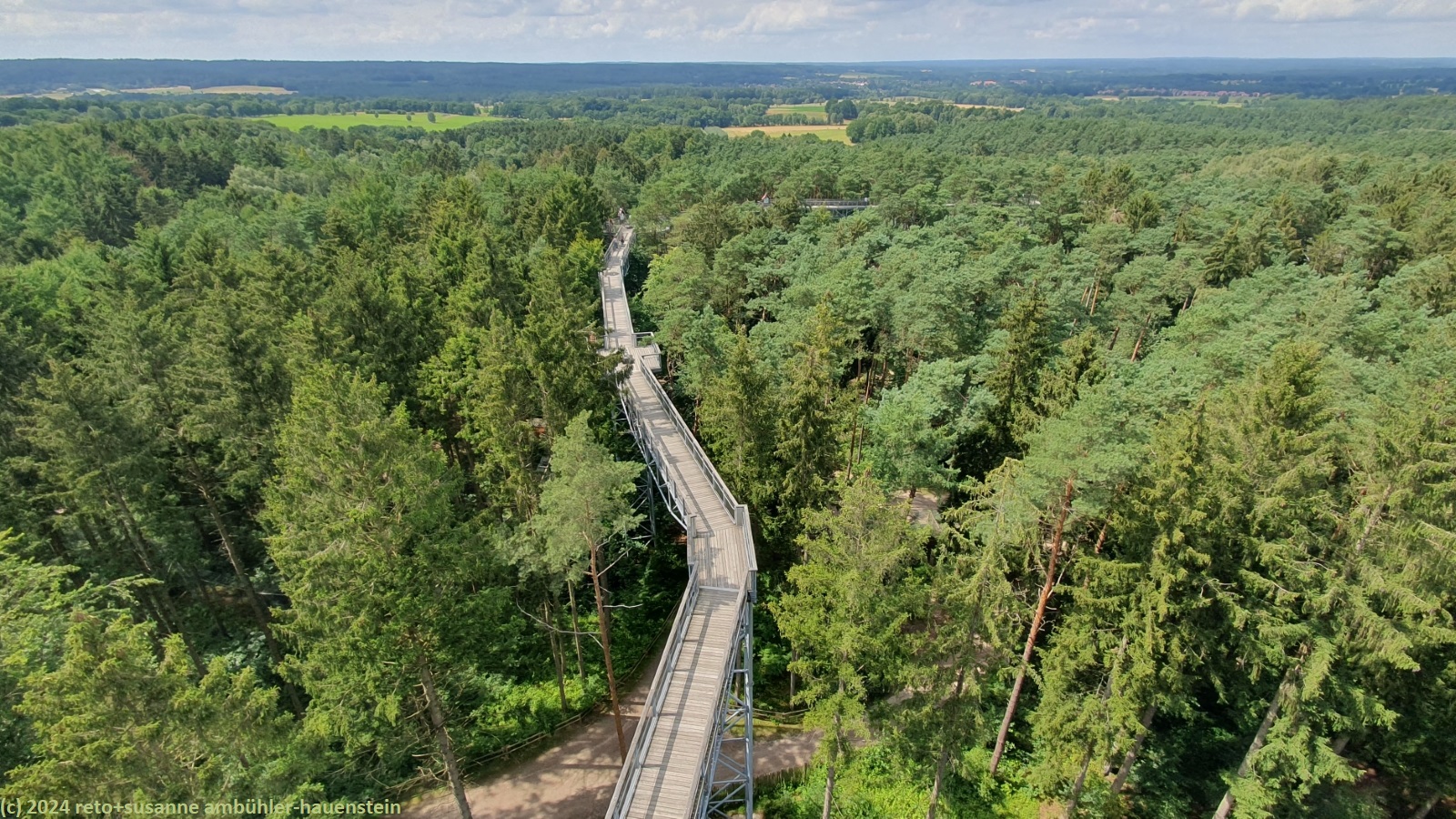 wir fahren zum "heide himmel", einem baumwipfelpfad im wildpark lüneburger heide. allerdings fahren wir nicht direkt, sondern machen einen bogen durch die heidelandschaft um wesel und schierhorn. dabei fahren wir durch undeloh. dieses dorf ist gemäss reiseführer der typische ort in der lüneburger heide schlechthin. manche häuser sind tatsächlich sehr schön, aber uns reicht die fahrt durch den ort, auf den geplanten spaziergang verzichten wir. kurz nach 13 uhr sind wir beim baumwipfelpfad. auch hier hält sich der andrang sehr in grenzen. wir picknicken zuerst an einem der tische beim eingang und geniessen anschliessend kaffee und kuchen auf der terrasse. danach schlendern wir über den baumwipfelpfad. vom steg sehen wir nicht nur in die baumkronen, sondern auch in die gehege des tiergartens. wir erkennen zwei luchse, dachse und waschbären. offenbar dürfen die besucher hier in manche gehege und tiere füttern. zudem sehen wir rehe, welche sich von den besuchern streicheln lassen. schliesslich erreichen wir den 45 meter hohen aussichtsturm. von der plattform haben wir eine tolle rundsicht. wir sehen vorwiegend wald, soweit das auge reicht. selbst der fernsehturm von hamburg ist mit blossem auge zu erkennen. kurz vor 15 uhr sind wir wieder beim jogi.