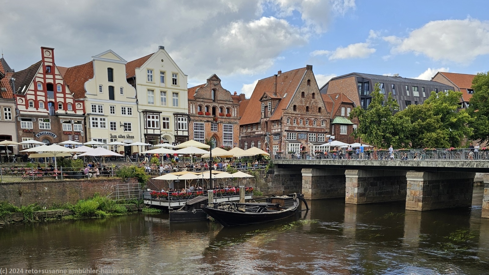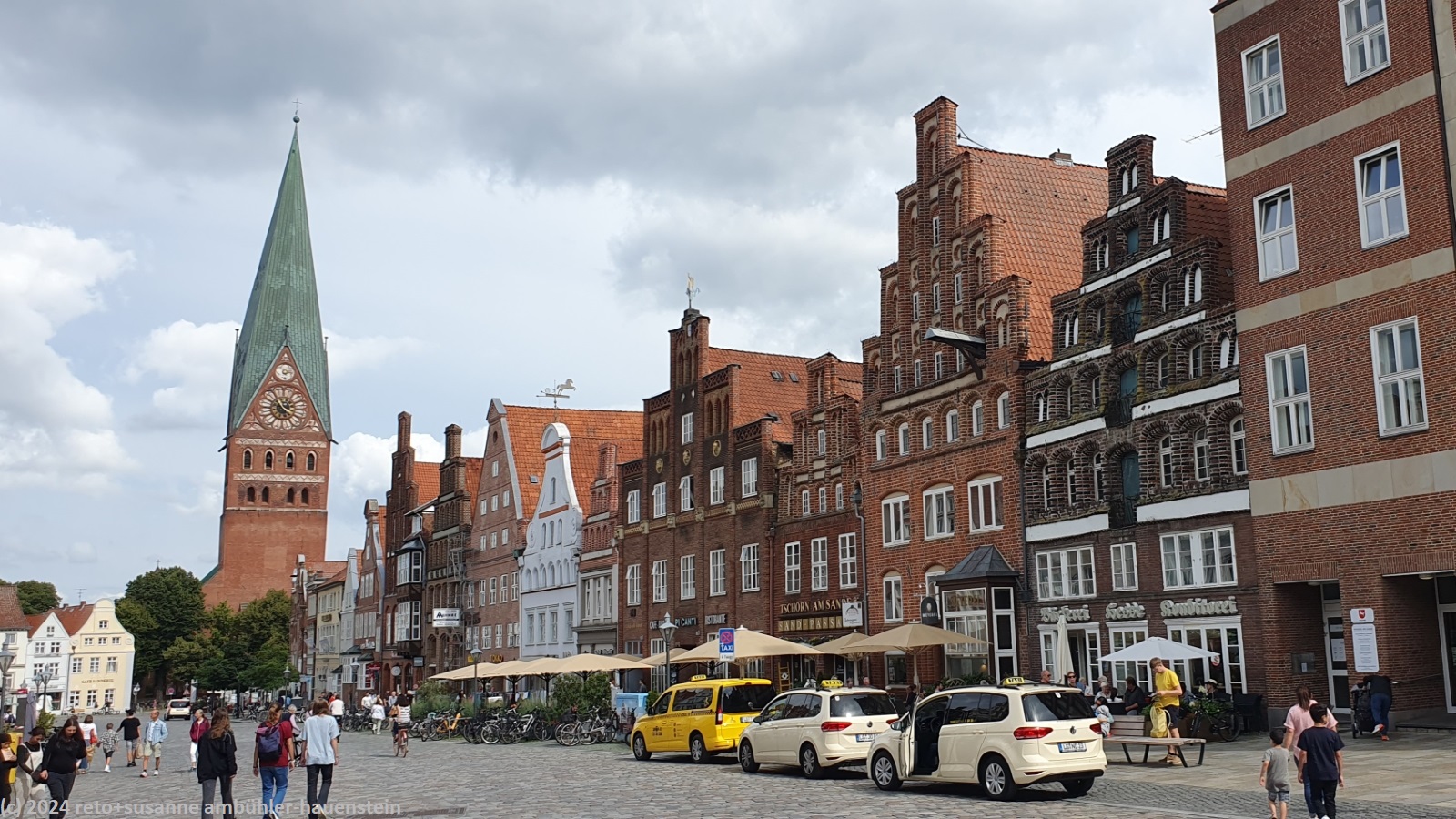 die fahrt nach lüneburg dauert etwas länger als erwartet, weil die strasse zwischen garlstorf und salzhausen gesperrt ist und wir deshalb eine umfahrung nehmen müssen. kurz nach 15:30 uhr erreichen wir lüneburg und finden auch den parkplatz "hinter der saline" auf anhieb. zu fuss gehen wir in die altstadt. im touristenbüro erhalten wir einen stadtplan. wir erfrischen uns "am sande" in einer bäckerei mit tee und einem brötchen, danach spazieren wir durch das stadtzentrum. an der mächtigen sankt johanniskirche vorbei gelangen wir zum 56 meter hohen wasserturm. wir erklimmen die treppe zur aussichtsplattform und haben einen fantastischen rundblick über die stadt. im wasserturm wurden einst 500'000 liter wasser gespeichert. heute dient das gebäude als touristenattraktion und veranstaltungsort. es hat diverse ausstellungen und den zweiten stock kann man für veranstaltungen mieten. wieder auf dem boden gehen wir richtung fluss und folgen der ilemnau bis zur lünerstrasse. hier befindet sich das restaurant "das kleine", wo wir gerne zu abendessen möchten. noch ist es etwas zu früh, aber eine freundliche dame meint, wir bräuchten keine reservation, wir sollen einfach kommen wenn uns danach ist. wir spazieren noch einmal durch die altstadt und sind dann kurz vor 18 uhr beim "kleinen".