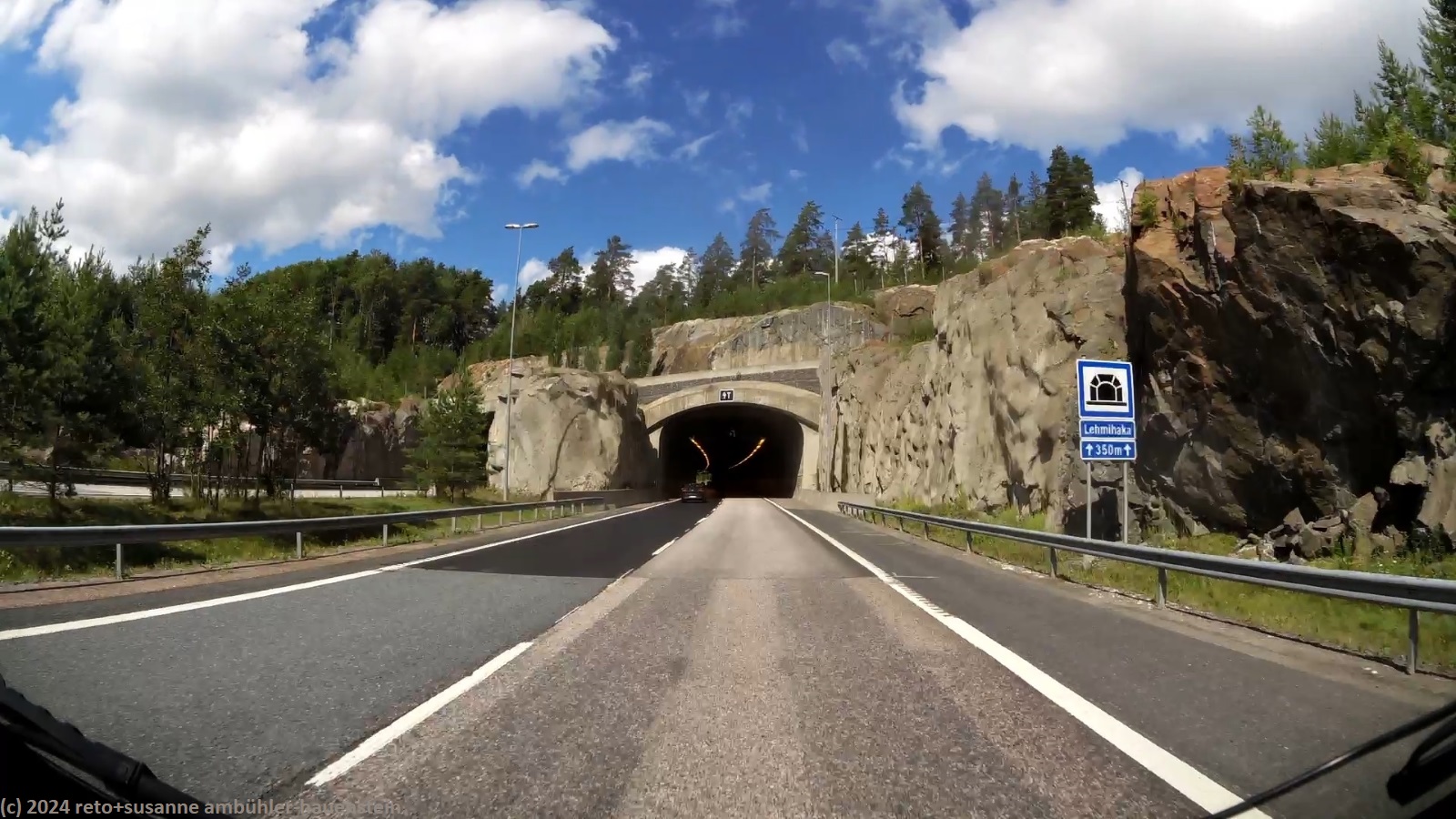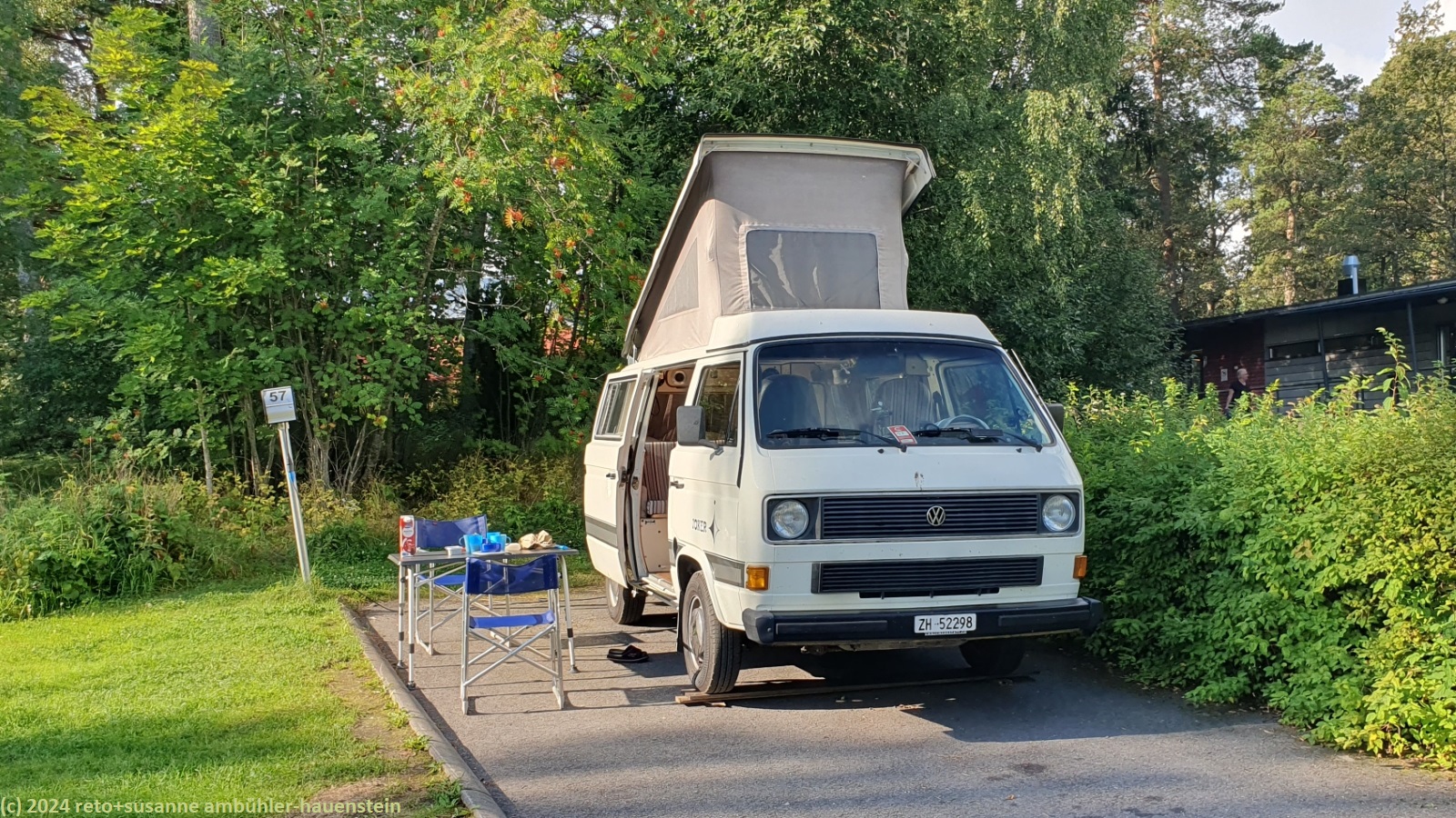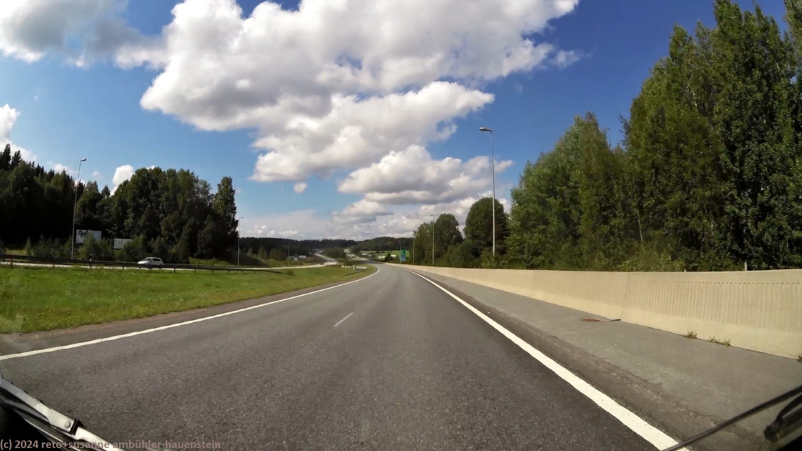 vor dem anlegen muss die mächtige fähre wenden. dank antrieben im heck und im bug kann das schiff an ort drehen. der himmel ist fast wolkenlos, es ist ziemlich warm. wir legen pünktlich an, aber bis das entladen beginnt, dauert es noch ziemlich genau eine stunde. möglicherweise verzögert sich das entladen wegen dem motorradfahrer, der offenbar auf der laderampe gestürzt ist und am boden liegt. was für ein riesiges pech, wenn der urlaub so beginnt - oder gar mit dem sturz endet, bevor er richtig begonnen hat. auch auf der fahrt durch das hafenareal ist viel geduld erforderlich. den zoll passieren wir dagegen ohne verzögerung. schon bald sind wir auf der A7 richtung helsinki. wir fahren auf dem ring nördlich an der stadt vorbei. auf der A1 geht es westwärts. wir kommen äusserst gut voran. es sind nur wenige fahrzeuge unterwegs und die finnen sind sehr disziplinierte autofahrer. erstaunlicherweise fahren wir einige male durch tunnel, zumindest eines davon ist überraschend lange. die sonne steht an einem nahezu wolkenlosen himmel, in unserem jogi steigt die temperatur auf bis zu 32°C. um 13:30 uhr sind wir beim campingplatz ruissalo auf einer insel westlich von turku. unsere reservation klappt, mit dem zugewiesenen stellplatz sind wir allerdings nicht glücklich. wir können aber problemlos auf einen anderen platz wechseln.