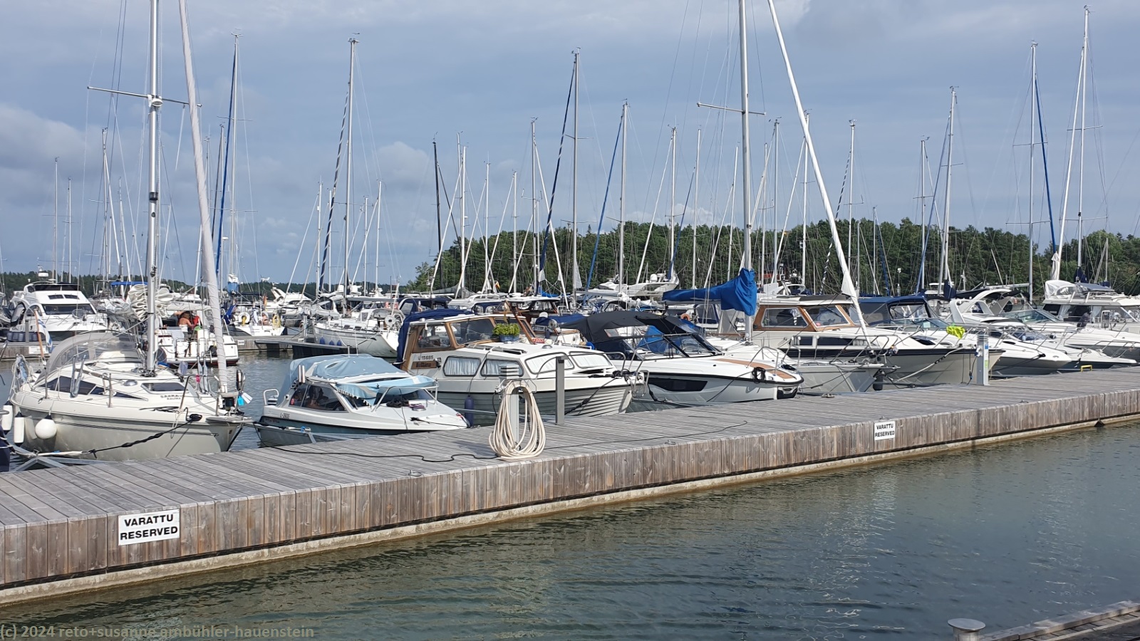 kurz vor 16 uhr sind wir im hafen von nagu. wieder verliert susanne beim aussteigen das gleichgewicht und landet im wasser. auch wenn dieses sehr warm ist, so ist das doch unangenehm. es ist aber nichts passiert. wir ziehen uns um und spazieren dem strand entlang zu einem der restaurants, wo wir uns einen kaffee bzw. tee und je eine zimtschnecke gönnen. ausserdem fragen wir im touristenbüro nach einem platz zum übernachten im zelt. die junge dame hat tatsächlich einen vorschlag, eine etwa 7 km entfernte bucht auf dem weg richtung pargas.