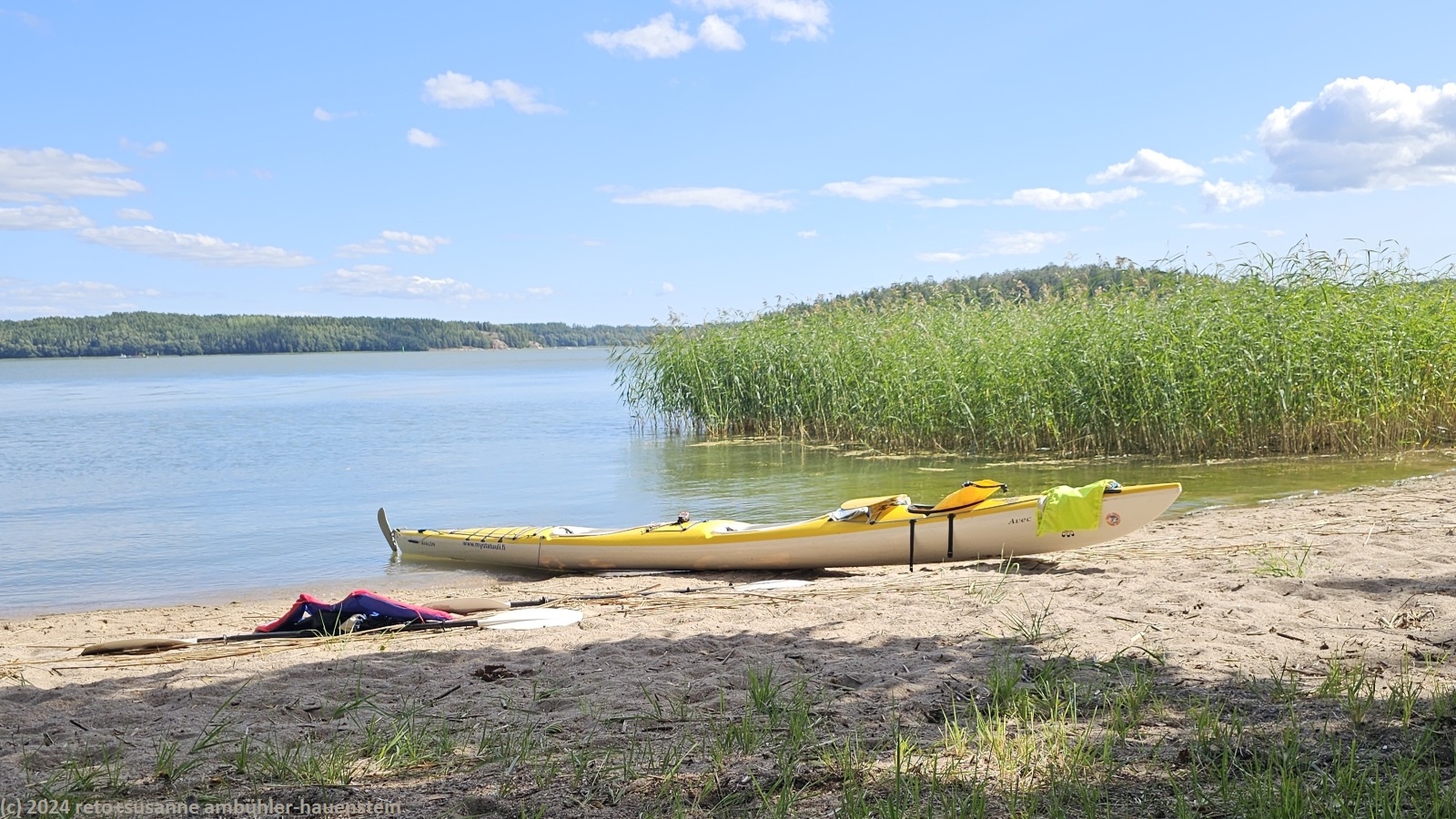 um 14:15 uhr machen wir uns wieder auf den weg. unter der strassenbrücke hindurch paddeln wir weiter richtung pargas. das wasser im kyrkfjärden ist wieder etwas unruhiger. wir halten uns vorerst ans nordwestliche ufer der insel stortervolandet. auch hier ist die küste für skandinavische verhältnisse dicht bebaut. prächtige strandhäuser, oft mit schönen nebengebäuden, in welchen es vermutlich meistens eine sauna hat, thronen hoch über dem wasser. leider hat man es in dieser gegend verpasst, an geeigneten stellen rastplätze für kajaker zu schaffen. im norden hat man das besser gemacht. immer wieder findet man rastplätze mit feuerstellen, einem windschutz oder einer kleinen hütte und stellplätze für ein oder zwei kleine zelte, siehe zum beispiel tagebuch vom 05-aug-2024.