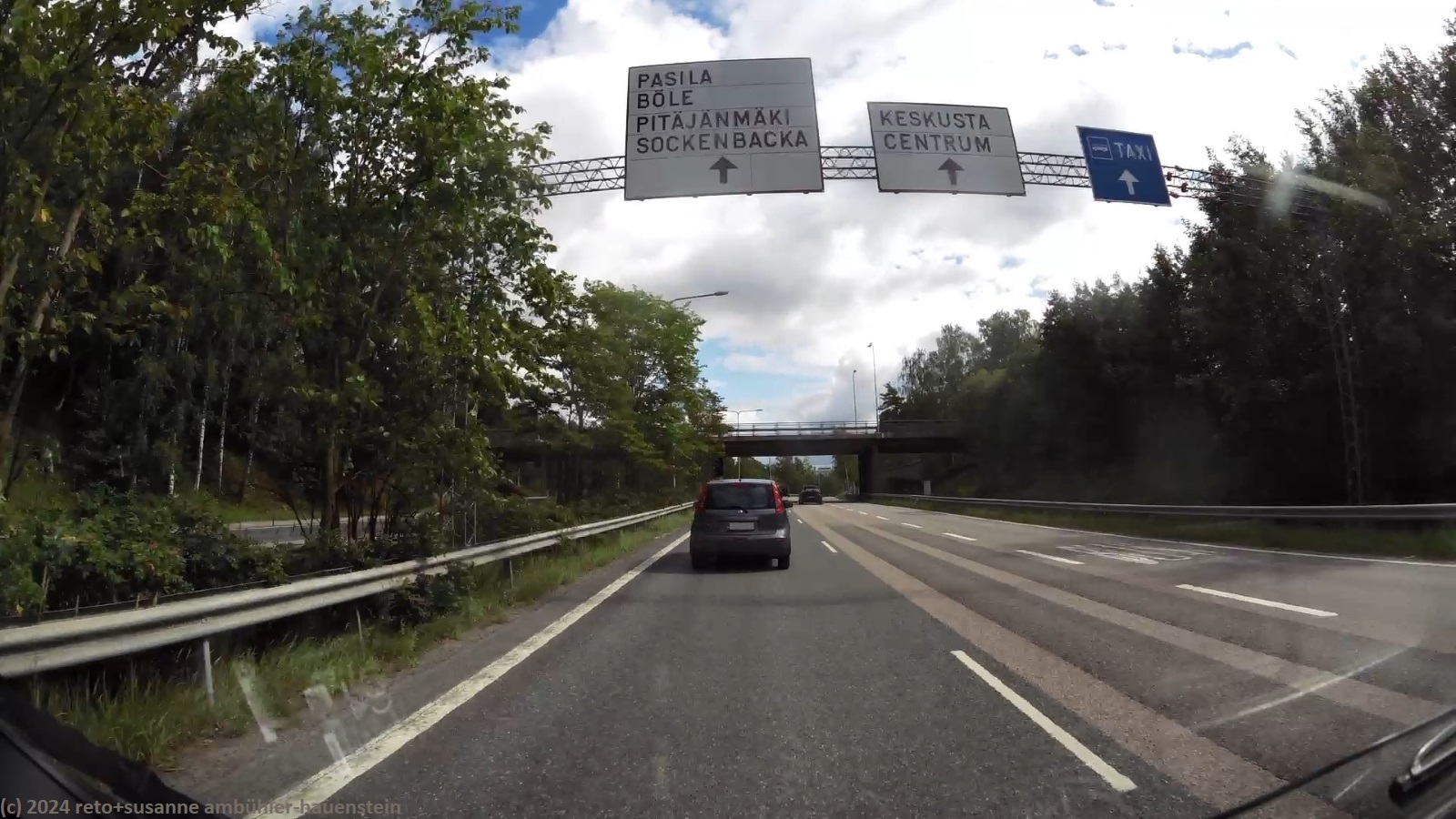 wir stehen gegen 08:30 uhr auf und frühstücken im freien. der himmel ist bewölkt, es gibt kaum sonne. die temperatur ist angenehm. nach dem abwaschen packen wir zusammen. die fahrt nach pasila verläuft entspannt. die zufahrt zur autoverladestation ist immer noch extrem chaotisch. auch wenn der bahnhof nun fertig ist, so hat es trotzdem nichts als baustellen entlang der zufahrtsstrasse.