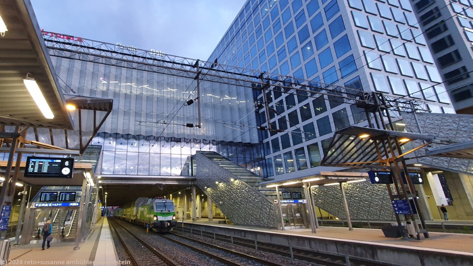 während wir auf den verlad warten liest susanne, ich führe die bücher nach. kurz vor 22 uhr erscheint ein mitarbeiter der bahn und fordert uns auf, auf den bereitstehenden wagon zu fahren. als unser jogi platziert und fixiert ist, gehen wir in den modernen bahnhof und setzen uns in ein cafe. wir trinken einen tee, susanne liest, ich arbeite am computer. um 23 uhr begeben wir uns auf den bahnsteig.