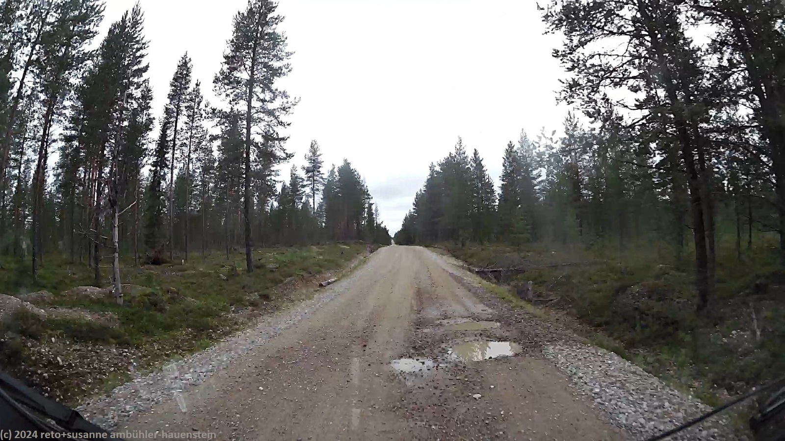 es ist schon 08:45 uhr, als wir endlich aus dem bett kommen. heute frühstücken wir im jogi, obwohl das wetter gleich ist wie gestern. kurz vor 11 uhr machen wir uns auf den weg richtung julma-ölkky. wieder geht es über eine unbefestigte strasse mit zahlreichen schlaglöcher. der hossa nationalpark schützt hier nur gerade den langgezogenen julma-ölkky und dessen ufer. der schmale bereich ist keine 600 meter breit. auf der fahrt zum ausgangspunkt unserer heutigen wanderung fahren wir an einer riesigen kiesgrube vorbei, die gerade noch ausserhalb des parkes liegt.