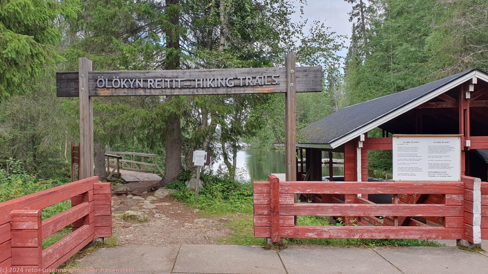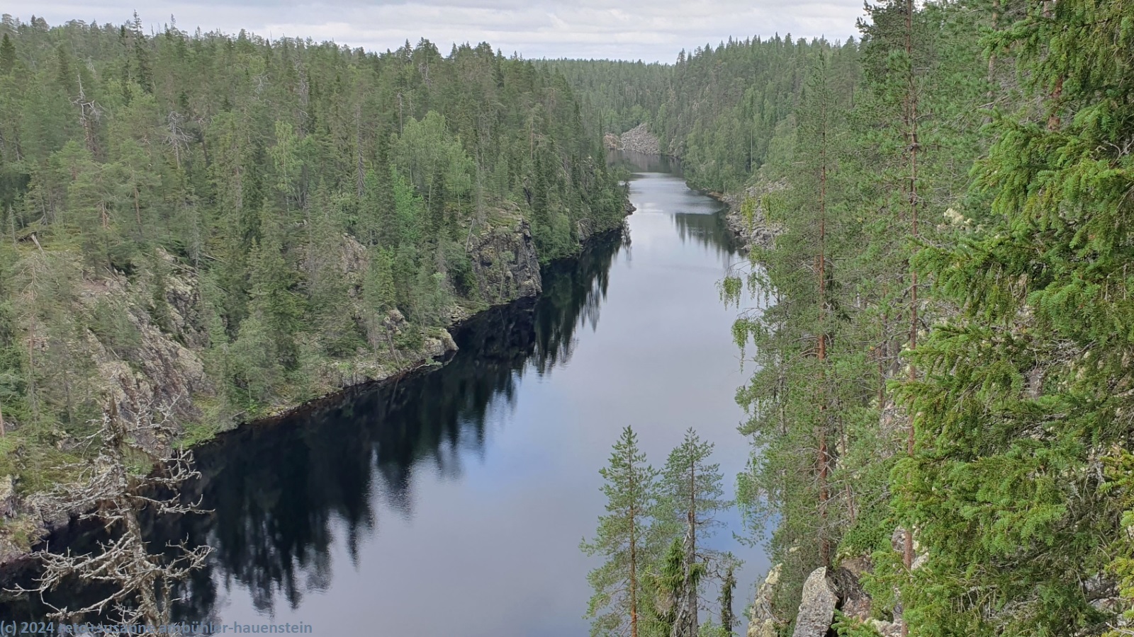 wir schlafen bis 08:45 uhr. nach dem frühstück im wagen fahren wir zum julma-ölkky, wobei wir auch heute über eine holprige, unbefestigte strasse zum ausgangspunkt unserer rundwanderung gelangen. diese führt uns um die langgezogene schlucht des julma-ölkky, ein schmaler see, der bis zu 50 meter tief sein soll. die steilen felswände überragen die wasseroberfläche nochmals um bis zu 50 meter. der schmale pfad ist ein auf und ab. wir wandern auf der ostseite bis zum nördlichen ende der schlucht. dabei kommen wir auf etwa halbem weg an der hängebrücke vorbei, welche den see überspannt, zur zeit aber geschlossen ist. es ist schon bald 13:30 uhr, als wir bei der schutzhütte ölökynperä picknicken. obwohl uns unterwegs kaum jemand begegnet ist, hat es hier erstaunlich viele menschen. auf dem rückweg zum ausgangspunkt folgen wir dem westlichen rand der schlucht. auch hier gibt es einige schöne aussichtspunkte. zurück beim parkplatz holen wir uns beim kiosk kaffee und eine zimtschnecke. während wir zum campingplatz zurück fahren, zeigt sich die sonne. wie schon gestern geniessen wir erst die sauna und dann das abendessen im freien. den abend verbringen wir am computer.