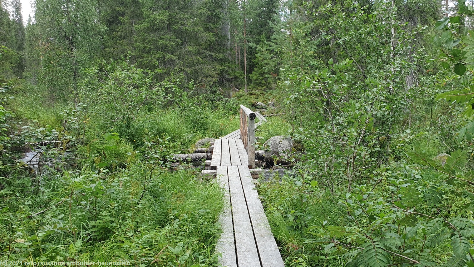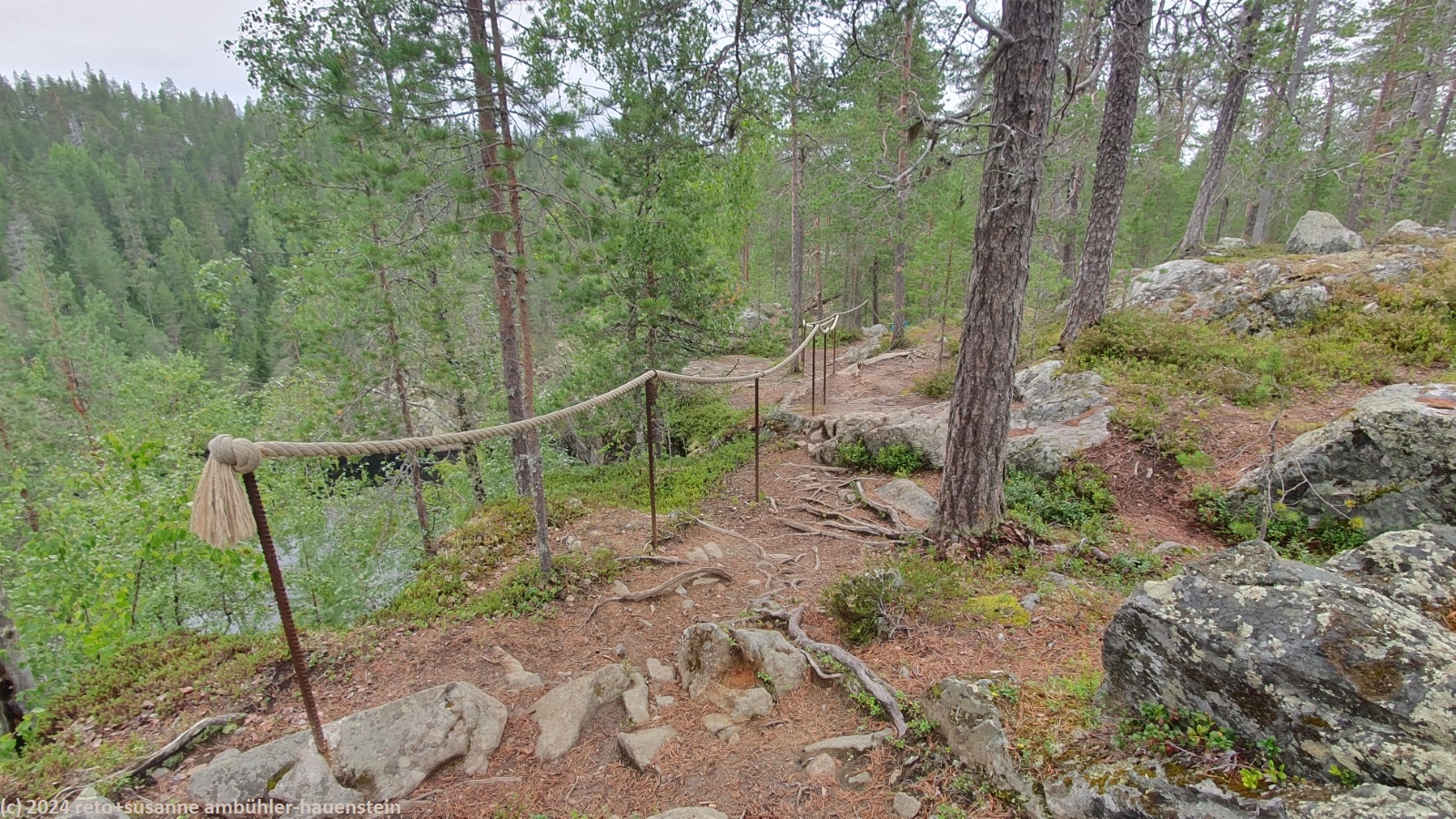 unsere heutige wanderung führt uns rund um den gleichnamigen see. obwohl "see" nicht ganz passend ist: das schmale und langgezogene gewässer befindet sich in einer schlucht, deren wände bis zu 50 meter über die wasseroberfläche hinaus ragen. der see soll noch einmal bis 50 meter tief sein. eine solche schlucht ist in finnland eher eine seltenheit. wir wandern auf der östlichen kante nordwärts. der wald ist gegenüber der gestrigen wanderung abwechslungsreicher, vielfältiger und wilder. der weg ist holpriger und manchmal geht es ziemlich steil auf- oder abwärts, wenn auch immer nur ganz kurz. auch die stege durch die sumpfgebiete fehlen nicht. auf etwa halbem weg befindet sich die spektakuläre hängebrücke, welche den canyon überspannt. diese brücke ist allerdings zur zeit wegen wartungsarbeiten geschlossen. offenbar wurde sie bei einem unwetter im juni stark beschädigt. wir wollten zwar nicht über diese brücke gehen, aber der blick von derselben wäre bestimmt eindrücklich gewesen. wir setzen unsere wanderung fort und sind kurz nach 13:20 uhr bei der schutzhütte ölökynperä. hier essen wir zu mittag. mit dieser schutzhütte haben wir den nördlichsten punkt unserer rundwanderung erreicht.