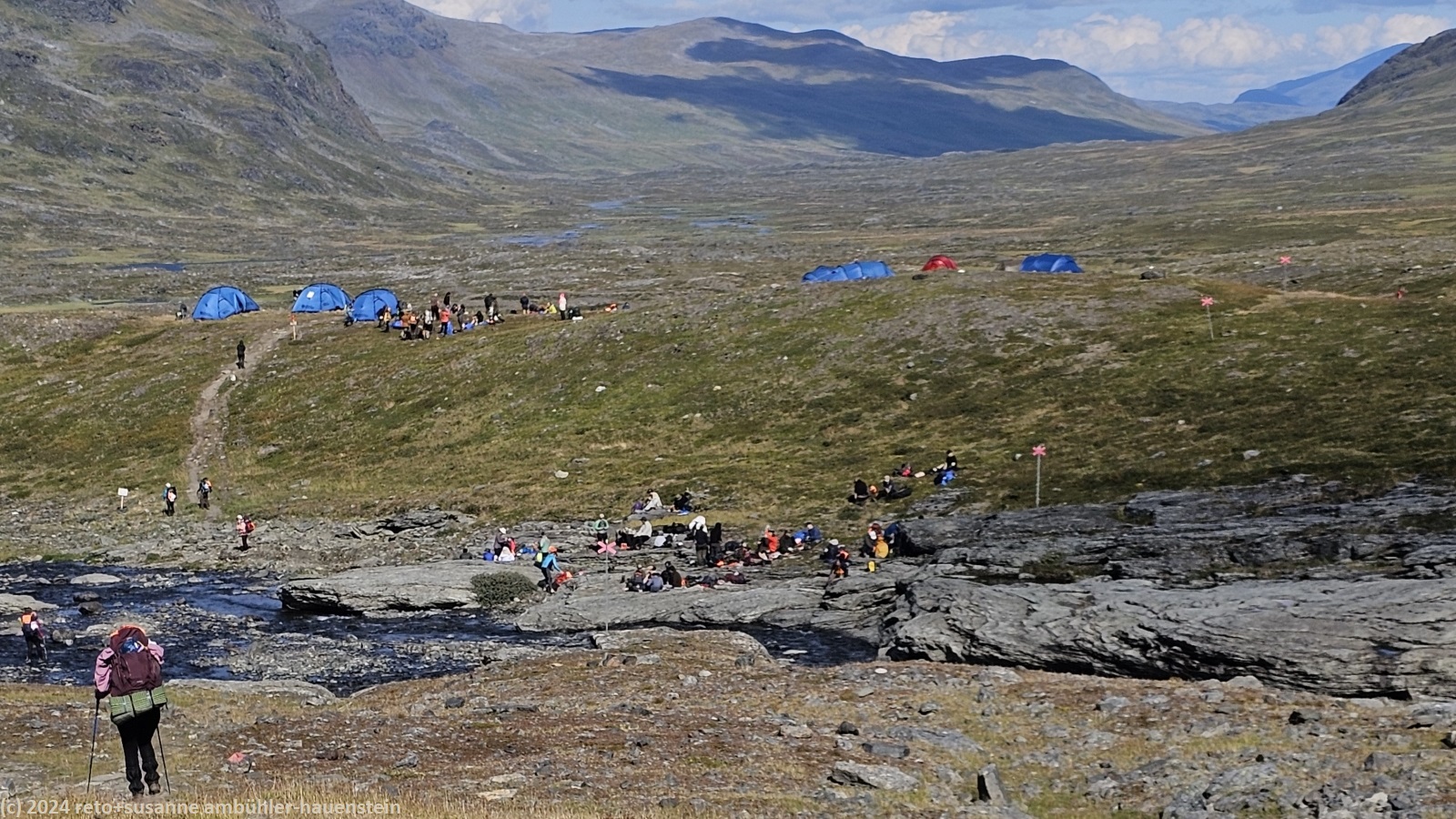 die nacht war sehr ruhig. ich habe bestens geschlafen, meine frau etwas weniger gut, da sie von kopfschmerzen geplagt wird. als wir um 07:30 uhr aufstehen, scheint die sonne, der himmel ist leicht bewölkt. allerdings bläst ein kräftiger südwind, dieser dürfte die ursache für die kopfschmerzen sein. wir frühstücken in der küche, danach wischen wir um unseren tisch. nachdem wir unsere rucksäcke gepackt haben, machen wir auch in unserem zimmer sauber. gegen 9 uhr brechen wir auf. um die fjällstube herrscht reger betrieb. heute begegnet uns wohl der grösste teil der fjällräven classic teilnehmenden. wir überqueren die hängebrücke südlich der stuga, danach wandern wir bei herrlichem wetter durch eine fantastisch schöne landschaft. auch die heutige strecke sind wir schon einmal gewandert, siehe tagebuch vom 07-aug-2017. damals haben wir allerdings unser heutiges tagesziel - die tjäktjastuga - ausgelassen und sind direkt zu den sälkastugorna durchgewandert. dieses jahr nehmen wir es gemütlicher und übernachten in jeder stuga entlang der route. der kungsleden folgt dem aliseatnu. dieser fliesst durch ein breites tal. im westen sehen wir zwischen den gipfel kleine eisfelder. im laufe des aufstieges richtung tjäktjapass müssen wir mehrmals kleinere flüsse durchqueren. die teilnehmenden des fjällräven classic kommen uns nun fast ununterbrochen entgegen. gemäss aussage des hütenwartes bei der alesjaure stuga sind es 1800 teilnehmende. meistens laufen sie in gruppen, manchmal kommt uns auch eine einzelne person entgegen. es hat auffallend viele asiaten, insgesamt sind es teilnehmende aus 24 verschiedenen ländern. auffallend ist aber auch, dass absolut kein abfall herum liegt. die disziplin der teilnehmenden ist diesbezüglich enorm. ebenso bezüglich des kreuzens auf den bohlen. fast alle warten oder weichen aus, wenn wir uns auf einem steg kreuzen. kurz nach 12:30 uhr sind wir kurz vor einem checkpoint des fjällräven classic. in einer kleinen mulde essen wir zu mittag. hier sind wir ein bisschen vor dem wind geschützt.
