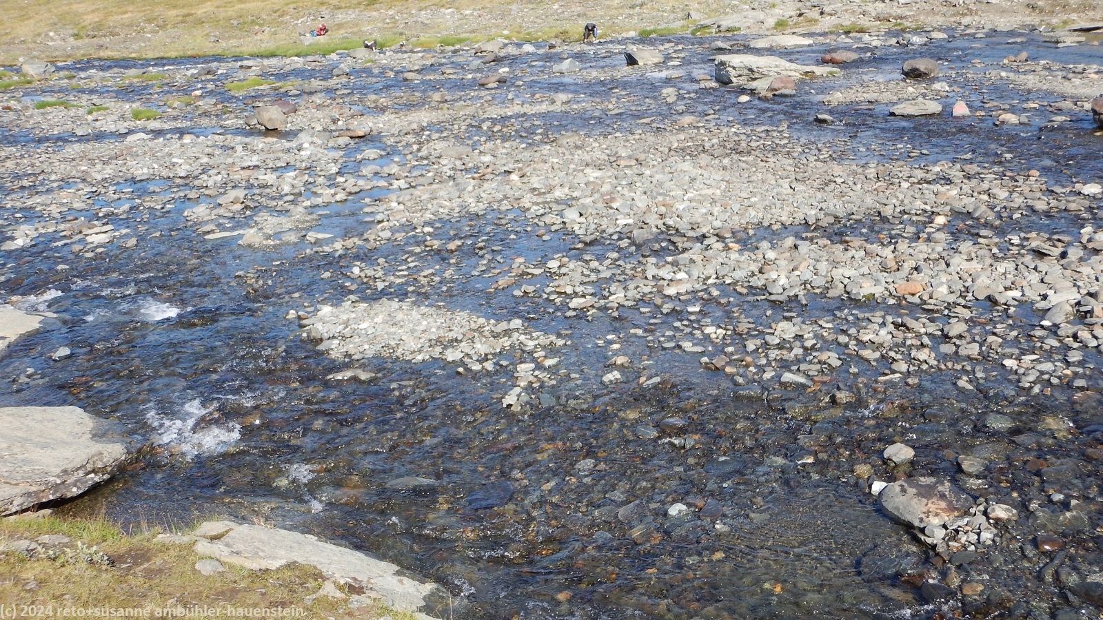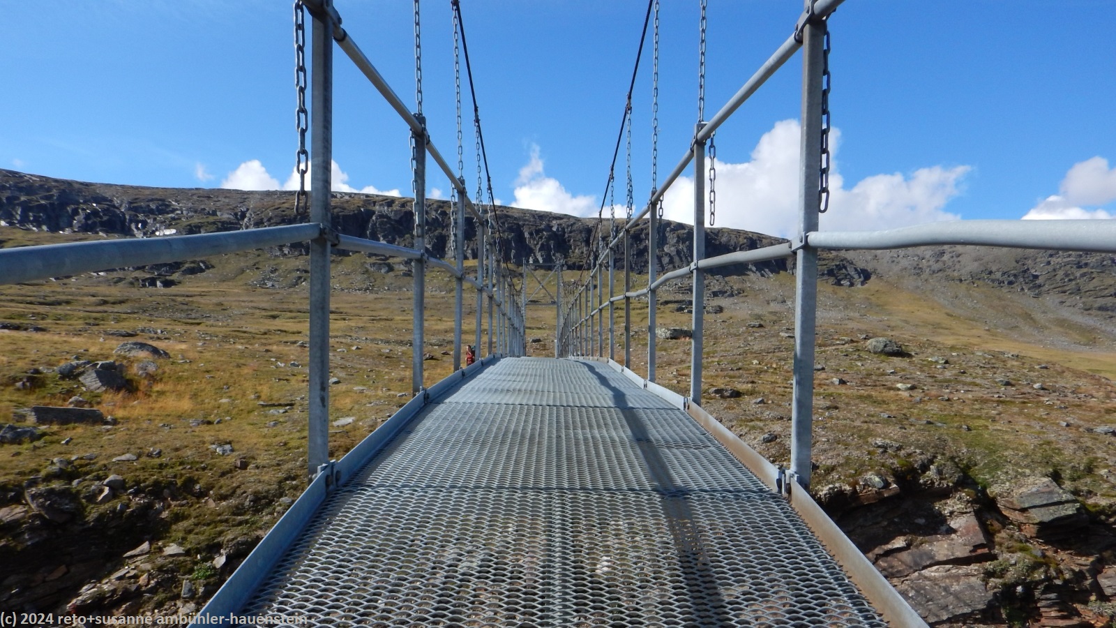 35 minuten später brechen wir wieder auf und passieren den checkpoint. hier können sich die teilnehmenden verpflegen und wohl auch pflegen lassen. unmittelbar nach dem checkpoint müssen wir den breiten zufluss sielmmánjira des aliseatnu durchqueren. ein crew member des fjällräven classic zeigt uns, wo der fluss am besten zu durchqueren ist. es gelingt uns, trockenen fusses ans andere ufer zu kommen, das war ein guter tipp. nun sind es noch zwei kilometer bis zum tagesziel. längst sehen wir die stuga auf der anderen seite des tals. der ceavccanjira hat eine tiefe schlucht ins gelände geschnitten. eine hängebrücke überspannt die schlucht. sie befindet sich etwas südlich der stuga, wir gehen deshalb an letzterer vorbei. auf der anderen talseite geht es dann einige hundert meter nordwärts zurück zur stuga. wir erreichen diese gegen 14 uhr.