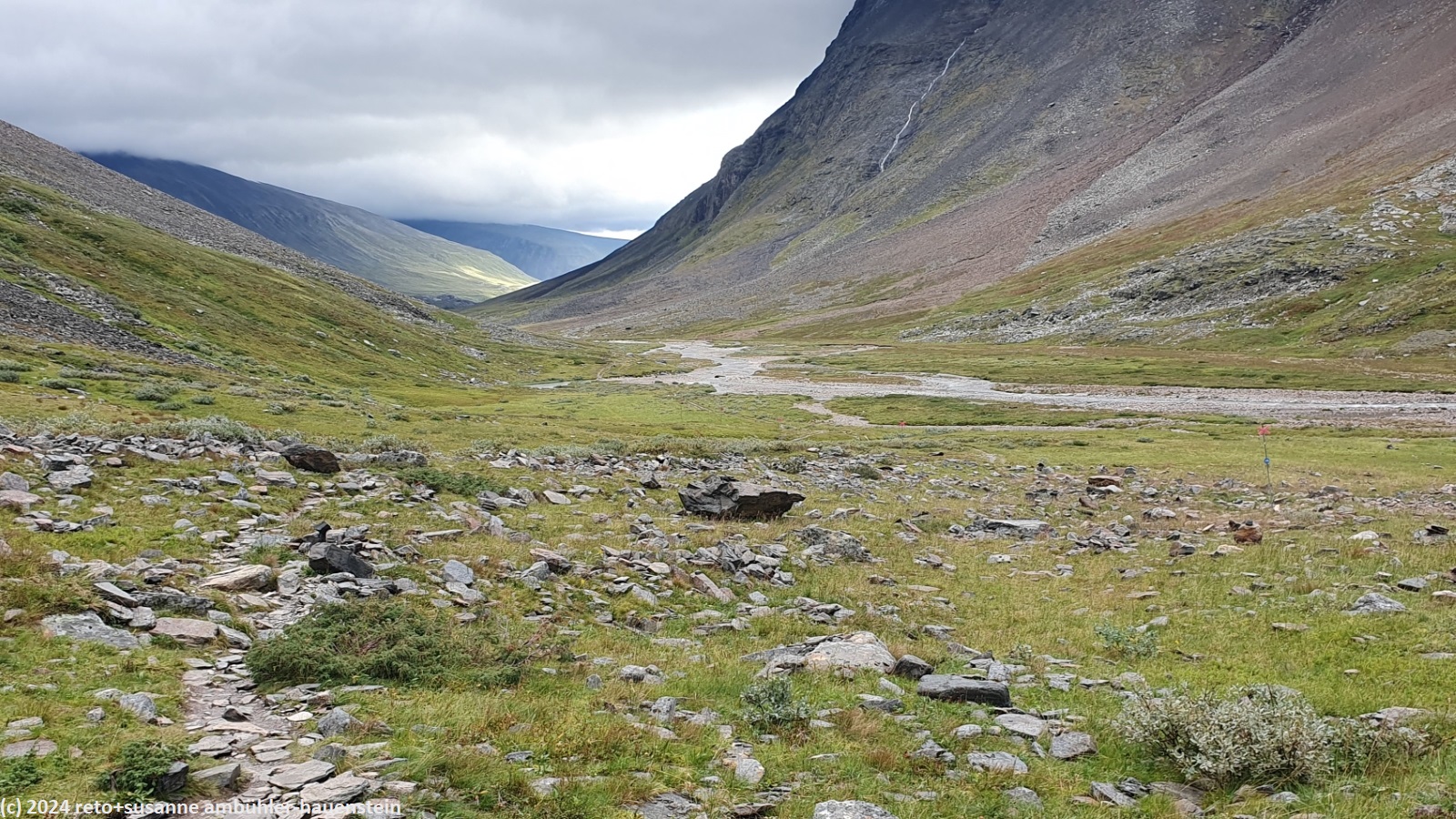 da heute vorallem für den vormittag starker regen angesagt ist, verzichten wir darauf, einen wecker zu stellen. die nacht ist sehr ruhig, wir schlafen bestens. um 07:45 uhr stehen wir auf. das deutsche pärchen ist bereits in der küche. wir bereiten ebenfalls unser frühstück zu. draussen bläst ein stürmischer wind und es regnet. in der nacht war es noch trocken, aber nun entleeren sich die grauen, tiefliegenden wolken. gegen 09:10 uhr sind wir startbereit. wir haben regenhosen und regenjacken angezogen und auch an den rucksäcken die regenschütze montiert. heute folgen wir nicht mehr dem kungsleden, sondern wir wandern auf dem "dag hammarskjöldsleden" westwärts richtung nikkaluokta. genau genommen waren wir schon die ganze zeit auf diesem als "moderner pilgerweg" bezeichneten pfad unterwegs, denn dieser führt von abisko nach nikkaluokta, dies ist exakt unsere route. entlag des "dag hammarskjöldsleden" hat es sieben sogenannte "meditationsplätze" wo menschen ihre "innere ruhe" finden können. der pilgerweg hat einen religösen hintergrund, siehe website der schwedischen kirche. unser heutiges ziel ist die kebnekaise fjällstation. von dieser strecke sind wir nur die letzten kilometer schon einmal gewandert, als wir von der kebnekaise fjällstation aus einen tagesausflug zum silverfallet gemacht hatten, siehe tagebuch vom 24-jul-2013. der weg steigt sofort an. vor uns liegen 150 höhenmeter bis zum lássajávri. es regnet und es bläst immer noch dieser kräftige wind. eigentlich hatte ich erwartet, dass wir heute rücken- oder zumindest seitenwind hätten, aber der wind bläst uns direkt ins gesicht. während dem aufstieg intensiviert sich der regen. erst als wir die passhöhe erreicht haben, lässt er etwas nach. wir wandern nun ins hübsche tal des láddjujohka. anfangs hat es einige seelein, dann geht es dem fluss entlang. eher überraschend macht der regen etwas pause. wir nutzen die gelegenheit, setzen uns auf einen grossen stein am wegrand und essen einen stengel. kaum brechen wir wieder auf, beginnt der regen erneut und nun ziemlich heftig. der pfad ist entsprechend matschig mit vielen pfützen. manche steine sind sehr rutschig, so dass man stets auf der hut sein muss. wir überstehen die holprige wanderung schadlos. gegen 12:15 uhr halten wir ausschau nach einer gelegenheit um zu mittag zu essen. schutzhütten gibt es an dieser strecke leider keine. susanne entdeckt etwas abseits des weges einen mächtigen felsen, der dank seiner schrägen form etwas schutz vor dem regen bietet. wir setzen uns unter den vorsprung und essen unsere sandwiches.