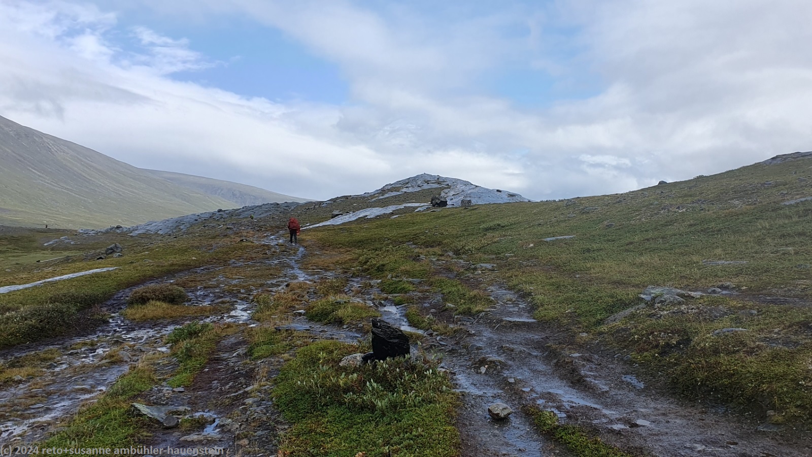 da ein nasser vormittag zu erwarten ist, schlafen wir bis 07:45 uhr. als wir um 09:10 uhr aufbrechen herrscht übles regenwetter. wir folgen nun nicht mehr dem kungsleden, sondern dem als "moderner pilgerweg" bezeichneten "dag hammarskjöldsleden". auf den ersten knapp 3 km überwinden wir 150 höhenmeter. nach der passhöhe wandern wir durch das tal des láddjujohka. als der regen kurz pause macht, setzen wir uns auf einen grossen stein am wegrand und essen einen stengel. der regen hat den pfad in einen schlammigen und pfützenreichen matsch verwandelt. gegen 12:15 uhr finden wir unter einem schrägen felsen etwas schutz und essen unsere brote. als wir wieder aufbrechen schüttet es immer noch. wir kämpfen uns durch sumpf und schlamm. inzwischen sind wir völlig durchnässt. eher überraschend gibt es auf den letzten kilometern doch noch ein paar sonnenstrahlen. kurz nach 14:30 uhr erreichen wir unser tagesziel. die kebnekaise fjällstation ist gemäss aussage der dame am empfang völlig ausgebucht. wir teilen unser 4-bett-zimmer mit einem jungen pärchen. nach einer erfrischenden dusche verbringen wir den nachmittag im gut besuchten aufenthaltsraum des hauptgebäudes. für das nachtessen dürfen wir uns im restaurant ans fenster setzen, das ist toll. um 19 uhr besuchen wir die sauna, den abend verbringen wir im aufenthaltsraum.