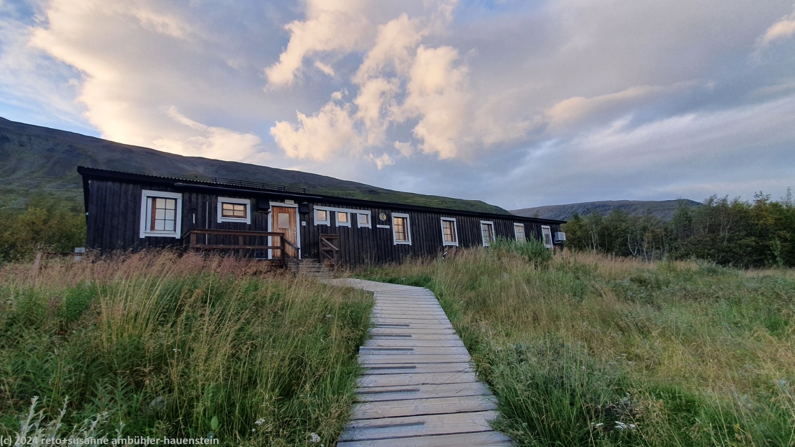 wir geniessen eine mächtig erfrischende dusche, danach setzen wir uns in den aufenthaltsraum des hauptgebäudes. um 17:30 uhr öffnet sich die türe zum restaurant. wir haben das glück, am fenster sitzen zu dürfen. nach einer kurzen präsentation der geschichte von elsa - einer köchin, die 30 jahre im dienst des STF stand - und der bevorstehenden gerichte, dürfen wir uns suppe und brot holen. anschliessend wird rentierfleisch mit risotto und blaubeersosse serviert. als nachspeise gibt es schokoladencreme mit gebrannten mandeln. das schmeckt alles sehr lecker. nach dem essen setzen wir uns nochmals kurz in den aufenthaltsraum, danach geniessen wir eine sitzung in der sauna. ab 19 uhr dürfen hier die damen auch in die herren sauna, so dass susanne und ich zusammen schwitzen können. da unsere zimmergenossen bereits im bett liegen, setzen wir uns noch einmal in den aufenthaltsraum. es herrscht reges treiben und man hört viele verschiedene sprachen. susanne liest, ich schreibe tagebuch und lese danach auch noch etwas. um 21:30 uhr schlüpfen wir in unsere schlafsäcke.