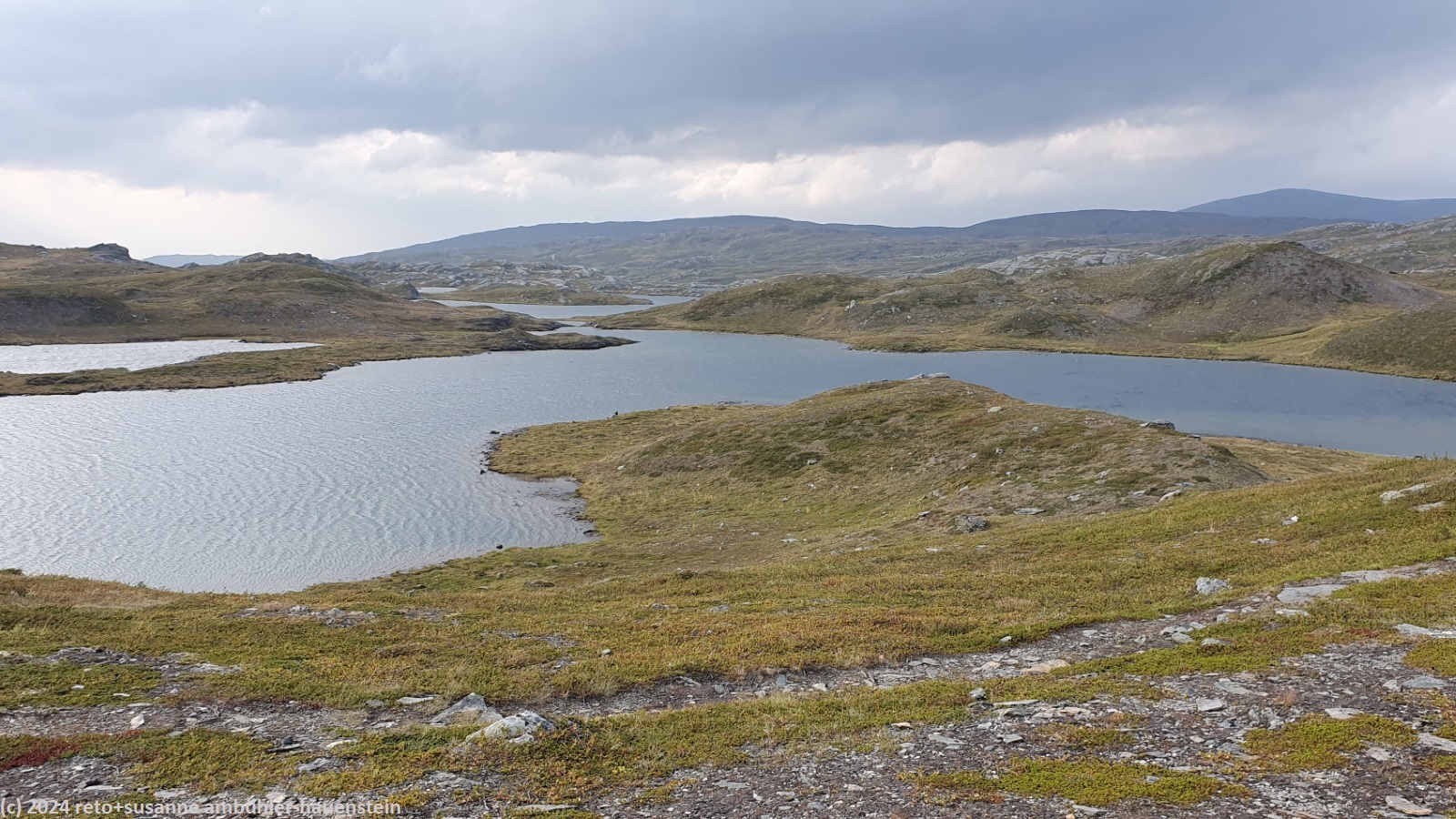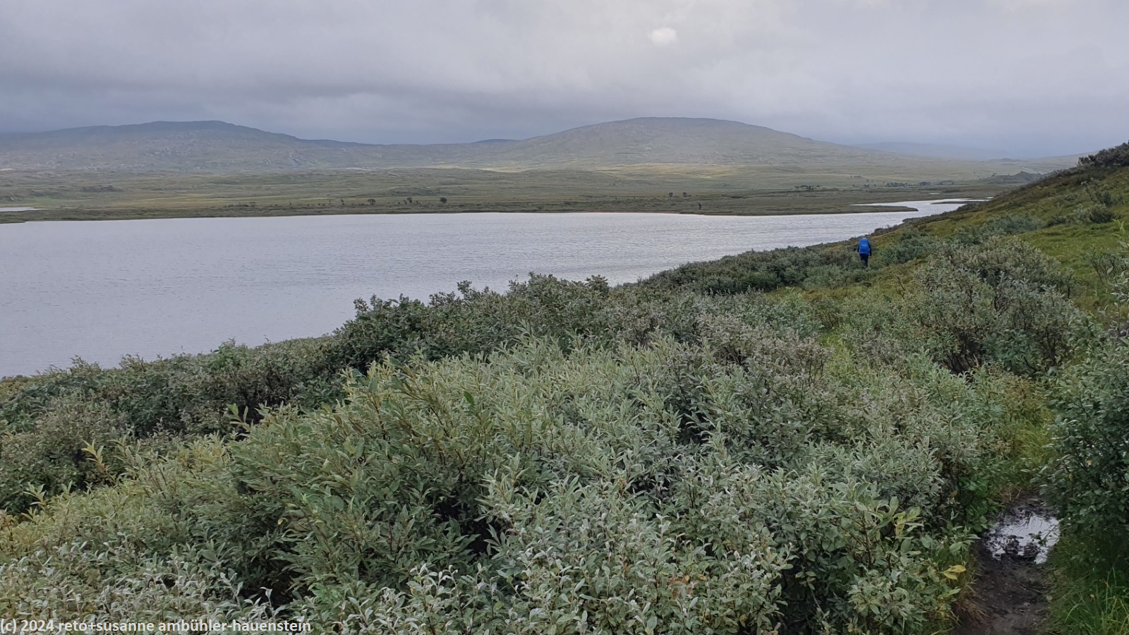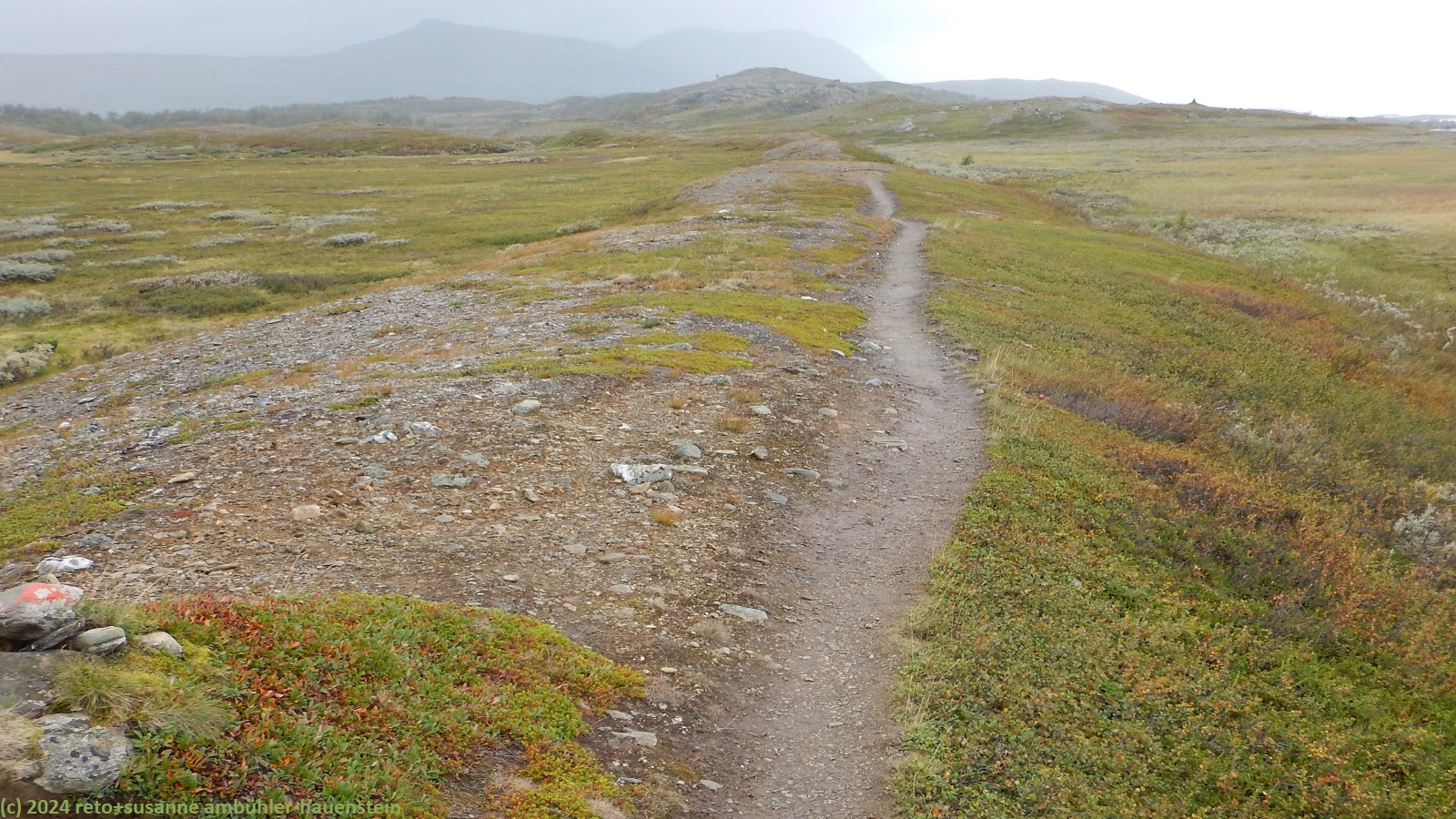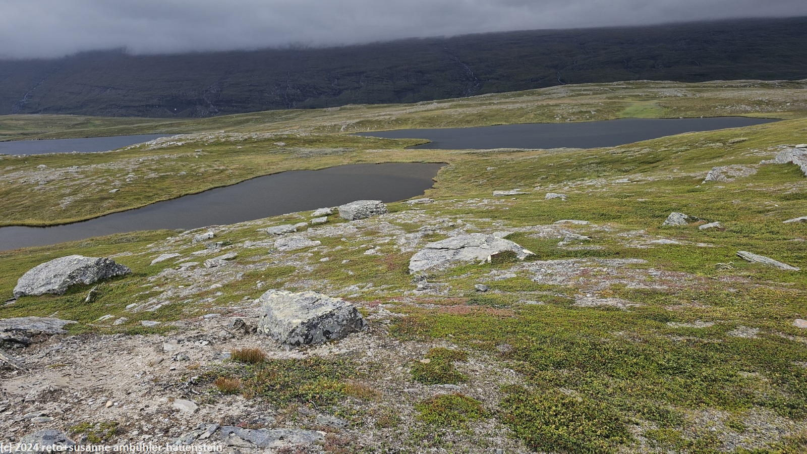 unser handy weckt uns um 7 uhr. die nacht war äusserst ruhig, ich habe sehr gut geschlafen. auch jetzt ist es im haus immer noch völlig still, offenbar sind noch alle gäste am schlafen. wir frühstücken im aufenthaltsraum mit blick auf den see. der himmel ist immer noch sehr verhangen und trüb, der wind bläst wie schon seit tagen. nach dem essen packen wir unsere rucksäcke, danach reinigen wir unser zimmer und den hintereingang. um 08:50 uhr brechen wir auf. wir überqueren die hängebrücke über den gieddejåhkå, danach steigt der weg sanft an. wenig später zweigt der nordkalottleden richtung süden ab. wir folgen dem padjelantaleden vorwiegend ostwärts. anfangs wandern wir durch niedrige birken, bei 630 m.ü.m. kommen wir über die baumgrenze. das kahle fjäll ist sehr grün, dazwischen sehen wir gelbliche und rötliche sträucher. es fällt ein leichter nieselregen, der manchmal etwas intensiver wird, dazwischen aber auch längere pausen macht. susanne hat die regenjacke angezogen, ich laufe im langarm t-shirt. am gieddávrre vorbei geht es ins weite tal des rådoljåhkå. der pfad ist grundsätzlich einfach und bequem zu begehen. er führt abwechslungsweise über offenes gelände und niedrige büsche. manchmal ist der weg ziemlich tief und sehr schmal, so dass nicht beide füsse nebeneinander platz haben. der aufstieg wird immer wieder durch kleine senken unterbrochen, so dass der weg ein bisschen einer berg- und talbahn ähnelt. bei der brücke über den ballavrijåhkå machen wir eine kurze pause. der fluss stürzt über mehrere kleine wasserfälle talwärts und macht einen ziemlichen lärm. ich liebe dieses geräusch. nach zehn minuten brechen wir wieder auf. am gegenüberliegenden hang scheint die sonne. das blaue loch in der wolkendecke ist stets vor uns, aber die sonnenstrahlen erreichen uns nicht. der weg steigt weiter sanft aber kontinuierlich an. wir wandern durch eine weite hochebene. die krete der bergkette rechts von uns ist in den wolken. gelegentlich sehen wir rentiere. gegen mittag finden uns die sonnenstrahlen dann doch noch. um 12:25 uhr picknicken wir in der nähe des ieltijávrásj zwischen grossen steinen.