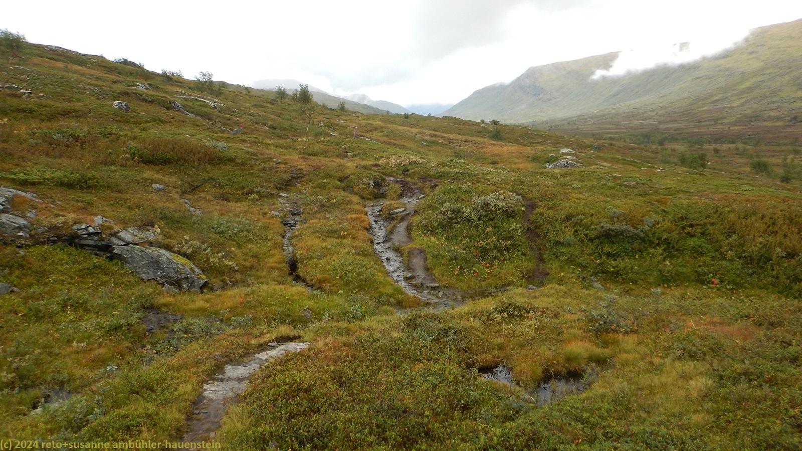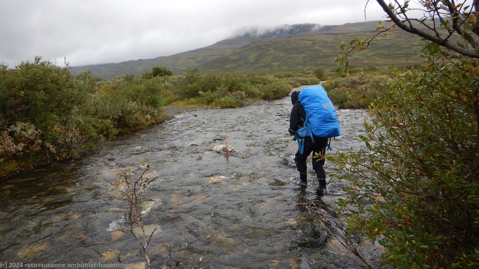 wir schlafen bis 07:15 uhr. das war wiederum eine wunderbare nacht, wir haben göttlich geschlafen. das wetter ist etwas weniger brilliant, der himmel ist verhangen und es fällt ein leichter nieselregen. der wind hat immerhin etwas nachgelassen. während wir in unserer gemütlichen hütte frühstücken, sehen wir den hüttenwart vorbeigehen. er hatte uns gestern gesagt, dass er heute morgen frisches fladenbrot backen werde und wir ab 8 uhr solches bei ihm kaufen könnten. so besuchen wir ihn nach dem frühstück in seinem büro und kaufen zwei scheiben fladenbrot. dabei erfahren wir, dass wir die vergangene nacht im sarek nationalpark verbracht hatten. das waren wir uns gar nicht bewusst. ein blick auf die karte zeigt, dass der sarek hier ein kleines stück in den padjelante nationalpark hineinragt. zurück in der hütte packen wir unsere rucksäcke, wischen den boden und entleeren das abwasser. um 09:30 uhr machen wir uns auf den weg. obwohl der himmel sehr trüb ausschaut, fällt nur ab und zu ein leichter regen. grundsätzlich wandern wir abwärts, aber auch heute ist der pfad ein auf und ab. nach knapp 800 metern gibt es schon die erste flussdurchquerung. wir entscheiden uns, die wanderschuhe auszuziehen und den fluss in unseren trockensocken zu durchqueren. es wäre schlecht, den rest des tages in nassen schuhen gehen zu müssen. wir erreichen das andere flussufer ohne probleme. nun wechseln wir das schuhwerk wieder. mit der durchquerung des gárránisjågåsj haben wir die grenze vom sarek zum padjelanta nationalpark überschritten. wenig später erreichen wir die waldgrenze. nun wechseln sich wilder birkenwald und sumpfiges gelände ab. in ersterem ist der pfad eher holprig, wenn auch nicht so sehr wie auf dem kungsleden, in letzterem geht es meistens über planken. solange wir im padjelanta nationalpark laufen, sind diese in recht gutem zustand. es ist nun meistens trocken, so dass ich meine regenjacke im rucksack verstaue. nach 6 km machen wir einen kurzen halt und essen einen stengel. die landschaft und die beschaffenheit des pfades ändern sich nur wenig. wir wandern durch das breite tal des tarrajåkkå. links und rechts säumen hügelzüge das tal. die kreten sind meistens in wolken gehüllt. nach knapp 11 km erreichen wir die parkgrenze und wechseln in das pärlälvens fjällurskog naturreservat. hier picknicken wir auf einer kleinen anhöhe. wir sehen und hören den tarrajåkkå unten im tal. am wetter ändert sich nichts, es ist trüb und windig, aber entgegen der vorhersage fast immer trocken.
