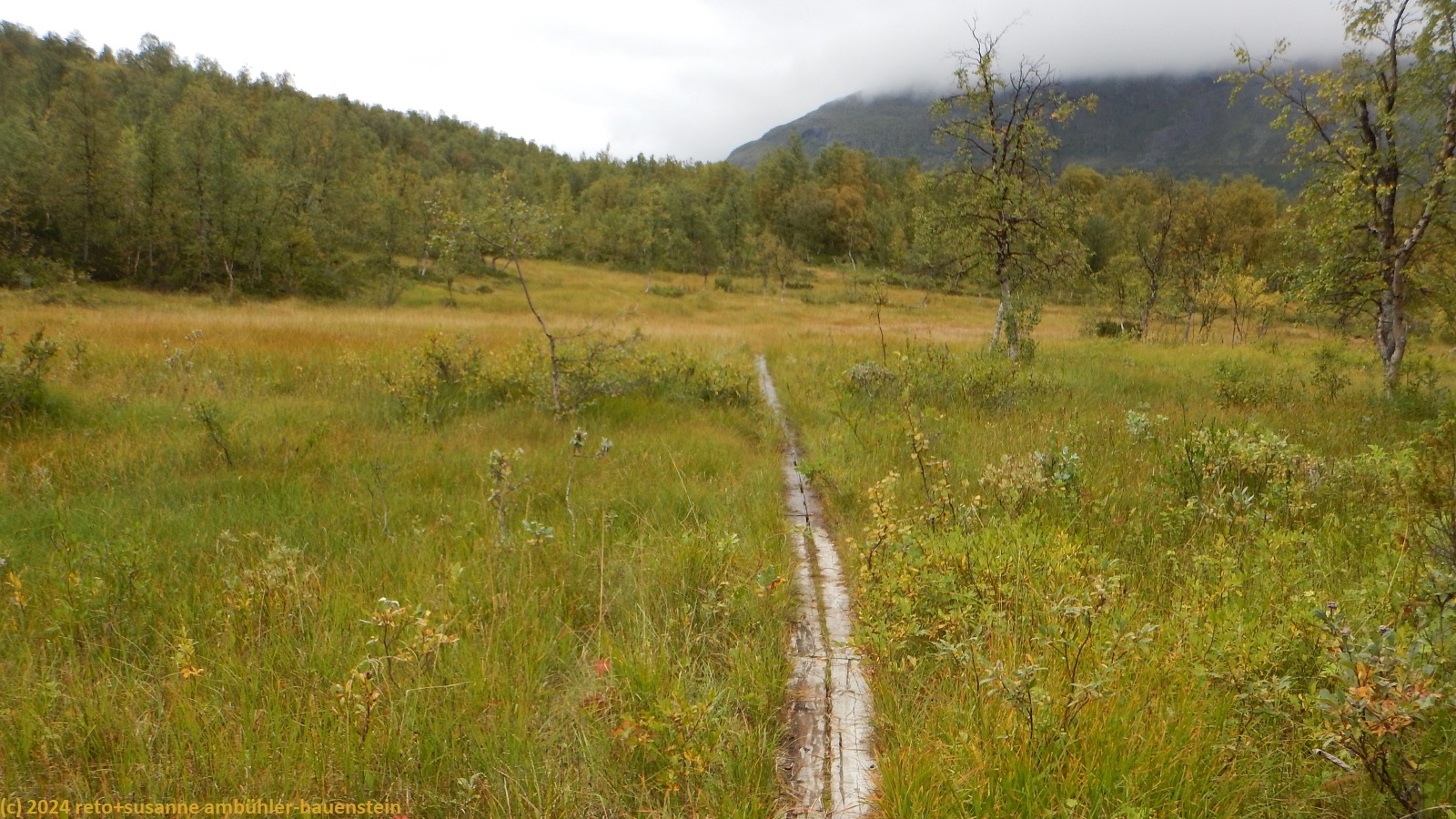 gegen 13:40 uhr brechen wir wieder auf. schon nach wenigen metern überspannt eine hängebrücke mitten im wald einen zufluss des tarrajåkkå. danach geht es wiederum abwechslungsweise durch birkenwald und sumpfgebiete. sowohl der reiseführer als auch der hüttenwart der darreluoppalstugorna warnten uns vor den rutschigen planken ausserhalb des nationalparkes. diese warnungen sind nicht übertrieben, die holzstege sind stellenweise in schlechtem zustand und extrem rutschig, besonders bei diesem nassen wetter. wir rutschen beide je einmal aus, aber ohne folgen. die letzten kilometer führen vorwiegend durch wilden birkenwald. die såmmarlappenstuga taucht erst zwischen den bäumen auf, als wir da sind.