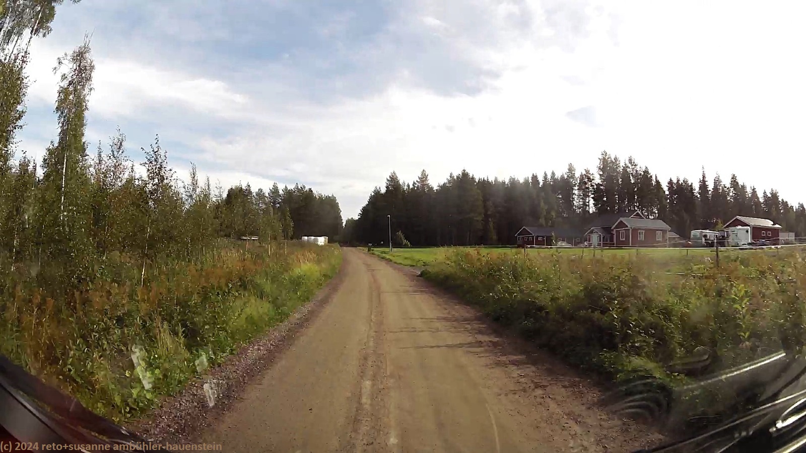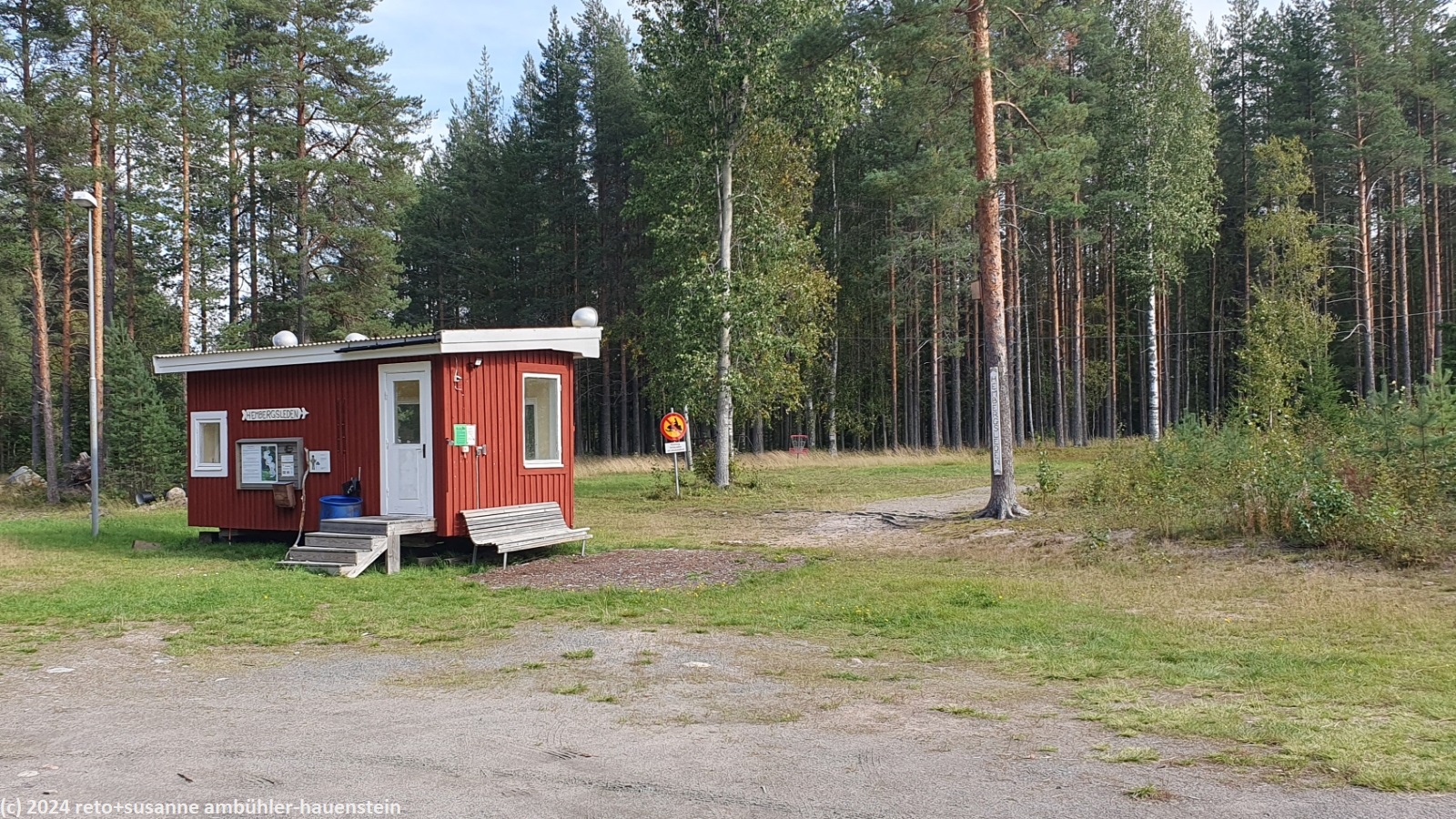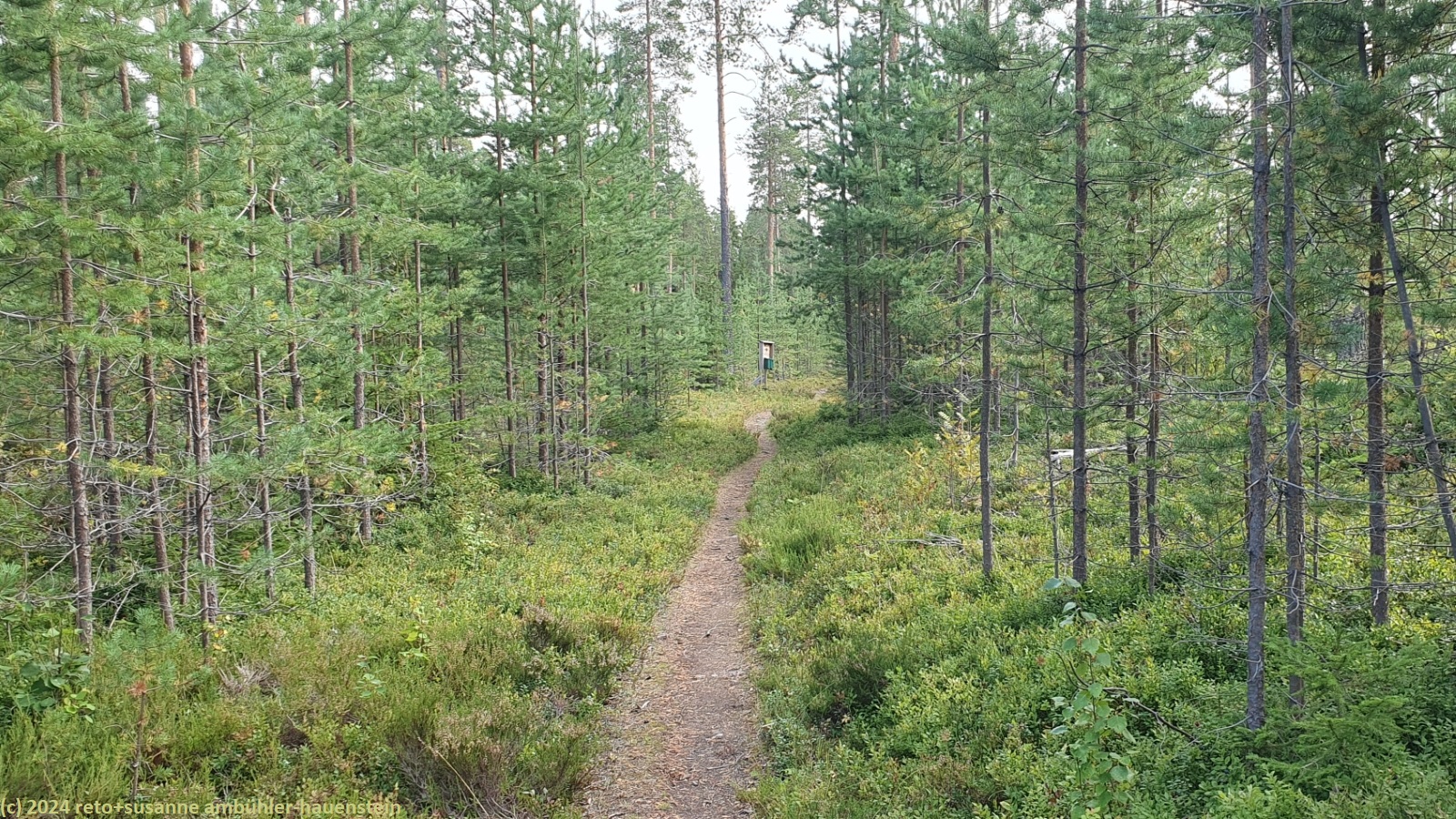wir schlafen bis etwa 08:45 uhr. das wetter ist sehr freundlich, der himmel ist leicht bewölkt, der wind hat nachgelassen. wir gehen zum empfang und verlängern unseren aufenthalt um einen weiteren tag. zurück beim jogi müssen wir feststellen, dass der kayak-o-mat zur zeit nicht verfügbar ist. das ist äusserst blöd, wollten wir doch heute ein doppelkajak ausleihen. gestern hat das ding noch funktioniert, wir hätten ein boot mieten können. wir schauen uns den automaten an, aber da gibt es nichts, was wir tun könnten. drei doppelkajaks sind zum greifen nah und doch nicht benützbar ! auf der website steht zwar, wer für den betrieb verantwortlich ist, aber es gibt nur eine email-adresse und keine telefonnummer für soforthilfe. ich schreibe eine email, aber das wird wohl kaum etwas bringen. wir frühstücken im freien, danach überlegen wir uns, was wir tun wollen. es gibt noch den luleå kajakklubb, aber dort ist für heute kein boot verfügbar und doppelkajaks gibt es keine. wir fragen beim empfang nach. die dame bemüht sich zwar, einen kontakt für den kayak-o-mat oder einen weiteren verleih zu finden, aber viel schaut dabei nicht heraus. ich rufe die nummer an, die sie gefunden hat, aber der typ dort ist total im stress und mit irgendeiner baustelle beschäftigt, so dass er nicht wirklich zeit hat für uns. nach weiteren recherchen entschliessen wir uns, für morgen beim kajakclub zwei einzelkajaks zu mieten. dort funktioniert zumindest die website, hoffentlich klappt es dann auch mit der ausleihe. für heute entscheiden wir uns, eine wanderung über den hembergsleden zu machen. susanne hat die beschreibung dieser kurzwanderung in einer online broschüre gefunden. wir fahren nach ersnäs, dort ist der ausgangspunkt der rundwanderung. die anfahrt ist ziemlich spektakulär. von der E4 geht es erst über eine holprige strasse durch den ort und dann über feldwege zu einem kleinen parkplatz am waldrand.
