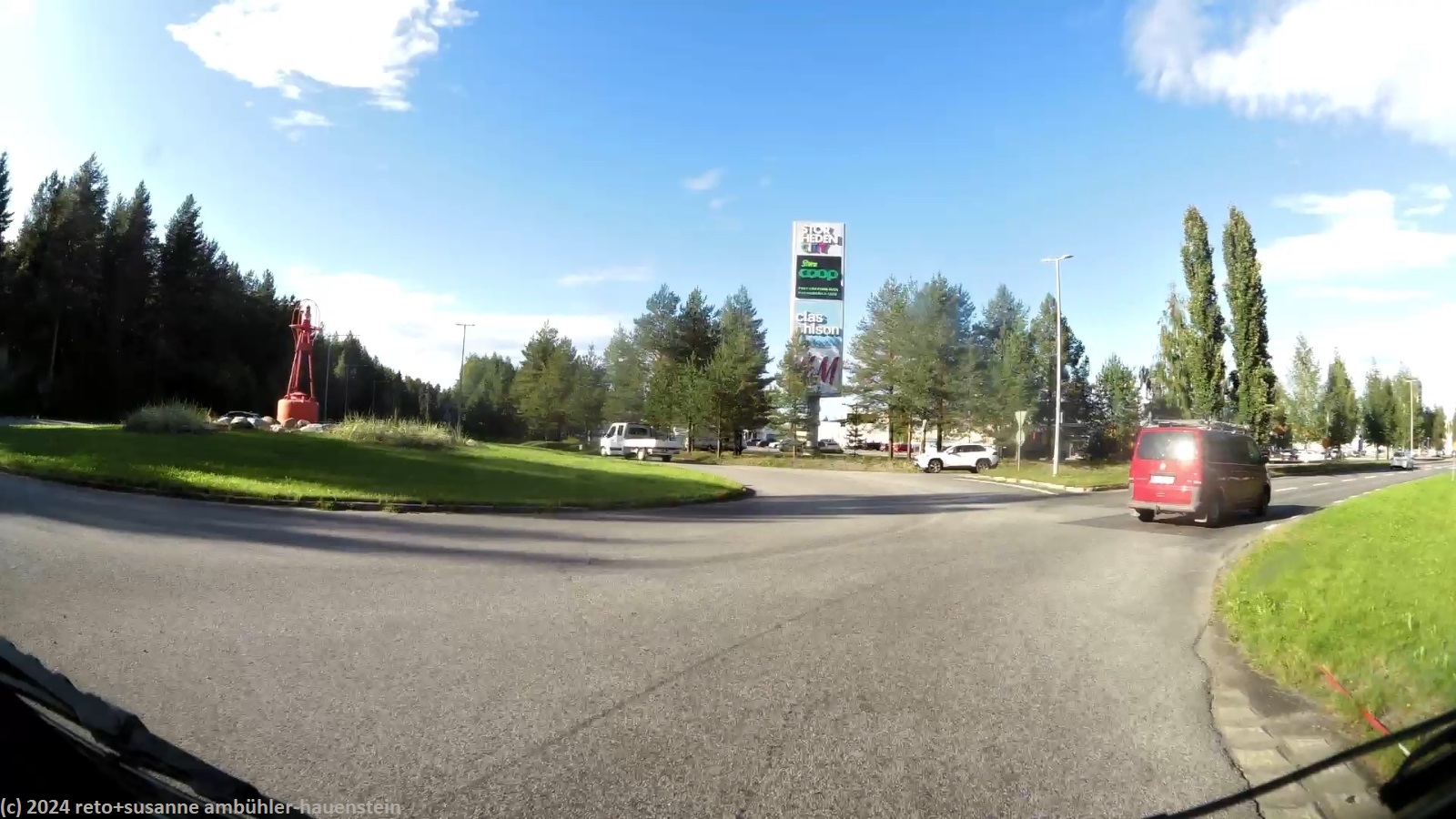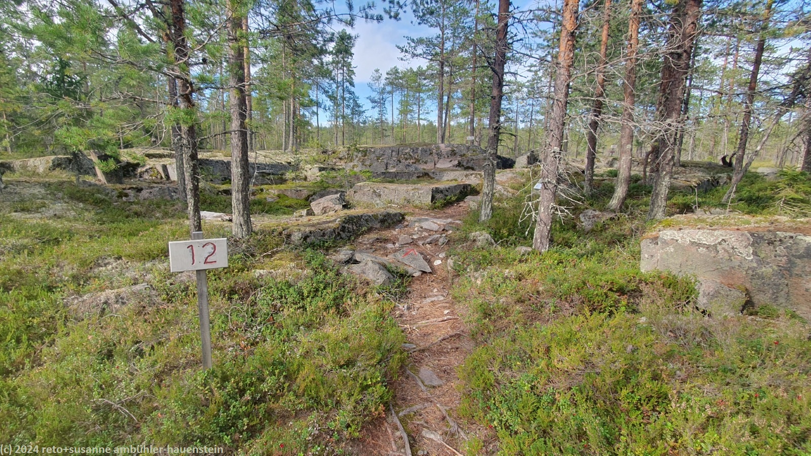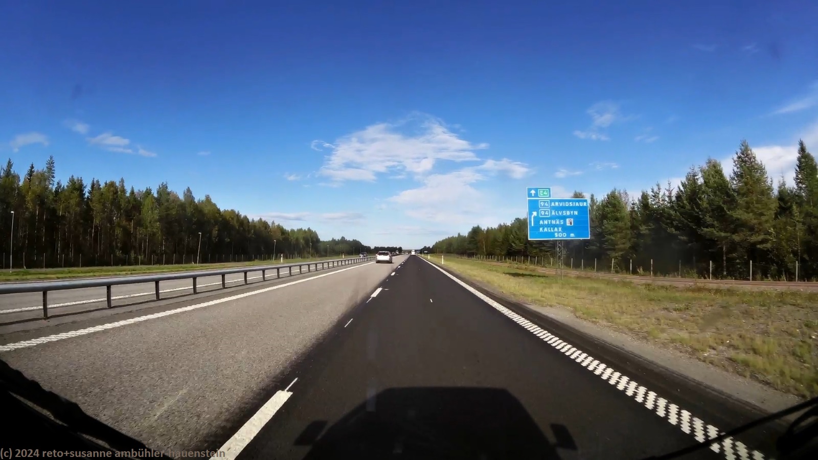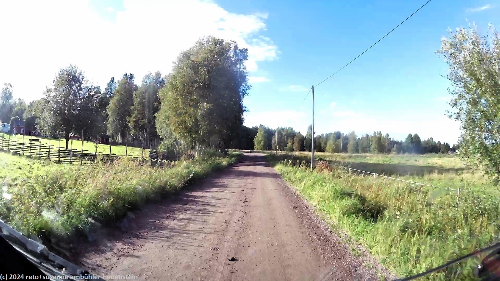 wir schlafen bis etwa 08:45 uhr. das wetter ist sehr freundlich, der himmel ist leicht bewölkt, der wind hat nachgelassen. wir gehen zum empfang und verlängern unseren aufenthalt um einen weiteren tag. zurück beim jogi müssen wir feststellen, dass der kayak-o-mat zur zeit nicht verfügbar ist. das ist äusserst blöd, wollten wir doch heute ein doppelkajak ausleihen. gestern hat das ding noch funktioniert, wir hätten ein boot mieten können. wir schauen uns den automaten an, aber da gibt es nichts, was wir tun könnten. drei doppelkajaks sind zum greifen nah und doch nicht benützbar ! auf der website steht zwar, wer für den betrieb verantwortlich ist, aber es gibt nur eine email-adresse und keine telefonnummer für soforthilfe. ich schreibe eine email, aber das wird wohl kaum etwas bringen. wir frühstücken im freien, danach überlegen wir uns, was wir tun wollen. es gibt noch den luleå kajakklubb, aber dort ist für heute kein boot verfügbar und doppelkajaks gibt es keine. wir fragen beim empfang nach. die dame bemüht sich zwar, einen kontakt für den kayak-o-mat oder einen weiteren verleih zu finden, aber viel schaut dabei nicht heraus. ich rufe die nummer an, die sie gefunden hat, aber der typ dort ist total im stress und mit irgendeiner baustelle beschäftigt, so dass er nicht wirklich zeit hat für uns. nach weiteren recherchen entschliessen wir uns, für morgen beim kajakclub zwei einzelkajaks zu mieten. dort funktioniert zumindest die website, hoffentlich klappt es dann auch mit der ausleihe. für heute entscheiden wir uns, eine wanderung über den hembergsleden zu machen. susanne hat die beschreibung dieser kurzwanderung in einer online broschüre gefunden. wir fahren nach ersnäs, dort ist der ausgangspunkt der rundwanderung. die anfahrt ist ziemlich spektakulär. von der E4 geht es erst über eine holprige strasse durch den ort und dann über feldwege zu einem kleinen parkplatz am waldrand.
