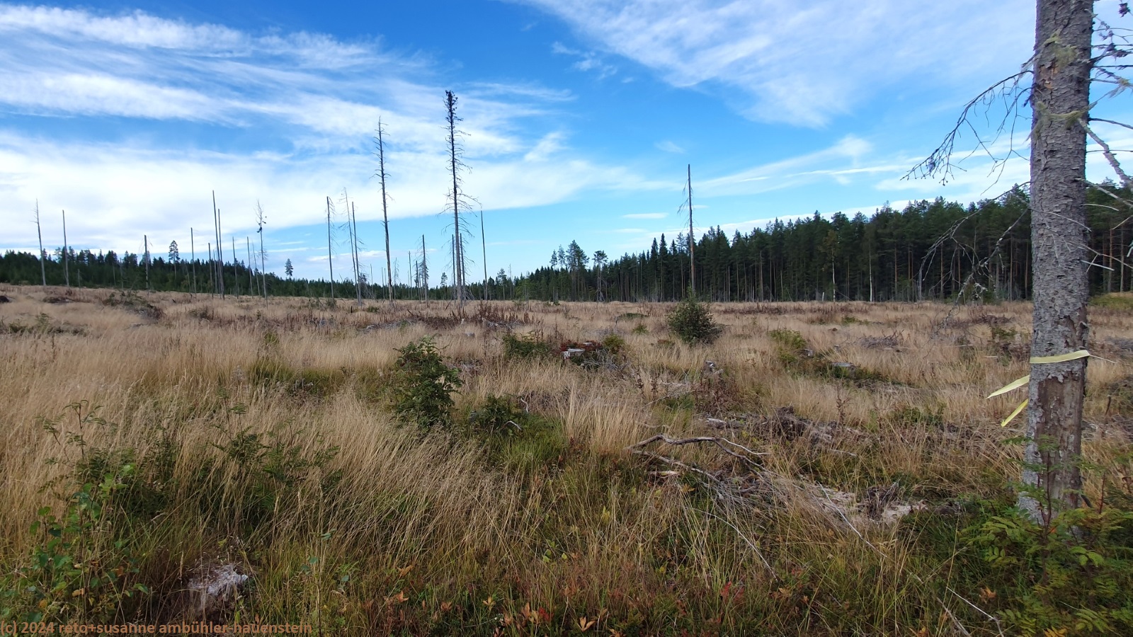 im winter ist hier ein ausgangspunkt für langlauf. bevor wir aufbrechen, essen wir beim grillplatz zu mittag. ein älterer herr taucht auf um mit seinem hund im wald spazieren zu gehen. er ist sehr erstaunt, hier touristen aus der schweiz anzutreffen und will wissen, wie wir diesen wanderweg gefunden haben. kurz vor 14 uhr brechen wir auf. bei einem kleinen haus finden wir eine broschüre, welche die 22 punkte von interesse entlang der route beschreibt. anfangs folgen wir einem etwas breiteren waldweg, der im winter als beleuchtete langlaufloipe genutzt wird. dann zweigt ein schmalerer pfad ab. wir gehen durch einen sehr schönen wald. bei den informationstafeln erfahren wir einiges über den wald und seine nutzung. eine besonderheit in ersnäs ist gemäss broschüre, dass der wald nicht dem staat, sondern den lokalen bauern gehört. früher wurde der wald ganz unterschiedlich genutzt. es gibt bereiche, da ist der boden sehr sandig. diesen sand hat man stellenweise abgebaut und für bauarbeiten genutzt. an anderen stellen wurden steine von hand gebrochen und für den bau von fundamenten für häuser verwendet. natürlich wird auch das holz genutzt. wir wandern durch ein gebiet, in welchem vor acht jahren eine kahlrodung gemacht wurde. gemäss broschüre dauert es 100 jahre, bis der wald soweit nachgewachsen ist, dass er wieder gerodet werden kann. seit einigen jahren wird in schweden mehr wald aufgeforstet als gerodet, so dass die waldfläche wieder zunimmt. als wir zum höchsten punkt aufsteigen - der "gipfel" liegt auf 95 m.ü.m - begegnen wir kurz nacheinander zwei schlangen. die erste ist fast vollständig schwarz und etwas grösser, die zweite ist dunkelbraun und deutlich kleiner. susanne meint, dass beide kreuzotter waren. in der nähe des gipfels hat es einen picknickplatz und einen aussichtsturm. letzterer ist vielleicht 4 m hoch. die rundsicht ist wegen der vielen bäume ziemlich begrenzt. in der ferne sehen wir immerhin einen grösseren bauernhof und im hintergrund eine meeresbucht. um 16 uhr sind wir wieder beim jogi.