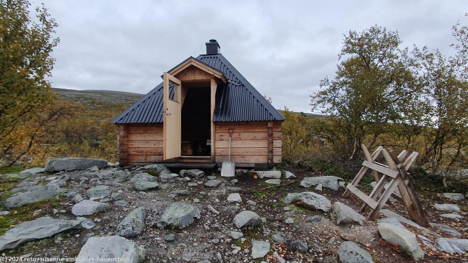 wir essen nur einen teil davon, einiges nehmen wir mit auf unsere wanderung. nach dem üppigen frühstück reinigen wir unsere hütte, dann melden wir uns bei unserer gastgeberin ab. wir wandern dem malmagen entlang am uns wohlbekannten campingplatz "fjällnäs camping & lodges" vorbei - dort haben wir vergangenes jahr vor und nach unserer wanderung über den nördlichen teil des südlichen kungsleden übernachtet, siehe tagebücher vom 27-jul-2023 und vom 05-aug-2023. leider endet der weg nach knapp 800 meter und wir müssen 1.5 km der landstrasse entlang gehen. glücklicherweise fahren hier sehr wenige autos. kurz nach dem mächtigen wasserfall zu unserer linken biegen wir nach rechts auf eine unbefestigte mautstrasse ab. diese steigt enorm steil an. während wir an höhe gewinnen, setzt der angekündigte regen ein. ich schütze mich erst mit dem schirm, aber als wir über die baumgrenze kommen, nimmt der wind stark zu und es bleibt mir nichts anderes übrig, als auch das regenzeug anzuziehen. je höher wir auf das kahle fjäll kommen, umso widerlicher wird das wetter. der wind wird immer heftiger und bläst uns den regen ins gesicht. nach etwa 5 km meint susanne: "warum tun wir uns dies noch an ?". die wettervorhersage war wirklich übel, wir hätten doch noch ein oder zwei tage warten können, meint sie. da wir die hütten entlang der route alle schon gebucht und bezahlt haben, ist eine verschiebung zwar nicht unmöglich, aber halt doch aufwändig. und so trotzen wir dem wetter und wandern bei garstigsten bedingungen über das bestimmt wunderschöne fjäll, wenn man es sehen könnte. in einer senke machen wir einen kurzen halt und essen einen stengel. bis zur ersten hütte sind es etwas mehr als 28 km. unser plan ist es, etwa die hälfte zu gehen und dort im zelt zu übernachten. morgen wollen wir dann den rest bewältigen. aber da, wo ich die übernachtung geplant hatte, ist nicht daran zu denken, das zelt aufzubauen. es giesst und stürmt und so gehen wir einfach weiter. gemäss reiseführer hat es nach etwa 18 km eine schutzhütte, die allerdings in einem üblen zustand sein soll. aber egal wie schmutzig die schützhütte auch sein soll, sie bietet uns hoffentlich etwas schutz vor dem wetter. so marschieren wir tapfer weiter. der weg wird immer holpriger, hohe und rutschige steine versperren den weg bzw. wollen überstiegen werden. gegen 16:45 uhr erreichen wir die schutzhütte und erleben eine äusserst erfreuliche überraschung: die hütte ist ganz neu und in tadellosem zustand.
