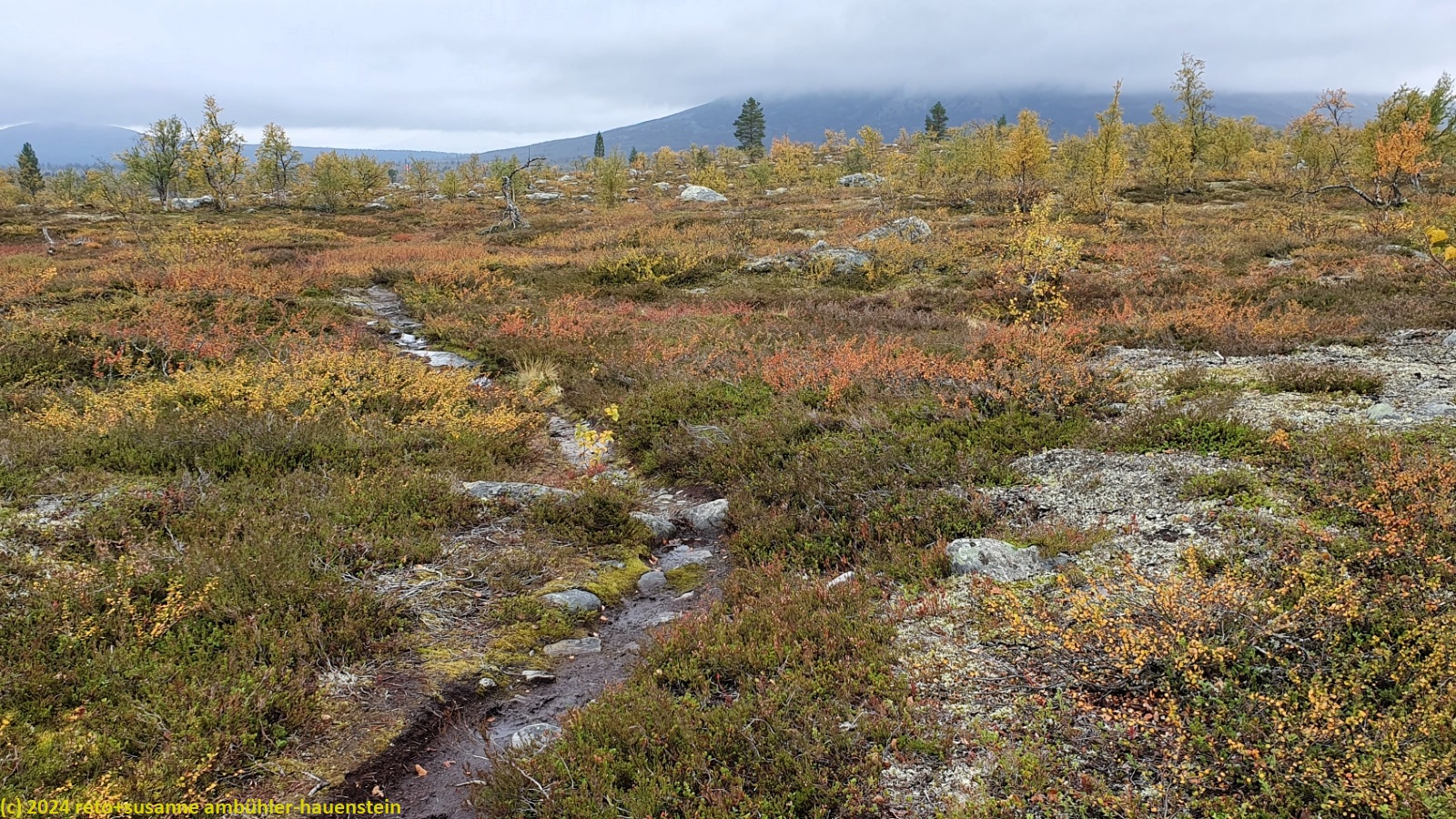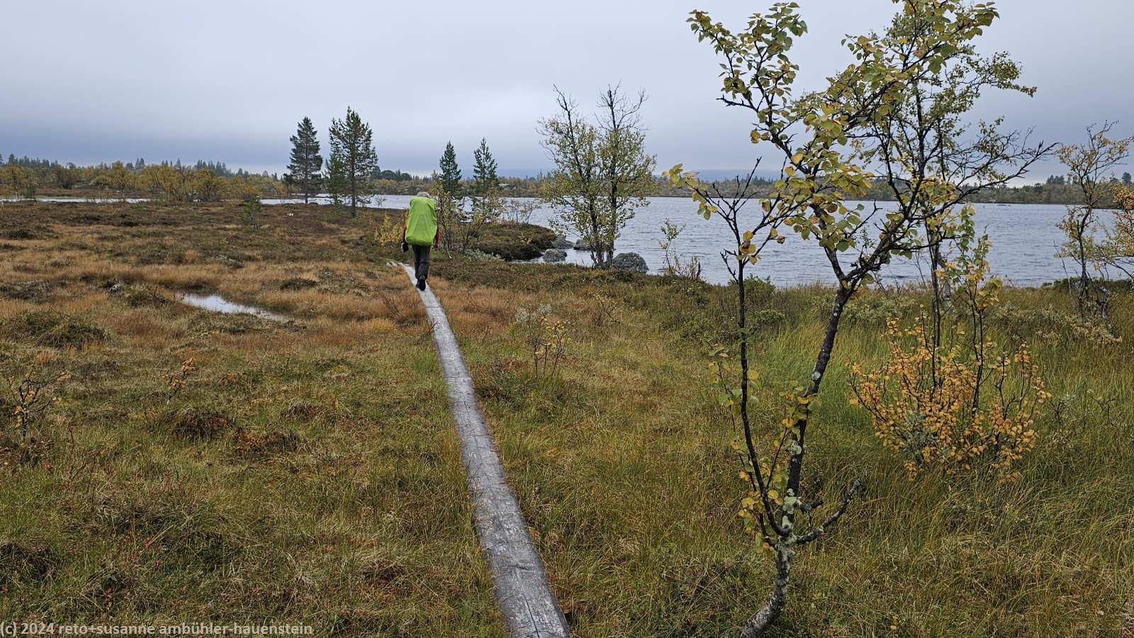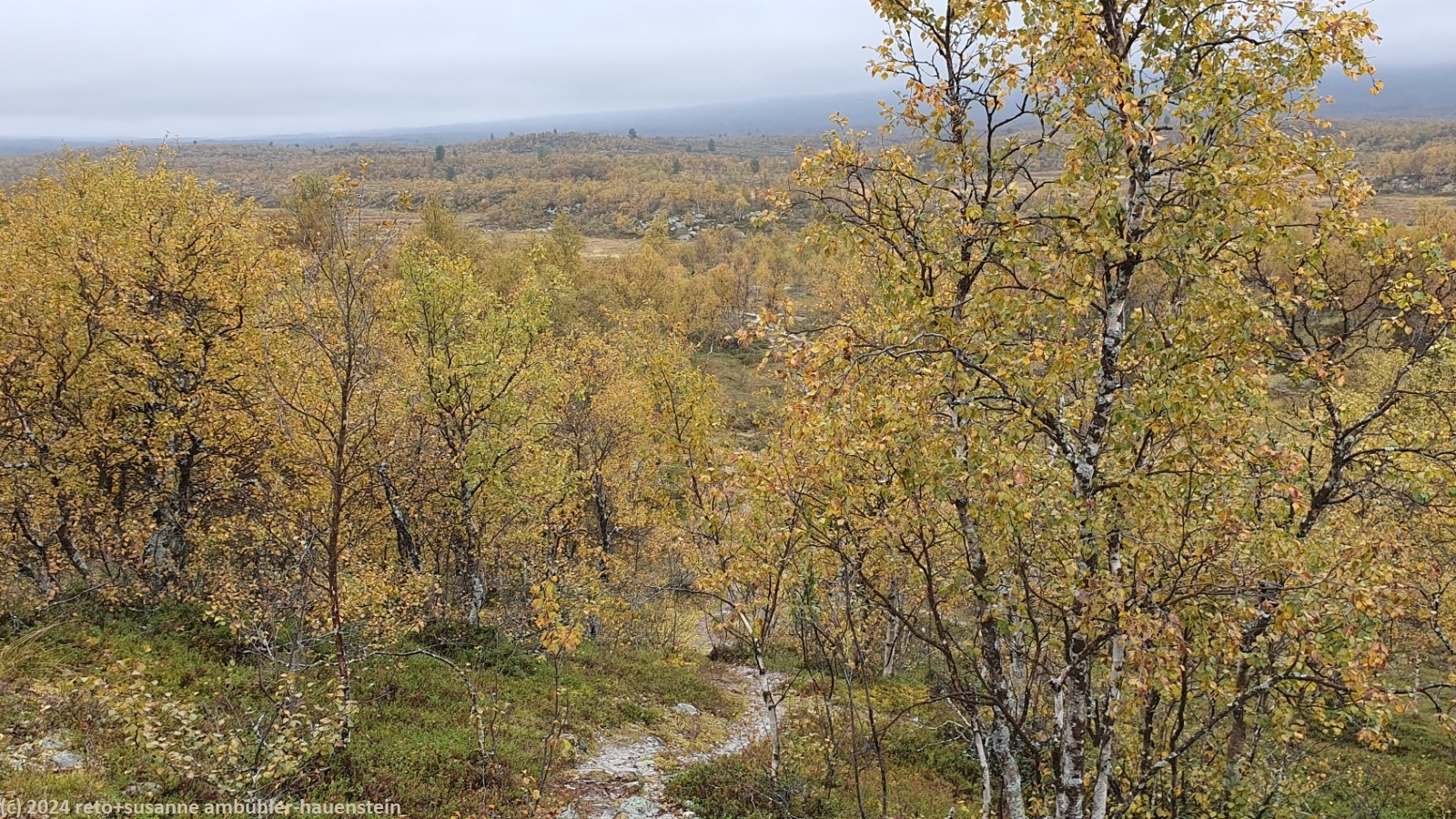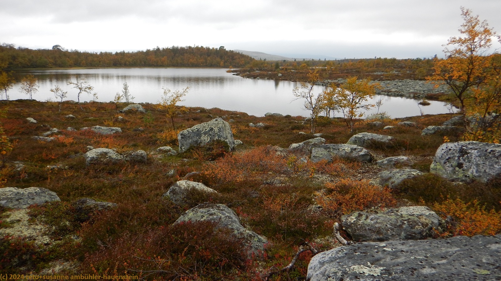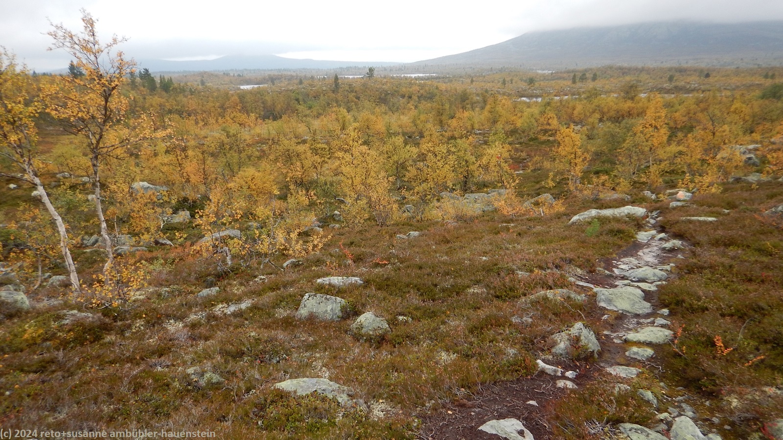 es bleibt den ganzen vormittag trocken, das ist sehr angenehm. gegen 10:15 uhr sind wir abmarschbereit. auch wenn der himmel verhangen ist, so sehen wir nun, durch was für eine wundervolle landschaft wir wandern. die kleinen birken haben alle gelbe blätter, es ist richtig herbst geworden. der weg ist weiterhin sehr holprig und mühsam zu gehen. da der boden immer noch sehr nass ist, sind die steine heimtükisch rutschig. immerhin sind die planken gut zu begehen, auch wenn ich nie ganz überzeugt bin, dass es nicht doch glitschige stellen hat. grundsätzlich ist der weg extrem nass, immer wieder müssen wir kleine sumpfgebiete umgehen. wir kommen deshalb etwas weniger rasch voran als gedacht. auch die handvoll kleine bäche, die es zu überqueren gilt, bremsen unser vorankommen. plötzlich kommt uns zwischen den steinen ein mann entgegen. er begrüsst uns mit den worten "did you take the bus?". ich bin ziemlich perplex und frage mich, wie er das wohl meint ? aber susanne erkennt den mann. er sass im gleichen bus von sveg nach funäsdalen wie wir, stieg aber etwas früher aus. wir unterhalten uns kurz. er meint, der weg bis zur skedbrostuga werde nicht besser. nach gut 2.5 km laufen wir über einen felsrücken zwischen zwei seen, das sieht toll aus. um 12 uhr machen wir einen kurzen halt.