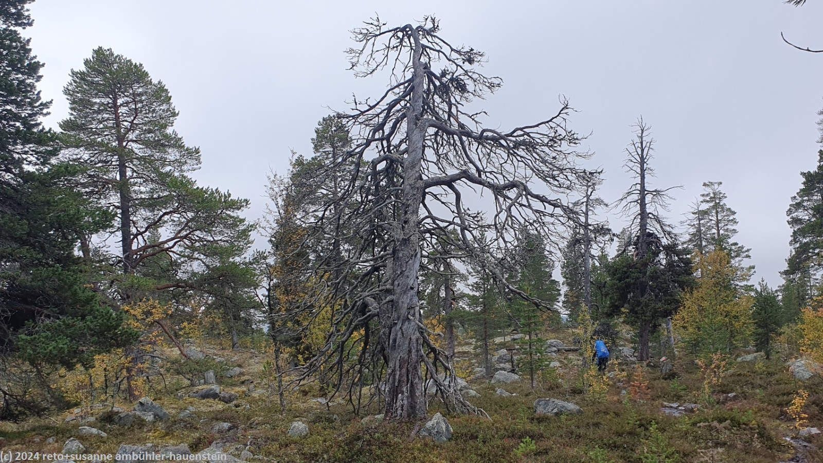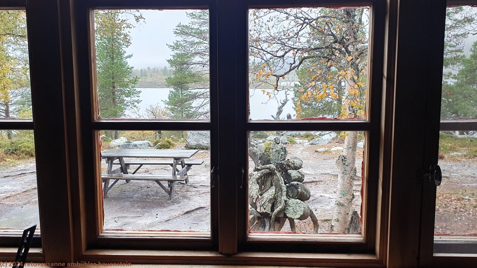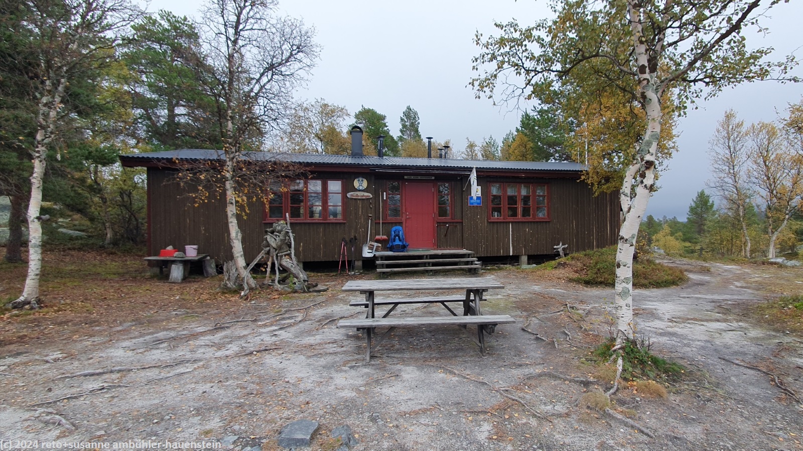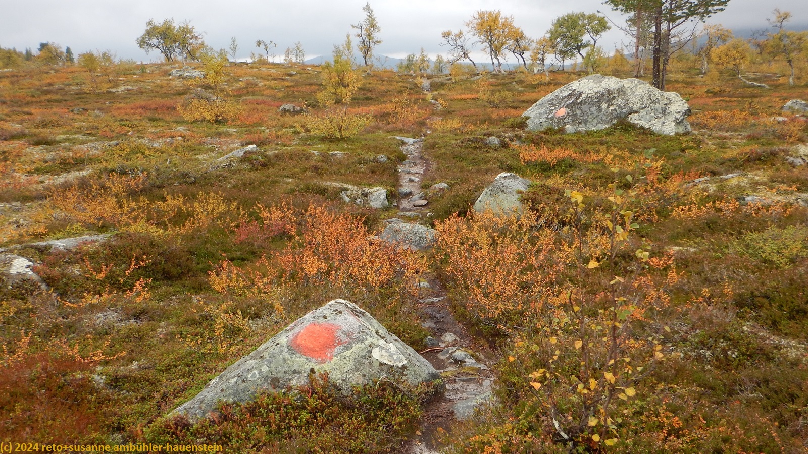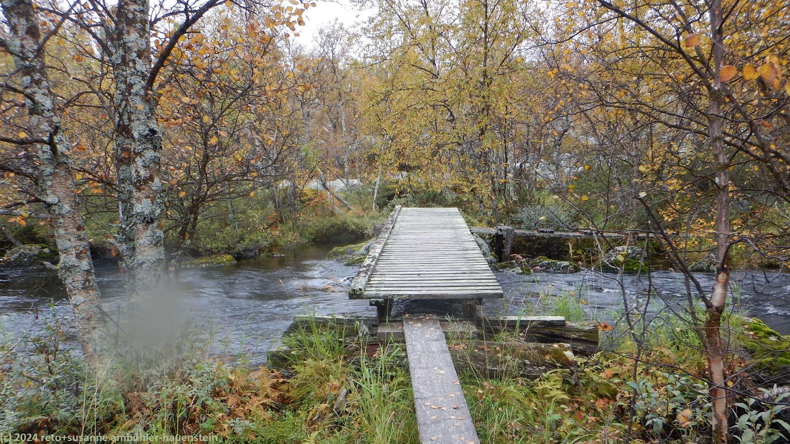 es bleibt den ganzen vormittag trocken, das ist sehr angenehm. gegen 10:15 uhr sind wir abmarschbereit. auch wenn der himmel verhangen ist, so sehen wir nun, durch was für eine wundervolle landschaft wir wandern. die kleinen birken haben alle gelbe blätter, es ist richtig herbst geworden. der weg ist weiterhin sehr holprig und mühsam zu gehen. da der boden immer noch sehr nass ist, sind die steine heimtükisch rutschig. immerhin sind die planken gut zu begehen, auch wenn ich nie ganz überzeugt bin, dass es nicht doch glitschige stellen hat. grundsätzlich ist der weg extrem nass, immer wieder müssen wir kleine sumpfgebiete umgehen. wir kommen deshalb etwas weniger rasch voran als gedacht. auch die handvoll kleine bäche, die es zu überqueren gilt, bremsen unser vorankommen. plötzlich kommt uns zwischen den steinen ein mann entgegen. er begrüsst uns mit den worten "did you take the bus?". ich bin ziemlich perplex und frage mich, wie er das wohl meint ? aber susanne erkennt den mann. er sass im gleichen bus von sveg nach funäsdalen wie wir, stieg aber etwas früher aus. wir unterhalten uns kurz. er meint, der weg bis zur skedbrostuga werde nicht besser. nach gut 2.5 km laufen wir über einen felsrücken zwischen zwei seen, das sieht toll aus. um 12 uhr machen wir einen kurzen halt.