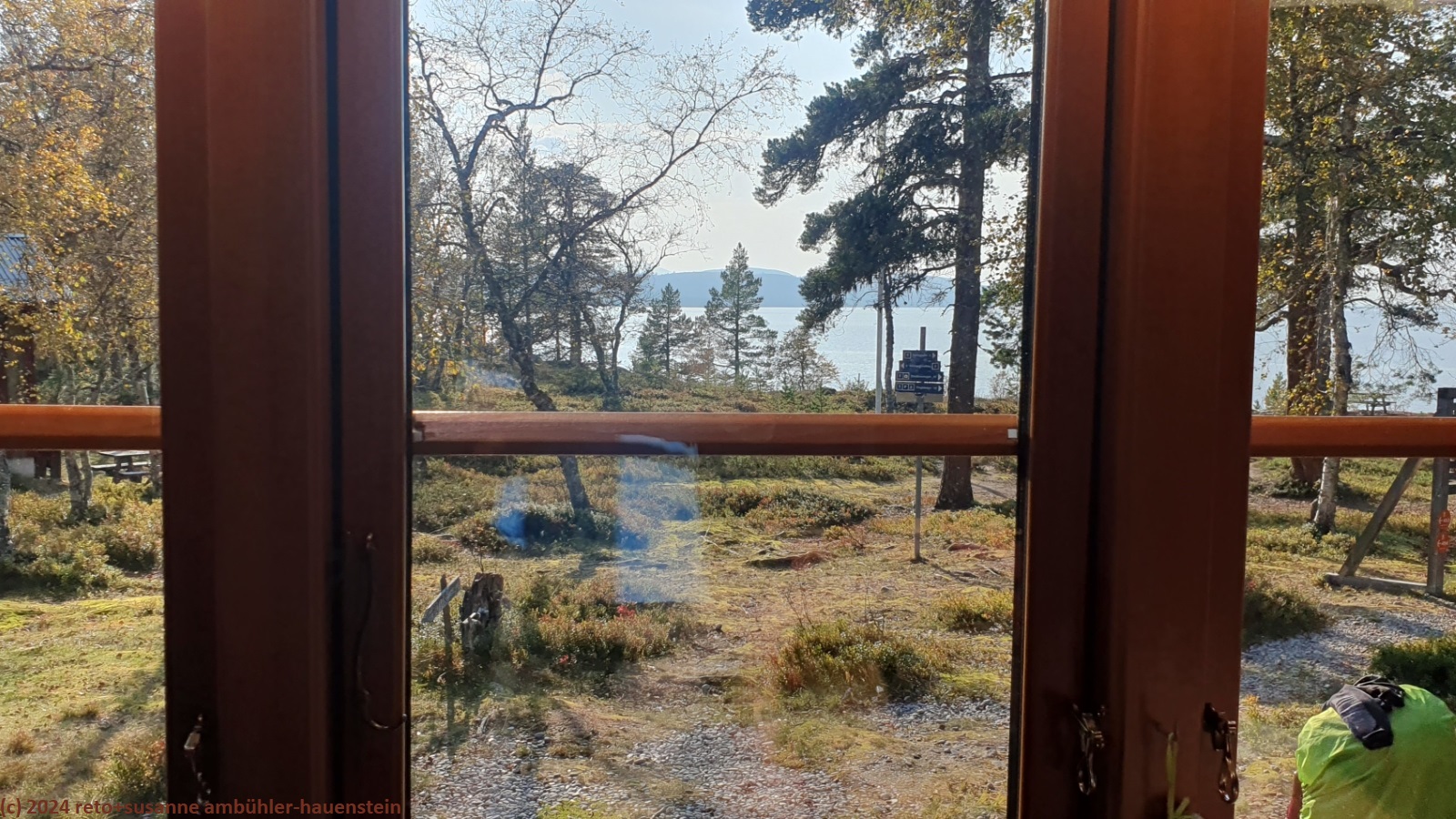 die aussicht von der hütte auf den rogen und die dahinterliegenden berge ist fantastisch. der hüttenwart begrüsst uns freundlich und meint, wir seien im moment die einzigen gäste. er erwartet noch ein schwedisches paar, welches aber erst spät ankommen wird. wir erhalten ein glas preiselbeersaft, der schmeckt fantastisch. auch diese stuga hat zwei räume mit je zwei schlafnischen. allerdings gibt es hier nur vier betten pro nische und nicht fünf, wie in den meisten anderen hütten dieser art. wir dürfen den einen raum in beschlag nehmen.
