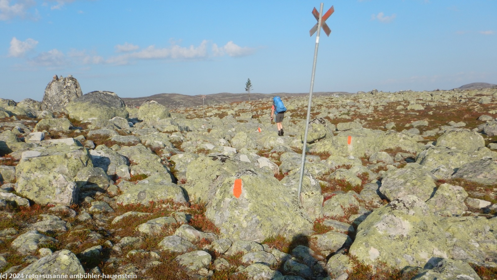 ein einzelner wanderer gesellt sich wenig später zu uns und kocht etwas abseits sein mittagessen. kurz nach 13:30 uhr brechen wir wieder auf. auf dem rückweg zum pfad füllen wir unsere wasserflaschen auf. bis auf weiteres ändert sich nicht viel an der landschaft. um 14:45 uhr machen wir nochmals kurz rast, essen einen stengel und trinken wasser. über einen mehr oder weniger steinigen weg geht es auf der flanke des jakobshöjden bergwärts. hoch über uns sehen wir einen markanten antennenmasten. am höchsten punkt machen wir noch einmal einen kurzen halt. nun geht es mit angenehmem gefäll talwärts. als wir die waldgrenze erreichen, wird der weg steiler und noch einmal richtig holprig. interessanterweise gibt es zahlreiche wegweiser, aber keinen, der richtung grövelsjön fjällstation zeigt. unser navi führt uns aber zielsicher direkt dorthin. um 16:30 uhr haben wir das tagesziel und damit auch das ende dieser mehrtageswanderung glücklich erreicht.
