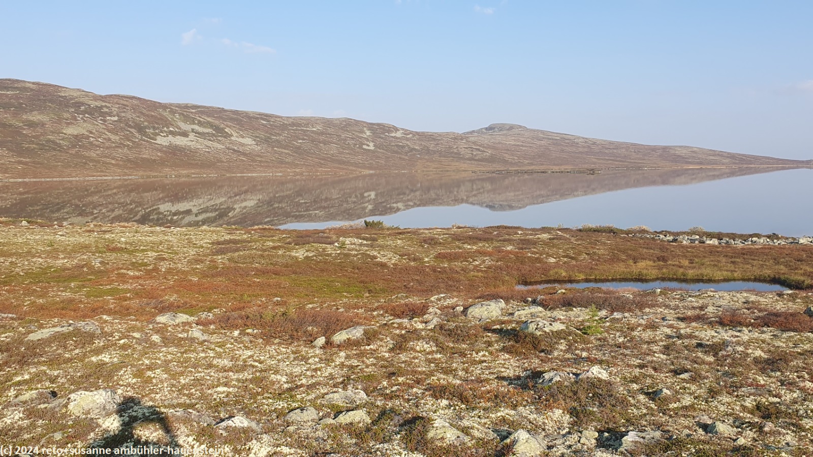 als wir um 06:30 uhr aufstehen, geht gerade die sonne auf. knapp eineinhalb stunden später brechen wir auf. über die flanke des brattbäckvålen geht es zum slagusjön hinauf. in dessen oberfläche spiegelt sich der dahinter liegende hügelzug ganz fantastisch. ein langgezogener abstieg bringt uns zum ufer des hävlingen hinunter, wo wir einen ersten kurzrast machen. um das südliche ende des sees herum gelangen wir zum aufstieg richtung långfjället. gegen 12:45 uhr sind wir bei der schutzhütte särsjönbäcken. diese befindet sich etwas abseits des weges. auf der treppe geniessen wir unser mittagessen. auf den nächsten knapp 6 km gilt es nocheinmal etwas mehr als 100 höhenmeter zu überwinden. auf halber höhe und beim höchsten punkt machen wir je eine kurze pause. danach geht es zu unserem tagesziel - der grövelsjön fjällstation - hinunter. um 16:30 uhr sind wir bei der fjällstation. endlich haben wir die möglichkeit, unsere rucksäcke zu wägen. nach einer erfrischenden dusche geniessen wir ein köstliches abendessen im wunderschönen speisesaal der fjällstation. den abend verbringen wir im leseraum. gegen 21:15 uhr gehen wir schlafen.