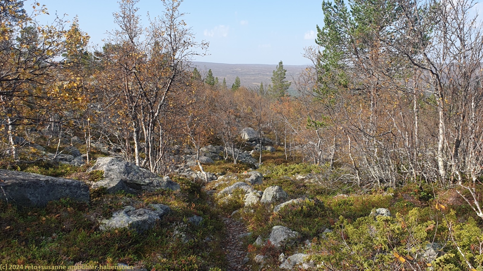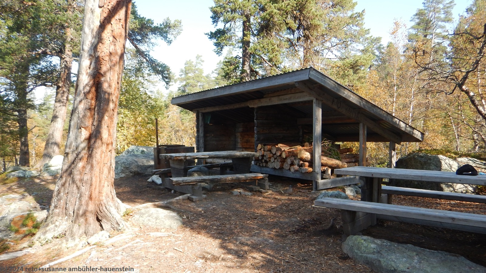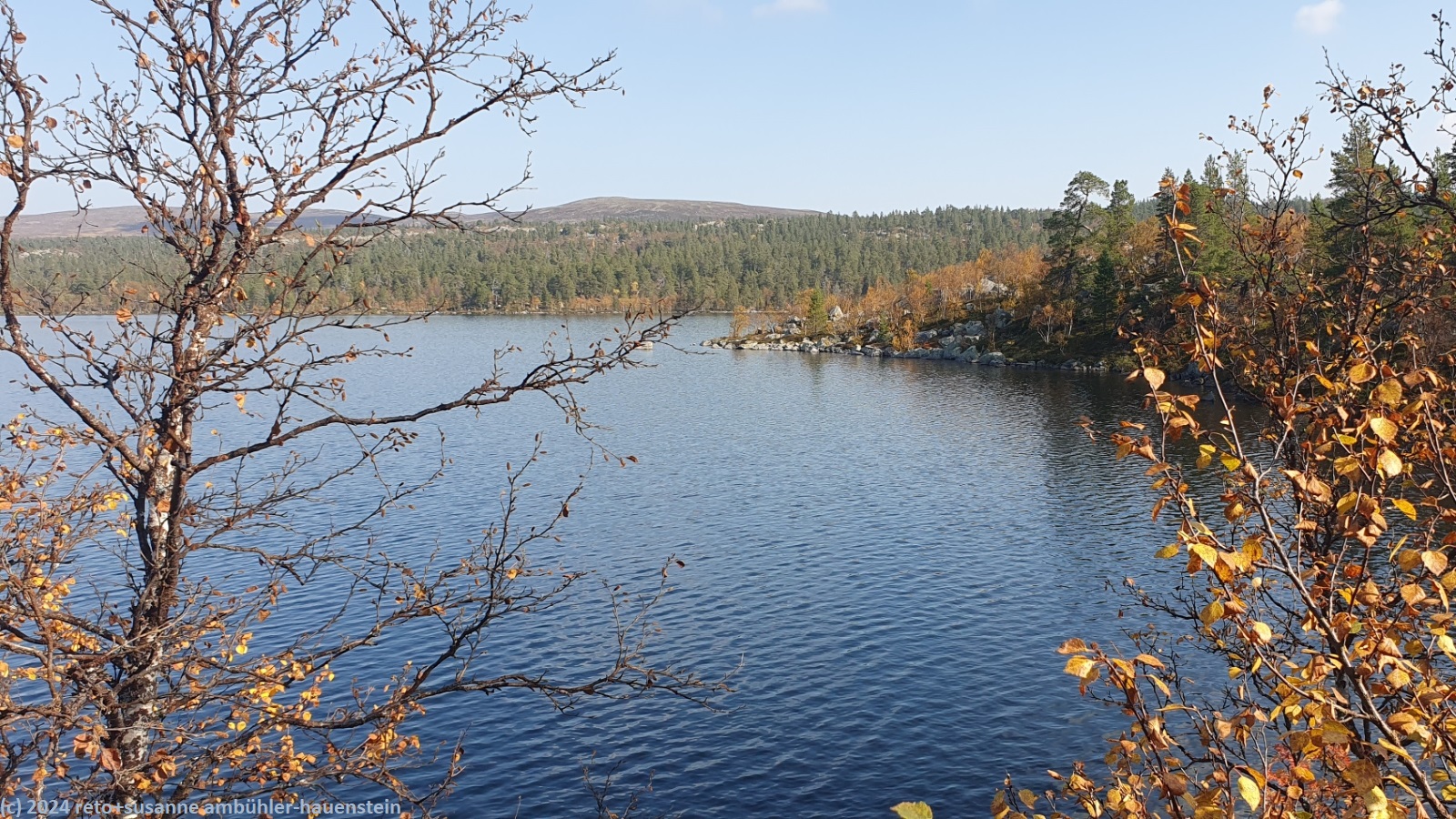 nach 15 minuten brechen wir wieder auf. eine brücke führt über die verbindung zwischen dem hävlingen und dem särsjön. hier füllen wir unsere trinkflaschen auf. der pfad folgt nun ein kurzes stück dem südlichen seeufer. wir haben eine fantastische aussicht über den hävlingen, in welchem sich der herbstliche wald spiegelt. dann dreht der weg langsam richtung süden und entfernt sich damit vom see. solange wir durch den wald wandern, ist der weg äusserst mühsam zu begehen, über der waldgrenze wird es einfacher. der weg steigt weiter kontinuierlich an, wobei die steigung eher abnimmt. gegen 12:30 uhr sind wir auf der höhe der schutzhütte särsjöbäcken. diese liegt knapp 250 meter vom wanderweg entfernt, direkt am winterpfad. querfeldein gehen wir zu hütte und essen auf deren treppe bei strahlendem sonnenschein zu mittag.