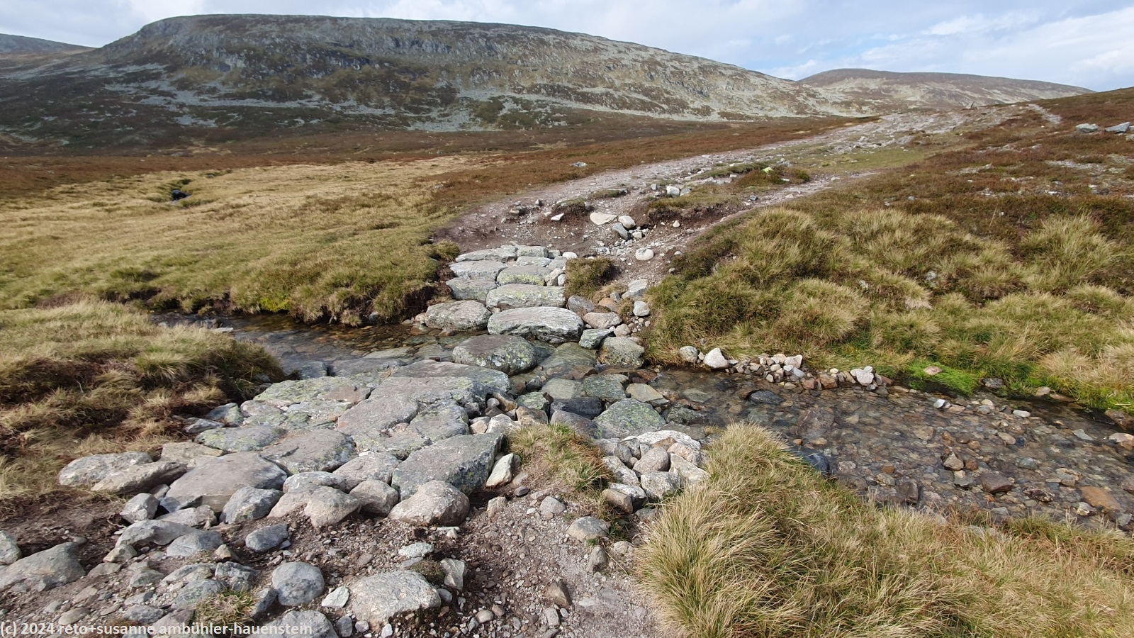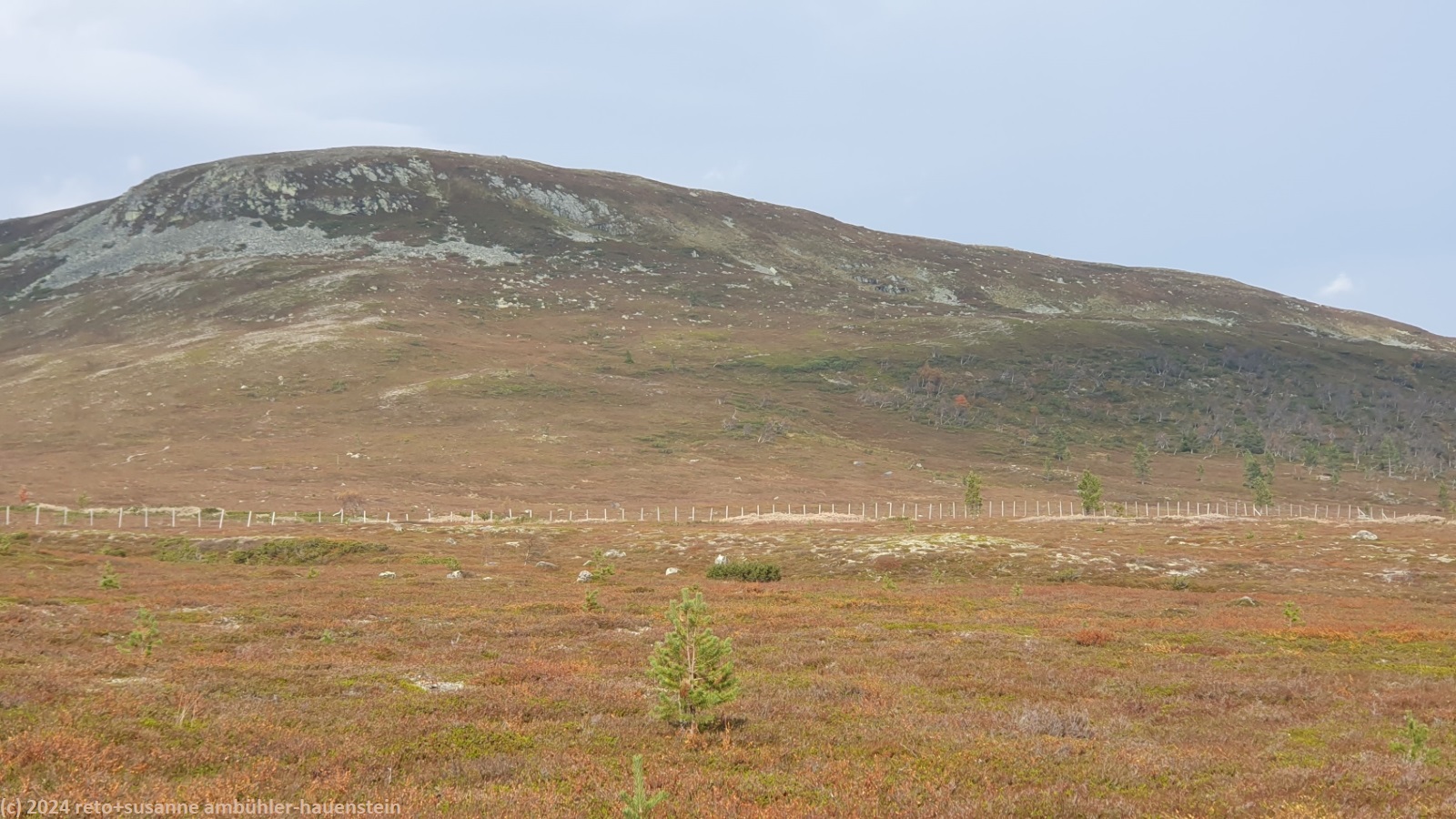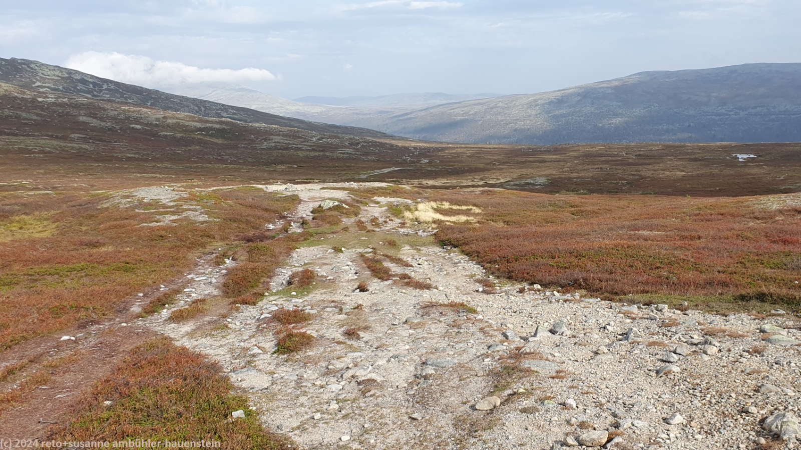 der himmel ist zwar immer noch bewölkt, aber wir sehen nun ab und zu blaue flecken und manchmal sogar für einen kurzen moment die sonne. der weg folgt erst ein kurzes stück dem grøvelåa entlang richtung ryvang, dann geht es südwärts. der pfad steigt nun recht steil an und führt durch einen wunderschönen herbstwald. anfangs geht es über die berüchtigten steine, aber mit dem leichten rucksack geht das viel einfacher. auf etwa 850 m.ü.m erreichen wir die baumgrenze. der weg steigt nun etwas weniger steil an. der wanderweg ist hier nicht ein einziger pfad, sondern es verlaufen mehrere trampelpfade mehr oder weniger parallel neben- und durcheinander. aus der ferne könnte man die wanderwege als strasse interpretieren. während dem aufstieg begegnen wir immer wieder anderen menschen. viele sind tagesausflügler wie wir, andere haben viel gepäck dabei und sind wohl länger unterwegs. auf dem weg zum höchsten punkt bläst uns ein mässiger wind ins gesicht. mit 1065 m.ü.m haben wir ersteren erreicht. nun senkt sich der pfad sanft talwärts. wir würden gerne picknicken, aber das ist gar nicht so einfach. wir befinden uns im femundsmarka nationalpark und entlang des weges hat es immer wieder schilder, dass man den pfad nicht verlassen darf. so direkt am weg essen möchten wir aber auch nicht. schliesslich kommen wir an einem grösseren felsen knapp neben dem weg vorbei, bei diesem rasten wir.