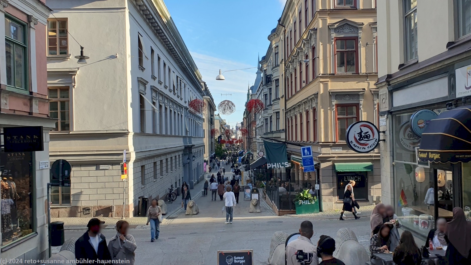 gegen 16 uhr verlassen wir skansen durch einen hinterausgang und spazieren wenig später durch die kungsgatan. in einem schönen cafe trinken wir eine tasse tee. dann geht es weiter zur drottningsgatan. wir schlendern erst bis zu deren nördlichem ende und dann südwärts bis wir am reichstagsgebäude vorbei wieder nach gamla stan kommen. wir spazieren kreuz und quer durch die schmalen gassen und schauen da und dort auf die speisekarte.