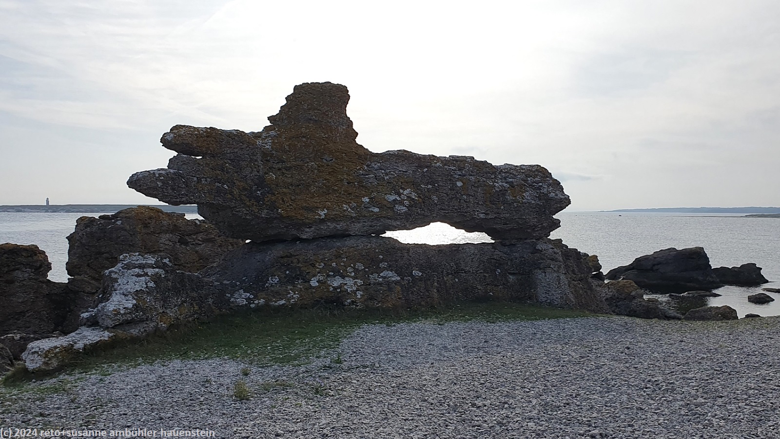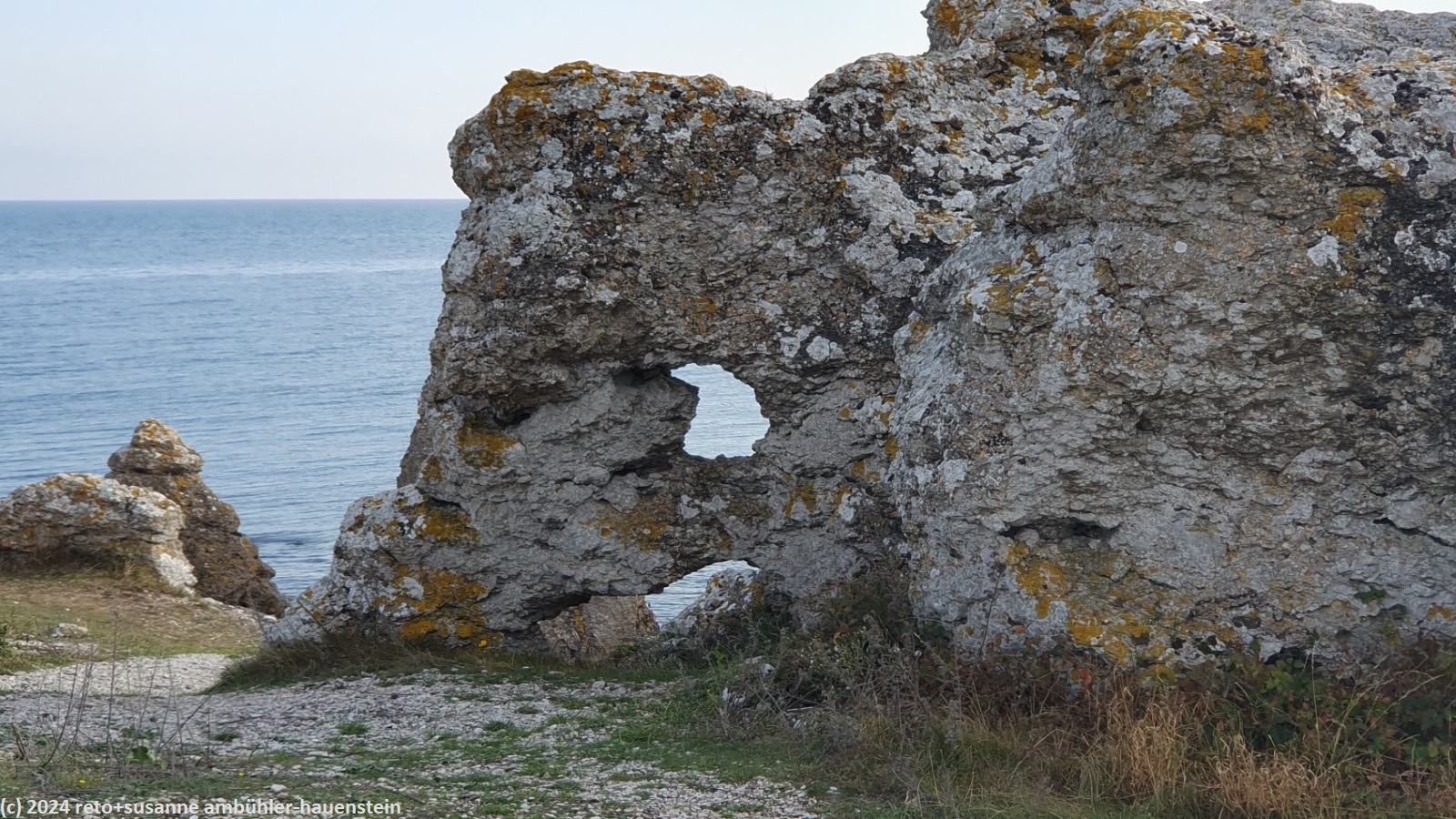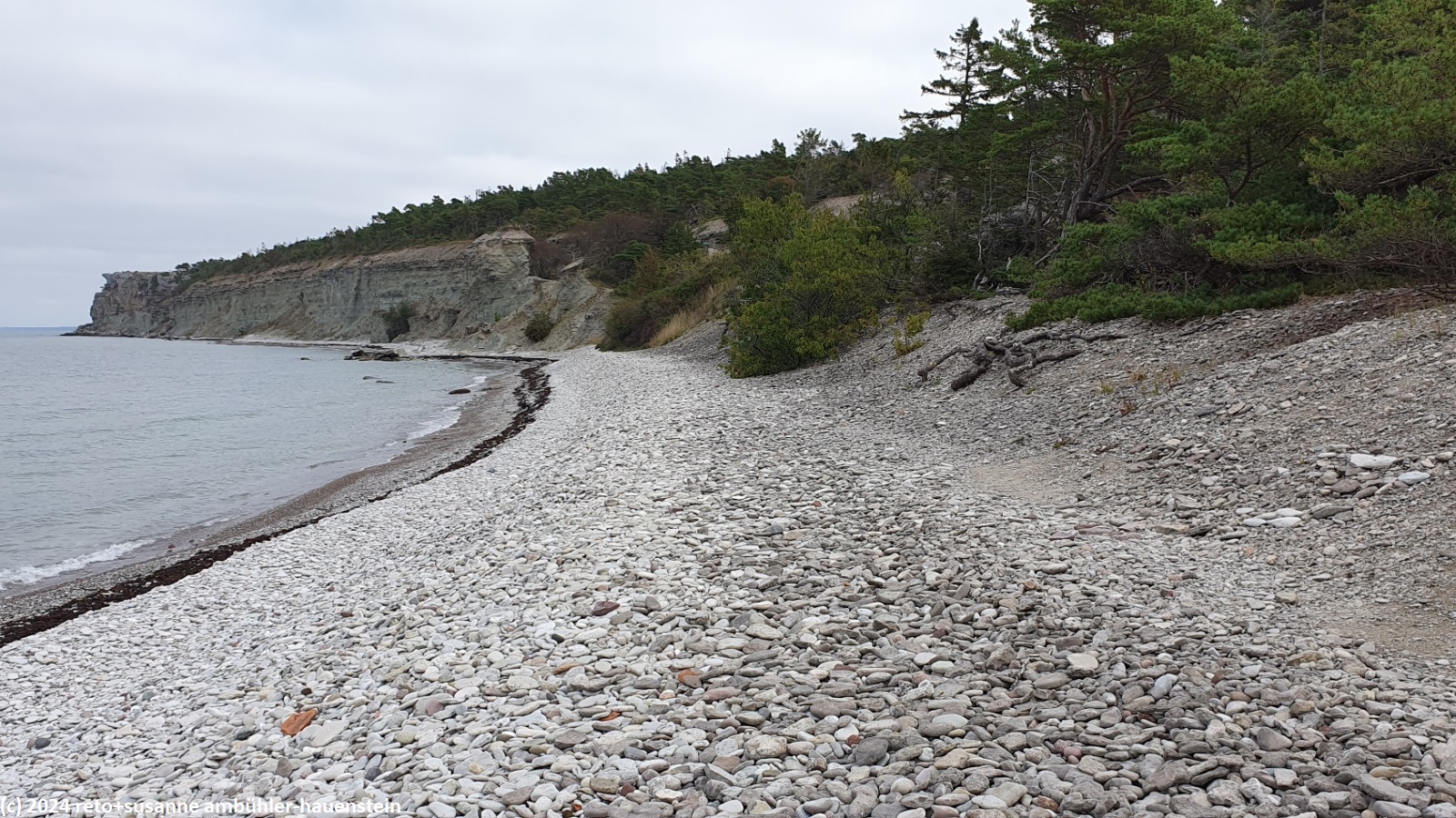 diese bis zu knapp 50 meter hohe steilküste erstreckt sich wenige kilometer südwestlich von visby. ganz in der nähe des parkplatzes befindet sich der höchste punkt der küste. von hier hat man eine tolle aussicht auf den hafen von visby. eine metalltreppe führt auf etwa halbe höhe der steilküste hinab. unter dem höchsten punkt hat es eine höhle. bei manchen ausgesetzten felsen sieht man tiefe risse im boden, da halten wir uns lieber fern. wir folgen dem weg entlang der klippe. dieser senkt sich langsam richtung meereshöhe. nach etwa einem kilometer kommen wir zum wasser hinunter. der strand ist mit rundgeschliffenem kies übersät. allerdings hat es auch angeschwemmte algen, die sehen etwas weniger hübsch aus. ein schmaler pfad führt auf die kante der steilküste hinauf, dann geht es auf dem gleichen weg zurück zum parkplatz.