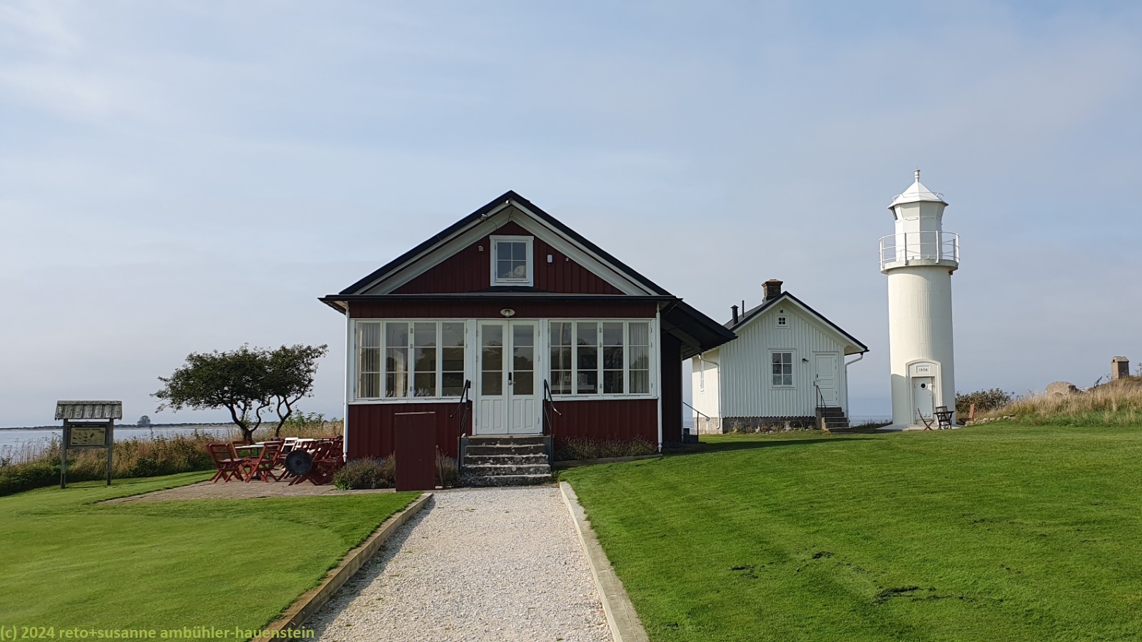 wir kehren zur strasse 140 zurück und folgen dieser südwärts. bei tofta strand gelangen wir wieder an die küste. etwas südlich des ortes soll es einen leuchtturm haben. wir machen deshalb einen kurzen abstecher und enden zu unserer überraschung bei einem golfplatz. am rand des platzes steht tatsächlich ein kleiner leuchtturm. das wetter wird nun zunehmend sonniger. allerdings verschleiert eine dünne wolkenschicht immer wieder die sonne.