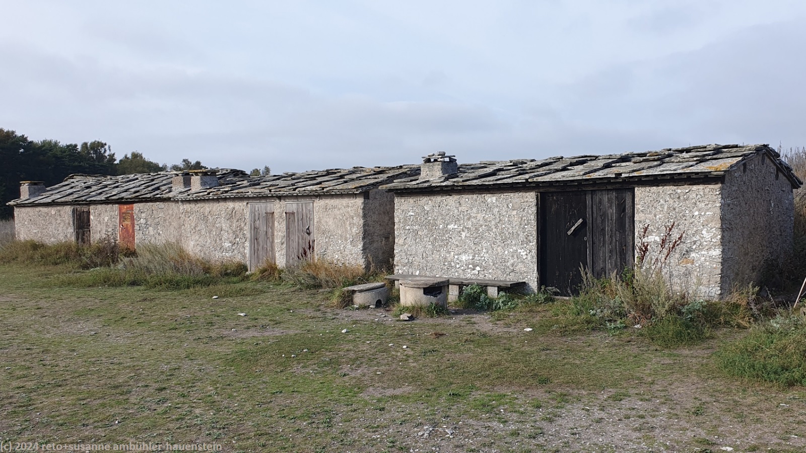 knapp 2 km östlich stossen wir eher überraschend auf eine pension mit einem gartenrestaurant. wir geniessen kaffee und zimtschnecke in der sonne. danach machen wir eine kurzwanderung zur küste und folgen dieser ein stück. auch hier finden wir raukar in verschiedenen formen und grössen. zudem hat es am strand alte fischerhäuser.