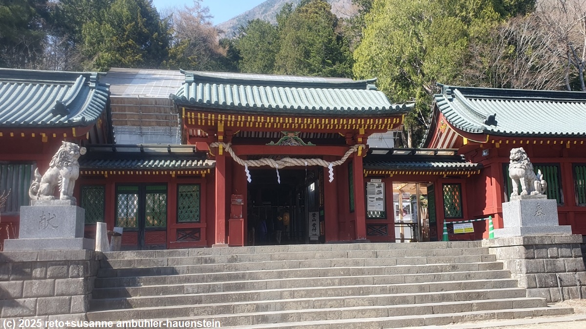 die fahrt ins tal führt über die noch spektakulärere passstrasse 1st iroha-zaka mit noch mehr kehren als auf der hinfahrt. mit bewundernswerter ruhe und präzision steuert der fahrer den bus durch all die spitzkehren. kurz bevor wir die nikko world heritage site erreichen, steigen wir aus. wir machen erst fotos von der shinkyo brücke und erklimmen dann die lange und steile treppe zum rinno tempel hinauf. auch hier wird renoviert. wir umrunden das hauptgebäude und machen einige bilder, dann gehen wir zu fuss zum bahnhof. unterwegs kaufen wir eine kleinigkeit zu essen.