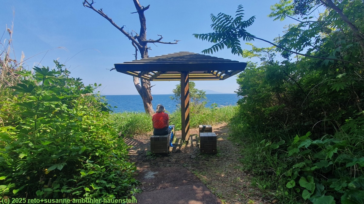 es dauert fast eine halbe stunde, bis wir aus städtischem gebiet herauskommen. später erkennen wir in der ferne die unverwechselbare silouette des fuji. doch noch bevor wir ein foto schiessen können, verschwindet der berg hinter einer bewaldeten bergkette. in atami müssen wir auf einen regionalzug umsteigen. der fahrplan deutet darauf hin, dass nicht der ganze zug bis zum endbahnhof fährt, aber wir können nicht mit sicherheit herausfinden, wo genau der zug allenfalls getrennt wird. da in unserem wagen als endziel ein bahnhof nach der station, bei welcher wir aussteigen wollen, angezeigt wird, gehen wir davon aus, dass es gut kommt. so ist es dann auch. wie geplant erreichen wir den bahnhof jogasaki kaigan um 11:29 uhr. wir verlassen den kleinen bahnhof und marschieren durch den ort bis zum startpunkt des jogasaki coastal trail. dieser folgt der küste südwestwärts bis izukogen. anfangs ist der weg ganz neu gemacht. der belag besteht aus holzschnitzel, welche mit roter farbe fixiert wurden. wir wandern durch einen sehr schönen wald. in diesem ist es äusserst angenehm. zum einen spenden die bäume schatten, zum andern schützen sie uns vor dem lästigen wind. entlang des weges hat es verschiedene attraktionen. wegweiser zeigen richtung und distanz zu den nächstgelegenen attraktionen. die erste attraktion ist die kadowaki hängebrücke, danach folgt der kadowakicape leuchtturm. die wilde küstenlandschaft ist geprägt von dunklem vulkanischem gestein. dieses bildet einen wunderschönen kontrast zum tiefblauen wasser und den weissen schaumkronen. bei einem picknickplatz mit wunderbarer aussicht auf den ozean essen wir zu mittag.
