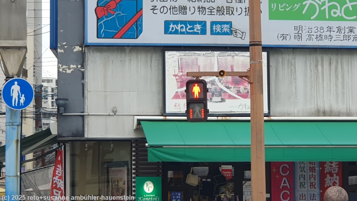 diese nacht schlafen wir beide sehr gut. unglücklicherweise schaltet sich um 7 uhr der wecker in unserem zimmer ein, offenbar hatten die gäste vor uns den alarm nicht abgeschaltet. eine halbe stunde später meldet sich dann unser handy, es ist zeit, aufzustehen. das frühstückbuffet ist etwas weniger umfangreich als in tokyo, dafür hat es frische früchte. alles ist in kleinen mengen in plastikbechern oder plastikfolien eingepackt. selbst mit unserer bescheidenen auswahl produzieren wir beträchtlich viel abfall. dies sind wir uns nicht mehr gewohnt. um 9 uhr verlassen wir das hotel und machen und zu fuss auf den weg zum mount inasa. die ampeln bei den fussgängerstreifen in dieser stadt - und wie wir noch feststellen werden, auch in zahlreichen anderen städten japans - haben ein ganz besonderes merkmal: leuchtbalken zeigen an, wie lange es noch grün bzw. rot ist. damit lässt sich sehr leicht abschätzen, ob man bei grün noch genügend zeit hat, um die strasse zu überqueren, ob man sich beeilen muss, oder ob man besser nicht mehr auf die strasse hinaus tritt. bei rot kann man abschätzen, wie lange man sich noch gedulden muss, bis man die strasse überqueren darf. auch wenn die einzelnen lampen keine bestimmte dauer anzeigen, so ist diese einrichtung doch sehr praktisch.