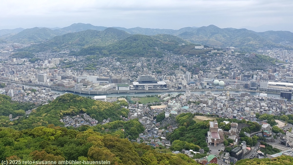 wir stehen um 07:30 uhr auf und frühstücken im hotel. um 9 uhr verlassen wir dieses und machen uns zu fuss auf den weg zum mount inasa, dem hausberg von nagasaki. wir marschieren erst dem fluss urakami-gawa entlang, danach geht es über schmale und stellenweise ziemlich steile wege durch ein wohnquartier. oberhalb der häuser folgen wir der alten bergstrasse, welche allerdings in einem üblen zustand ist. auf dem gipfel des mount inasa geniessen wir vom observatory tower aus die fantastische aussicht auf die stadt nagasaki. danach fahren wir mit der luftseilbahn wieder in die stadt hinunter und marschieren durch die siedlung dejima sowie am seaside park vorbei zum glover garden. wir picknicken auf einer parkbank, danach schlendern wir durch den schönen park und gönnen uns zum schluss ein getränk im teehaus. kurz vor 15 uhr fahren wir mit einer älteren strassenbahn bis zum nakashima-gawa. wir folgen ein stück weit dem fluss und bewundern die steinbrücken. anschliessend marschieren wir am koeizan choshoji tempel vorbei bis zu den hamanomachi arkaden. wir erfrischen uns mit kaffee und früchten, danach kehren wir zum hotel zurück. wir erfahren, dass wir heute zum vierten mal grosseltern geworden sind ! kurz vor 19 uhr marschieren wir noch einmal zu den hamanomachi arkaden und geniessen ein köstliches abendessen. obwohl es auf dem rückweg zum hotel wie aus kübeln giesst, trinken wir noch etwas im nahen starbucks. um 23 uhr sind wir im bett.