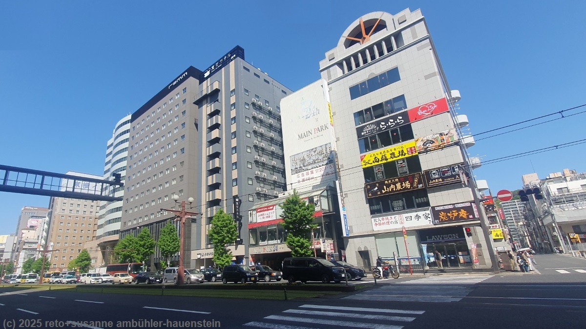 vorallem frauen sind oft mit UV-dichten schirmen unterwegs, damit die haut ja bleich bleibt. nach dem mittagessen setzen wir unsere fahrt fort. wieder geht es erst über eine dicht befahrene landstrasse, dann beginnt erneut ein express highway. dieser führt uns durch eine wunderschöne hügellandschaft. im verlauf der autostrasse - sie ist meistens zweispurig mit ganz wenigen, kurzen, vierspurigen abschnitten - hat es zahlreiche tunnel. die fahrt verläuft äusserst entspannt bis gut 20 km vor dem tagesziel die autostrasse gesperrt ist. unser navi will natürlich immer wieder auf die autobahn zurück und bis es die route umgestellt hat, müssen wir selber schauen. glücklicherweise sind wenigstens die ortsnamen auf den wegweiser auch in unserer schrift angeschrieben. irgendwann finden wir wieder eine zufahrt zur autobahn, aber da steht ein mann der uns aufhält. als ich "kagoshima" sage, meint er "ok" und wir dürfen weiterfahren. nach wenigen hundert metern teilt sich die autobahn. in unsere richtung haben wir freie fahrt, in die andere richtung ist die strasse gesperrt. nun dauert es nicht mehr lange, bis wir bei unserem tagesziel ankommen. die zufahrt zum hotel erweist sich einmal mehr als trickreich. schliesslich stellen wir unseren wagen direkt vor dem hoteleingang auf den gehsteig und erkundigen uns nach einem parkplatz. glücklicherweise ist die einfahrt zum parkhaus gerade neben dem hotel. das parkhaus funktioniert gleich wie in fukuoka, das heisst, wir stellen unser auto auf einen wagen in einem aufzug und dieser verschwindet dann irgendwo im haus. als wir uns im zimmer einrichten bemerke ich, dass ich mein handy im auto habe liegen lassen. mit google translate auf susannes handy frage ich den mann beim parkhaus, ob ich etwas aus dem auto holen kann. er bejaht und holt unseren wagen zur einfahrt. was für ein super service. nun spazieren wir durch die äusserst lebhafte hauptstrasse und trinken in einem cafe einen kaffee bzw. tee. danach kehren wir ins hotel zurück und besuchen das onsen. nach einer kurzen ruhepause im warmen wasser setze ich mich für zwölf minuten in die 90°C heisse sauna. gegen 19 uhr machen wir uns auf die suche nach einem restaurant und finden ziemlich bald ein lokal, in dem es verschiedene varianten von suppe mit nudeln gibt. das essen schmeckt sehr lecker. nach einem kurzen bummel durch die arkaden kehren wir ins hotelzimmer zurück.