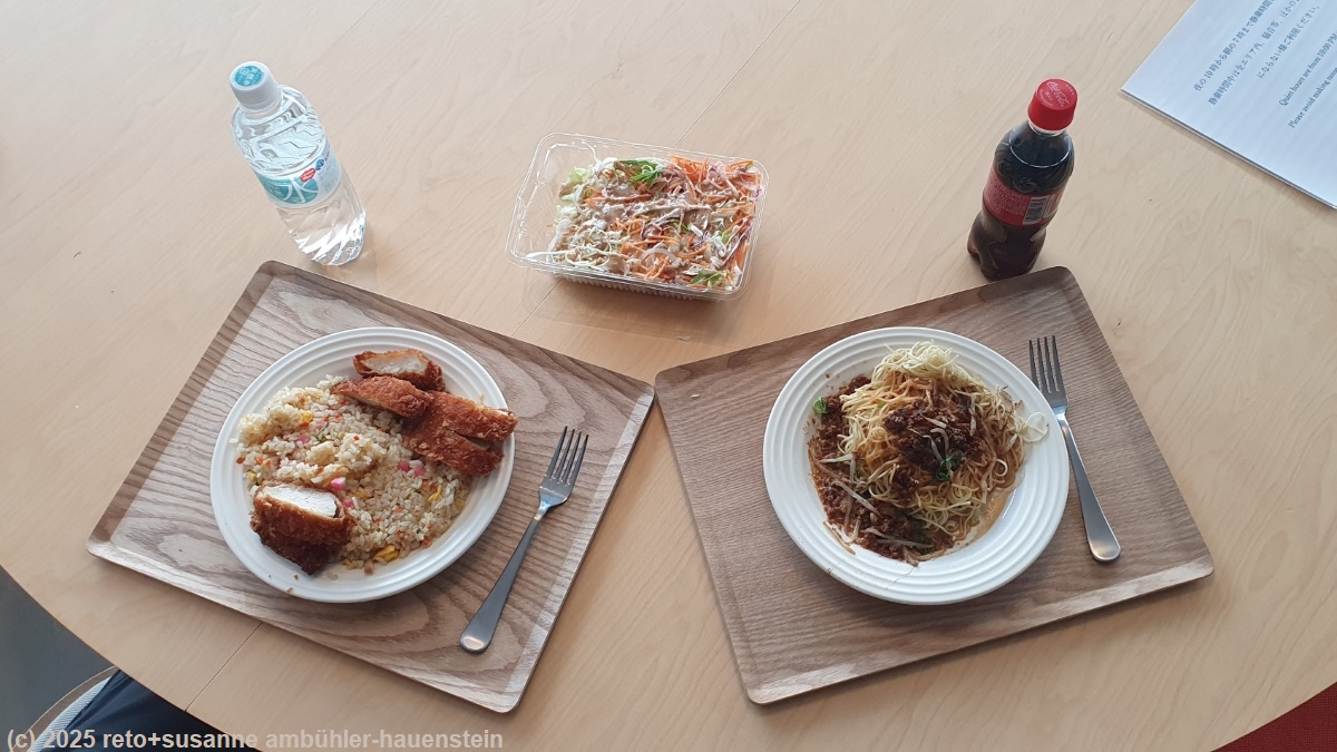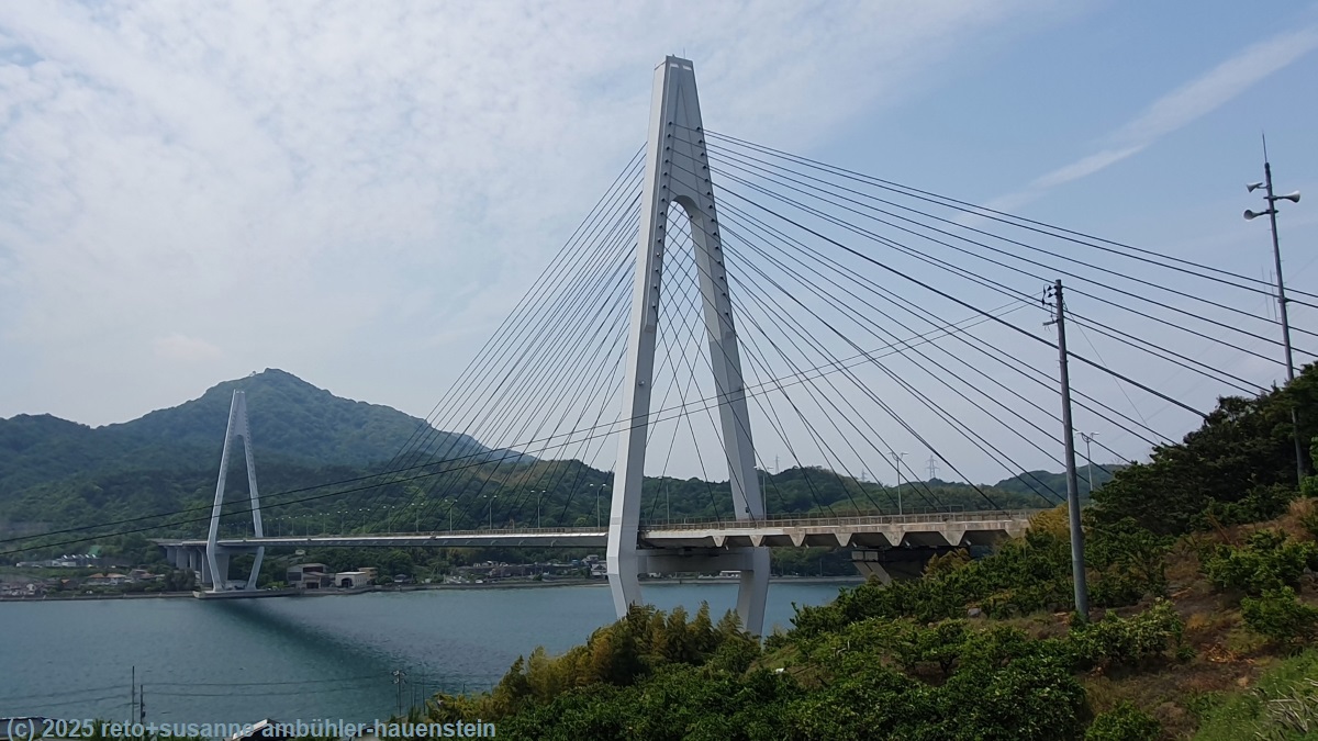 nachdem wir die brücke überquert haben, befinden wir uns auf der insel ikuchijima. auf dieser liegt auch unser tagesziel. wir folgen der nördlichen küste westwärts. neben der eher schmalen landstrasse hat es einen radweg. dieser ist allerdings ziemlich holprig. unsere räder haben keine federung und die reifen sind bretthart, da spürt man jede noch so kleine unebenheit. kurz nach 12:30 uhr bemerken wir etwas überrascht, dass wir nur noch 4 km vom tagesziel entfernt sind. wir wollten eigentlich unterwegs zu mittag essen, aber das hat sich gerade erübrigt. kurz vor 13 uhr sind wir beim hotel bonapool. wir werden freundlich empfangen, das zimmer ist jedoch noch nicht bezugsbereit. wir dürfen aber susannes rucksack hier deponieren. auf einem fotopunkt gerade neben dem hotel essen wir zu mittag. danach radeln wir ins ortszentrum um für heute abend und morgen lebensmittel einzukaufen. auf dem weg zum supermarkt kommen wir an einer autowerkstatt vorbei. durch das offenstehende garagentor sehe ich werkzeug herumliegen. während unserer heutigen radtour haben wir bemerkt, dass die sättel unserer fahrräder etwas zu tief eingestellt sind. mit hilfe der übersetzungsapp frage ich den mann im büro, ob wir uns einen imbuss-schlüssel ausleihen dürfen. er meint, wir sollen uns in der werkstatt nehmen, was wir brauchen. schon bald haben unsere sättel die richtige höhe, das ist toll. im lebensmittelgeschäft kaufen wir zwei menus, die wir heute abend im hotel in der mikrowelle zubereiten können. nach dem einkaufen fahren wir zum fluss setodasuido und finden an dessen ufer ein heimeliges cafe. kurz vor 15:45 uhr sind wir wieder beim hotel. nun ist das zimmer bezugsbereit. die dame am empfang gibt uns endlose anweisungen, von denen wir nur einen bruchteil verstehen. unser zimmer ist, wie das ganze hotel, sehr schön. ein film im eingangsbereich zeigt im zeitraffer die errichtung dieses gebäudes. es wurde erst vor etwas mehr als einem jahr fertiggestellt. die sanitäranlagen sind wunderschön. wir geniessen eine erfrischende dusche, danach liest susanne, ich führe die bücher nach. draussen wird das wetter immer sonniger, morgen wird ein schöner, aber sehr warmer tag. gegen 18 uhr gehen wir in die küche und bereiten in der mikrowelle das nachtessen zu. dieses schmeckt überraschend gut.