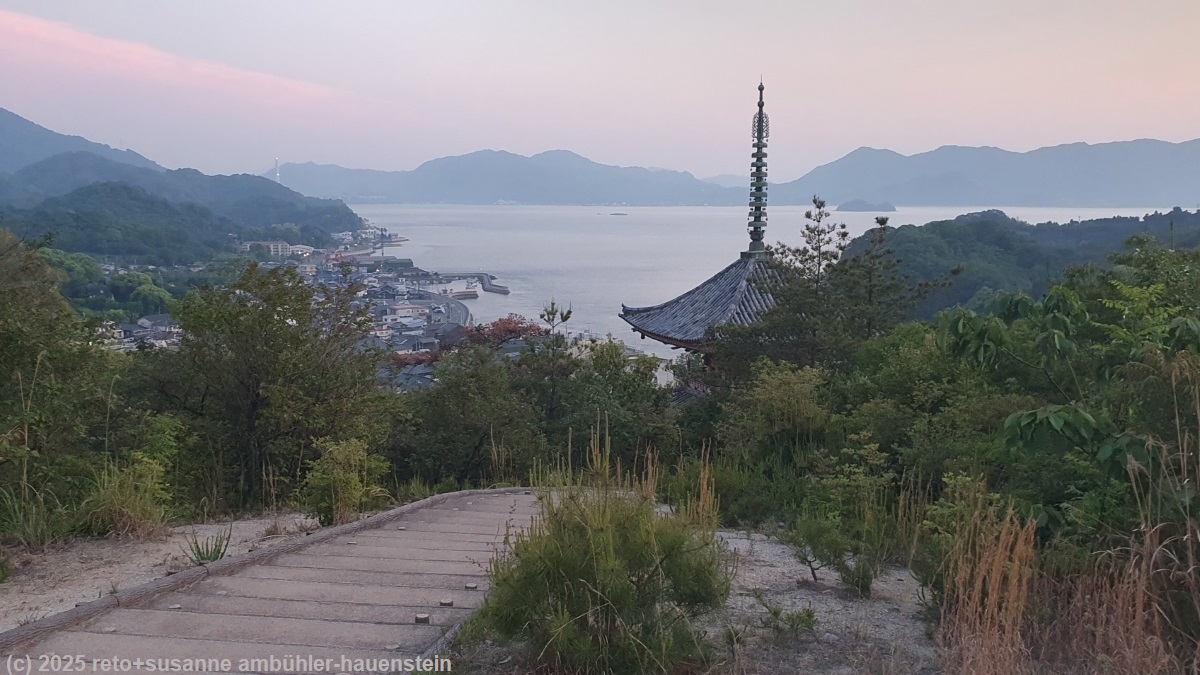 da es ein sehr schöner abend ist - die wolken haben sich weitgehend verzogen - machen wir noch einen kurzen spaziergang zum nahen kojoji tempel. dieser steht auf einer kleinen anhöhe, der aufstieg führt wieder einmal über steile treppen. hinter dem tempel haben wir vom höchsten punkt des hügels eine tolle rundsicht. auf dem rückweg gelangen wir auf die brücke über den setodasuido, welche man von unserem hotel aus sieht.