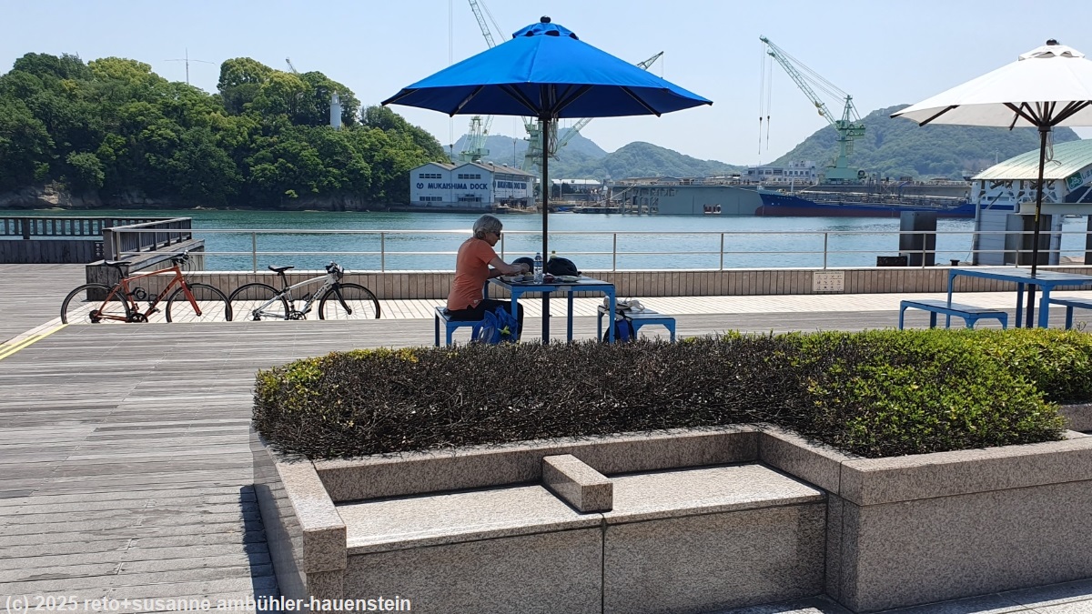 gerade beim hafen hat es gedeckte tische mit bänken. hier ist es angenehm schattig. wir geniessen ein köstliches birchermüesli mit frischen erdbeeren. danach bringen wir die räder zurück und deponieren susannes rucksack im hotel cycle. im bahnhof von onomichi möchten wir unseren voucher für den setouchi area pass einlösen. der äusserst freundliche beamte am schalter meint mit grösstem bedauern, dass dies in diesem kleinen bahnhof leider nicht möglich sei. der nächstgelegene bahnhof in unserer reiserichtung, in dem wir den voucher eintauschen können, ist okayama. da haben wir schon wieder nicht aufgepasst. später im hotel sehe ich, dass auf dem voucher eine website angegeben ist mit einer liste der stationen, bei welchen wir den voucher eintauschen können. wir hätten das in hiroshima tun sollen. nun müssen wir halt fahrkarten von onomichi nach okayama lösen und dort unseren voucher eintauschen. merke: JR voucher sind etwas heimtükisch, man sollte im voraus prüfen, wo man sie einlösen kann ! im ort ist es inzwischen heiss geworden. wir schlendern durch die gedeckte hauptstrasse, dort ist es deutlich kühler. später setzen wir uns auf eine schattige bank im stadtpark direkt am wasser.