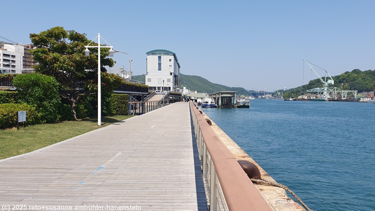 unser handy weckt uns um 6 uhr. draussen ist es bereits hell. es kündigt sich ein weiterer sonniger tag an. pünktlich um 06:30 uhr sind wir im restaurant um zu frühstücken. es gibt zwar müesli, aber keine früchte. wir werden trotzdem satt. ich gönne mir als jux ein paar pommes frites. kurz nach 07:15 uhr verlassen wir das hotel. unser navi führt uns auf einer anderen route zum hafen, als wir gestern gekommen sind. obwohl wir auf hauptstrassen fahren, hat es wenig verkehr, aber viele ampeln. am hafen hilft uns die selbe freundliche dame wie gestern, die fahrkarten am automaten zu beziehen. sie zeigt uns auch, bei welchem pier wir warten müssen. das personal im dienstleistungssektor ist auch in japan äusserst hilfsbereit und freundlich. wir haben das auch schon bei unseren reisen in die skandinavischen länder bemerkt: egal wie zurückhalten bis leicht mürrisch die menschen im allgemeinen sein mögen, die leute, die im dienstleistungsbereich arbeiten, sind fast immer sehr nett. das boot legt gerade im hafen an, wir müssen uns aber noch zehn minuten gedulden, bis wir an bord gehen dürfen. es sind bloss eine handvoll fahrgäste unterwegs. wir verlassen imabari auf die sekunde genau. wie in neuseeland gilt auch in japan: pünktlich sein ist zu spät. noch einmal haben wir einen schönen blick auf die über 4 km lange hängebrücke kurushimakaikyo-ohashi zwischen den inseln shikoku und ohshima. die überfahrt nach habu dauert 80 minuten und verläuft äusserst ruhig. die erste und die letzte zwischenstation lässt unser boot aus, offenbar will niemand ein- oder aussteigen. bei den übrigen zwischenhalten steigen passagiere ein und aus.