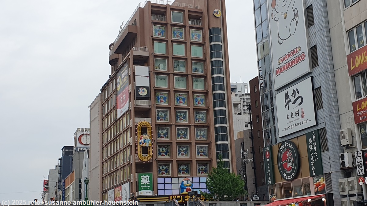 die fahrt mit dem shinkansen "hikari 574" von himeji nach shin-osaka dauert 29 minuten. shin-osaka ist der bahnhof der hochgeschwindigkeitszüge. von hier gelangen wir mit einem lokalzug zum hauptbahnhof. unser hotel ist mehr als 2 km von diesem entfernt. wir versuchen deshalb mit der metro näher zum hotel zu kommen. anfangs tun wir uns schwer, die richtige linie zu finden, denn auf unseren karten fehlen die nummern der stationen. als wir dann endlich einen brauchbaren plan des u-bahnnetzes finden, klappt es mit der anfahrt. diese wird dadurch verkompliziert, dass wir drei verschiedene linien nehmen müssen. mit viel intuition und etwas glück gelangen wir bis auf 150 meter an unser hotel, näher gehts nicht mehr. wir deponieren das gepäck im hotel, dann fahren wir mit der metro drei stationen südwärts. wir spazieren dem dotonbori river entlang. dieser fluss geht mitten durch das lebhafte stadtviertel dotonbori. auf dem wasser verkehren boote voll mit touristen. überhaupt hat es hier enorm viele leute. wir spazieren dem fluss entlang bis zur konzerthalle namba hatch. hier finden wir einen kleinen park - genau genommen ist es ein platz mit etwas grün darum herum und einigen sitzbänken. auf einer solchen picknicken wir. danach spazieren wir durch die dotonbori strasse wieder zurück. google map schreibt zu dieser verkehrsfreien strasse "as busy as it gets", besser kann man es wohl nicht beschreiben. es hat unglaublich viele leute aus allen herren länder. ob das immer so ist, oder ob das an der weltausstellung liegt, wissen wir natürlich nicht. in einem starbucks trinken wir einen kaffee. aus dem ersten stock haben wir eine tolle aussicht auf die belebte strasse.