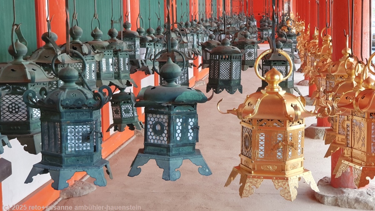wenig später erreichen wir den tempel kasuga taisha. diese anlage befindet sich wieder in einem dichten wald. bei einem der gebäude hat es duzende von laternen, manche sind aus gold, das sieht toll aus.