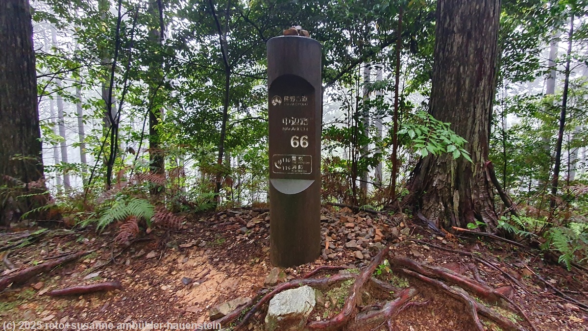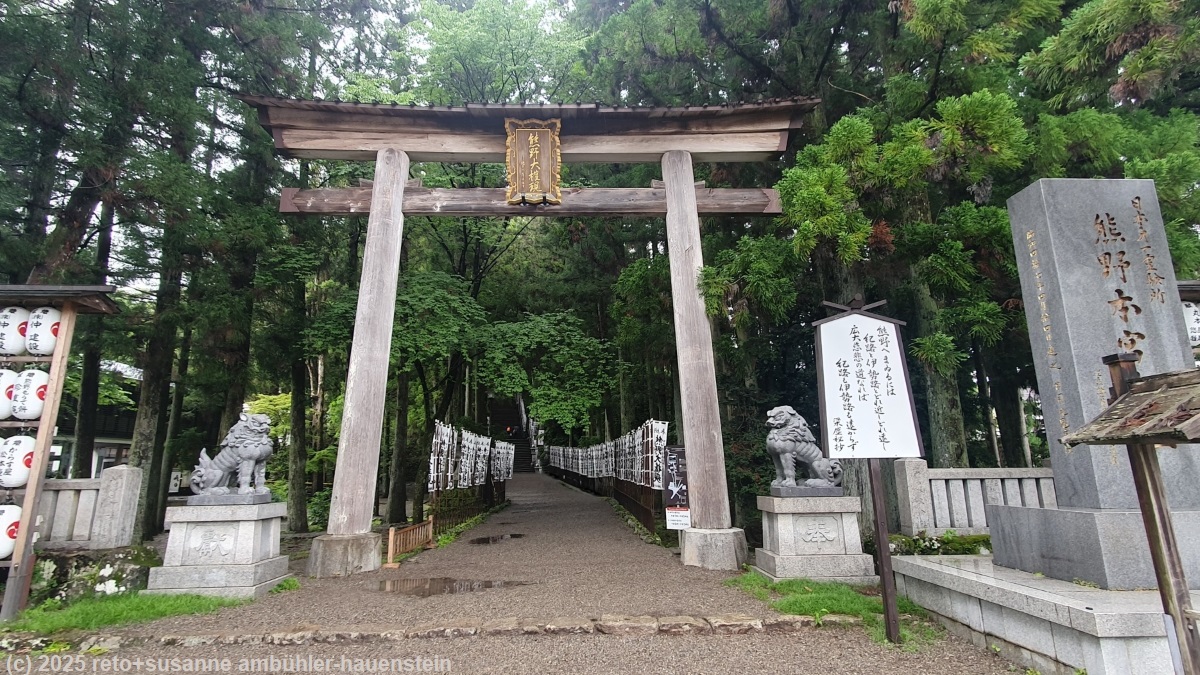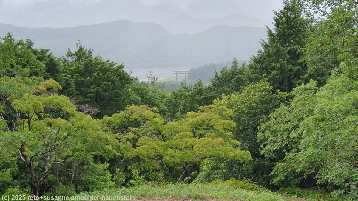 unser handy weckt uns um 7 uhr. das frühstücksbuffet ist ziemlich bescheiden und entspricht der beschreibung "light breakfast" ziemlich gut. so hat es kein müesli, aber immerhin croissants, margarine und konfitüre. gegen 8 uhr verlassen wir das hotel. als wir bei der bushaltestelle neben dem bahnhof eintreffen, warten schon erstaunlich viele leute auf den bus, der uns in die berge bringen soll. irgendwann bemerken wir, dass hier zwei busse unterschiedlicher linien kurz hintereinander abfahren. die grössere gruppe der wartenden steigt in den ersten bus, wir nehmen den zweiten, der deutlich weiter in die hügellandschaft fährt. gegen 08:40 uhr geht es los. beim einsteigen muss man einen kleinen zettel aus dem automaten neben der türe nehmen. auf diesem hat es eine nummer, diese bezeichnet die haltestelle, bei der man eingestiegen ist. auf einem bildschirm vorne im bus wird laufend angezeigt, welchen fahrpreis man für welche nummer bezahlen muss. logischerweise steigt der preis bei jeder haltestelle um einige yen. es steht im bus angeschrieben, dass man beim aussteigen dem fahrer das ticket und den genauen betrag übergeben muss. man könne aber vorher wechseln. das klingt irgendwie kompliziert. auf einem plakat steht aber auch, man könne den QR-code fotografieren und den fahrpreis mit einer app bezahlen. es gibt eine ganze liste von apps, die akzeptiert werden. ich versuche während der fahrt eine app nach der anderen zu installieren. die benutzerschnittstelle der ersten app ist nur japanisch, das ist wenig hilfreich. die zweite app installiert nicht richtig. die dritte scheint zu funktionieren. die texte werden sogar auf deutsch angezeigt und ich kann meine kreditkarte hinterlegen, aber als ich den fahrpreis bezahlen will, reklamiert die app stehts, dass sie meinen namen kennen müsse. da ich nicht herausfinde, wo ich meinen namen eintragen muss, gebe ich schliesslich auf und wir beschliessen, am ziel bar zu bezahlen. die fahrt führt über eine schmale und kurvenreiche strasse mitten in eine schöne hügellandschaft hinein. mit einigen minuten verspätung erreichen wir hongu taisha-mae. die meisten passagiere steigen hier aus. das bezahlen des fahrpreises entpuppt sich als kleines drama. es dauert ewig, bis wir endlich bezahlen und aussteigen dürfen. und von wegen "exact fare": der buschauffeur nimmt unsere JPY 4500 entgegen und gibt JPY 300 wechselgeld. manchmal scheint mir, es wäre einfacher, man würde nicht so viele regeln publizieren und einfach so handeln, wie es die situation erfordert. bis die letzten passagiere aus dem bus ausgestiegen sind, hätte der nächste bus längst fahren sollen. mit diesem fahren wir nach hosshinmon-oji, dem startpunkt unserer wanderung. das drama beim bezahlen der fahrkosten wiederholt sich in diesem bus, aber schliesslich sind alle ausgestiegen. als wir am morgen tanabe verliessen, schien sich die wolkendecke aufzulockern, wir sahen viel blauen himmel. nun aber hangen graue wolken tief in den hügeln und es fällt ein leichter nieselregen. wir ziehen die regenjacken über und machen uns auf den weg. wir wandern über ein stück des "kumano kodo" einem pilgerweg, auf dem man auch mehrtageswanderungen machen kann. anfangs geht es über eine asphaltierte strasse, dann ist der weg mit steinplatten belegt und schliesslich wird der pfad zu einem richtigen wanderweg. wir gehen durch einen üppigen wald. es ist sehr warm und extrem feucht, über dem wald liegen dampfwolken. es fühlt sich an, als würden wir durch einen tropischen regenwald marschieren. nach 3.4 km treffen wir auf fushiogami-oji, eine art kiosk mit tischen, die unter einem dach vor dem regen geschützt sind. es ist schon bald mittag. picknicken können wir hier nicht, aber wir erfrischen uns mit einem orangensaft. dazu kaufe ich einen sack mit gebäck. dieses schmeckt wie magenbrot, sehr köstlich. auf dem weiteren weg nimmt der regen zu. mir wird es in der regenjacke zu warm und so verstaue ich diese im rucksack und schütze mich stattdessen mit dem schirm vor dem regen. kurz nach der hälfte des weges hat es einen aussichtspunkt etwas abseits des pfades. wir machen den kleinen umweg. wegen dem trüben wetter ist die aussicht limitiert. immerhin sehen wir das grosse tor unten im tal. kurz vor 13:15 uhr sind wir wieder in hongu, da wo wir den bus gewechselt hatten.